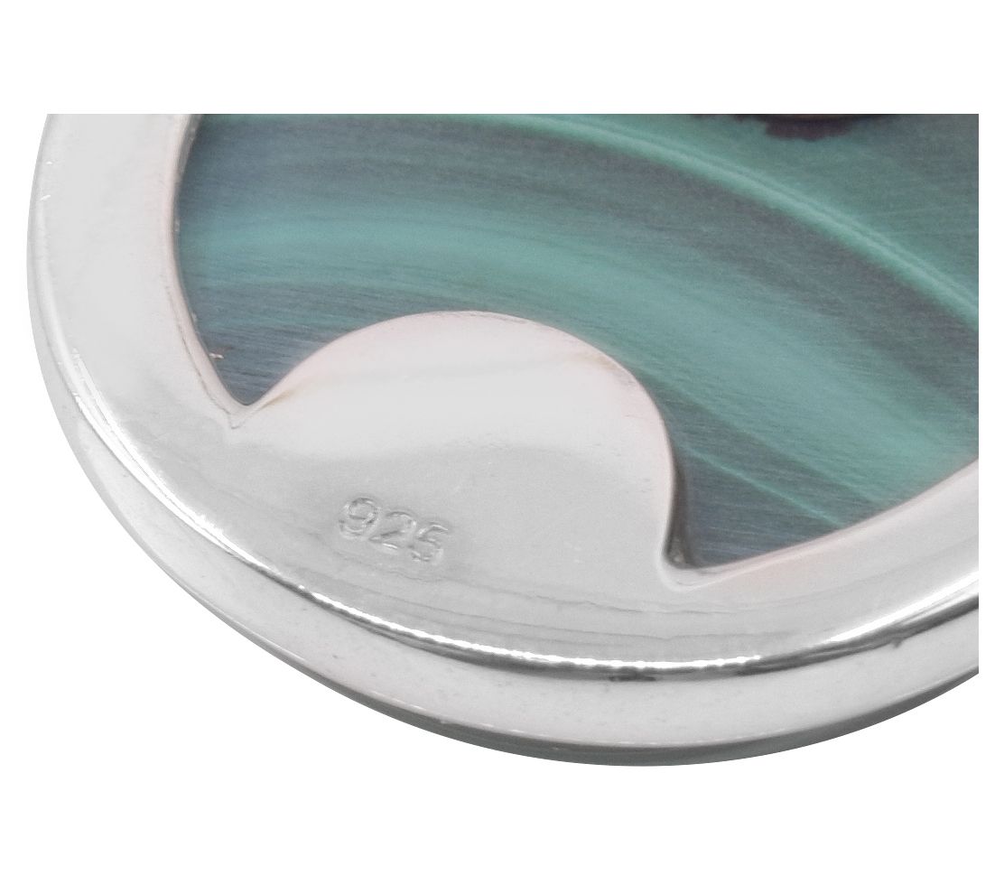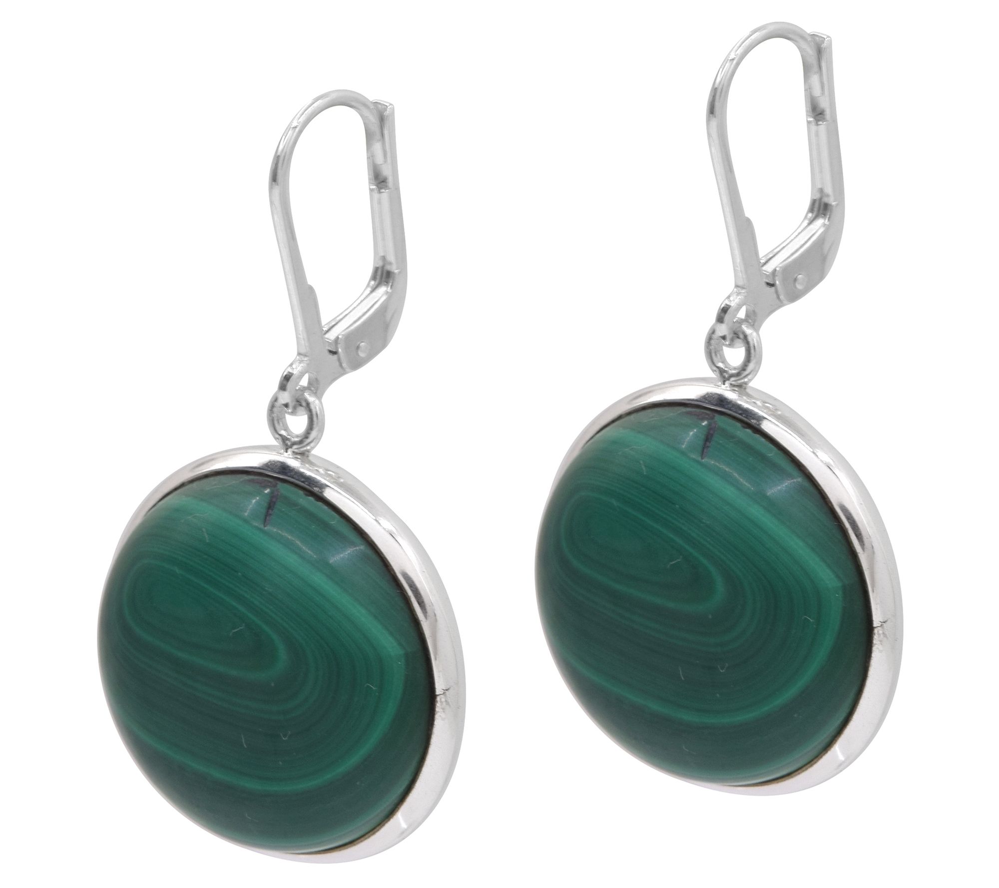 • Dangle earrings with round-cut bezel-set malachite cabochon; polished finish