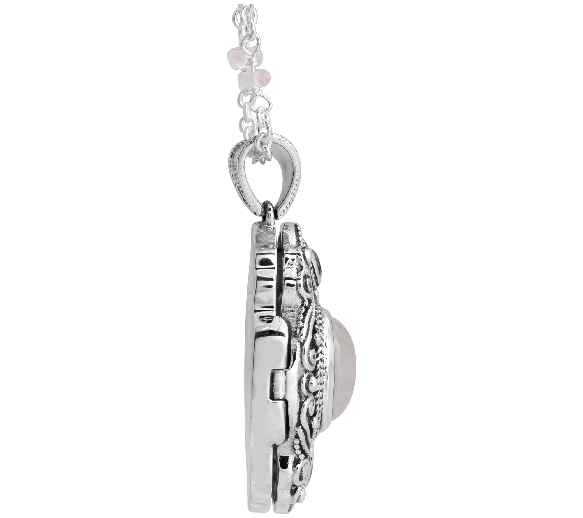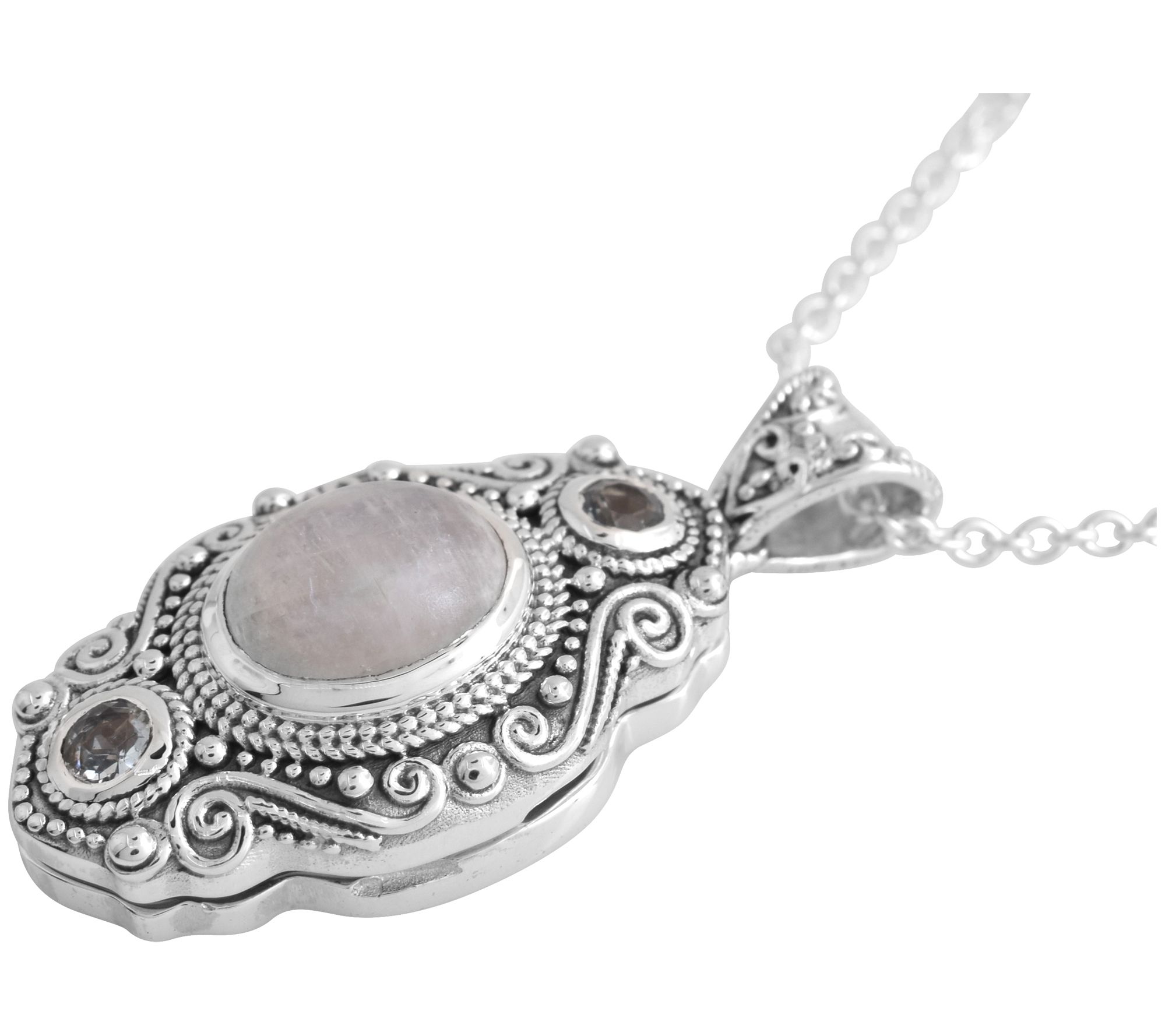 • Oblong pendant with scrollwork detailing; bezel-set moonstone cabochon; round-cut, bezel=set blue topaz; faceted roundel beads; oval-link chain