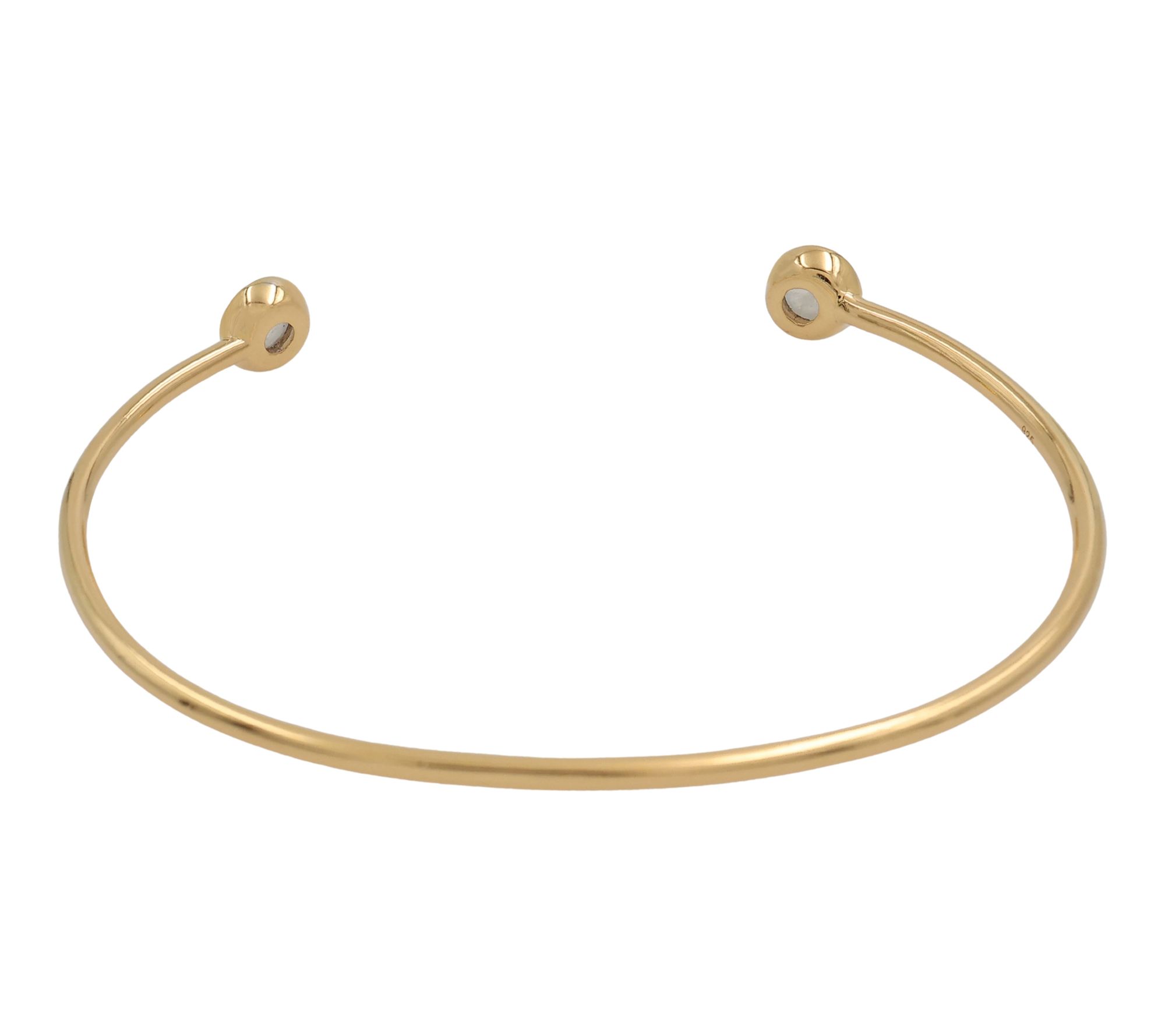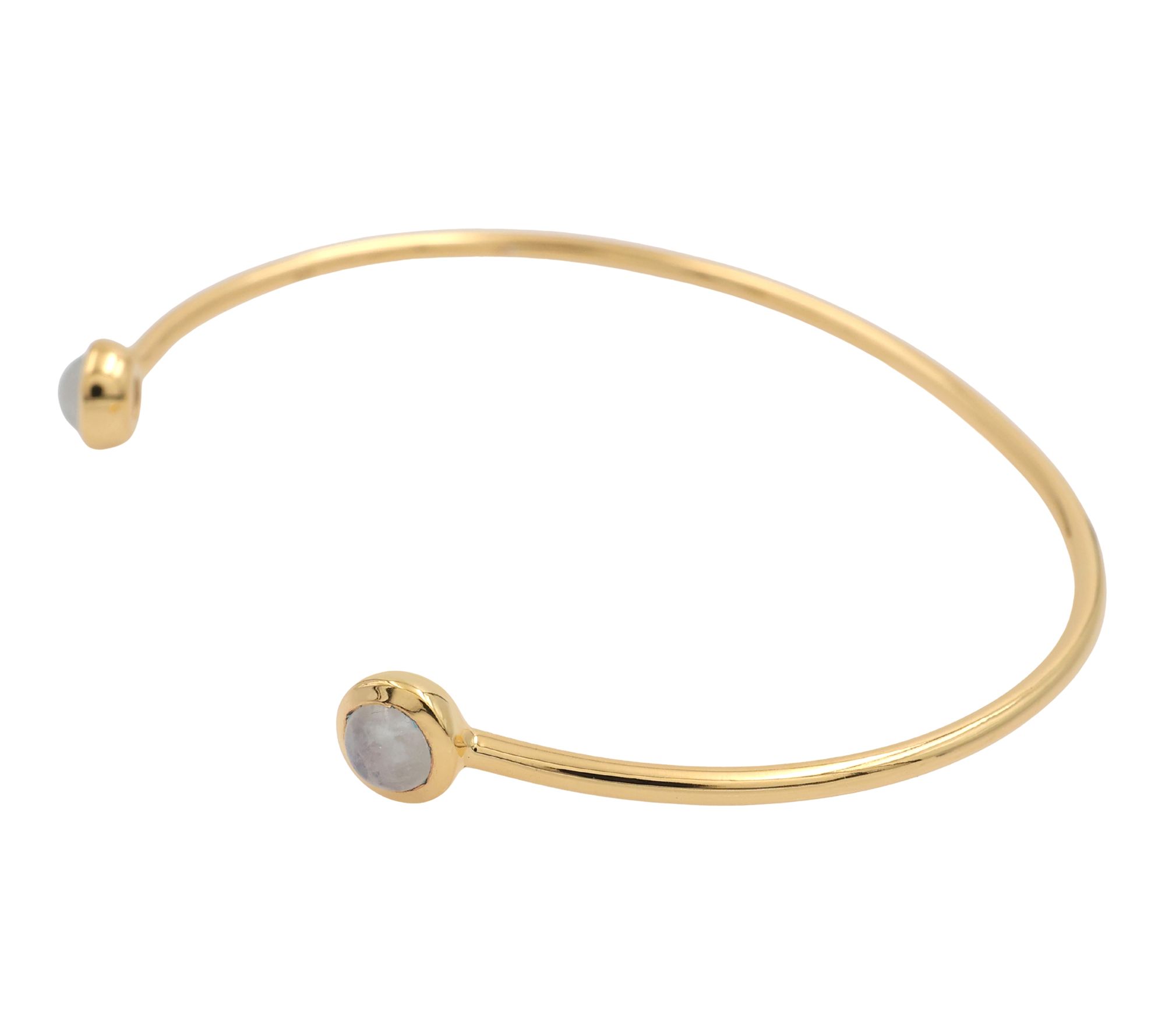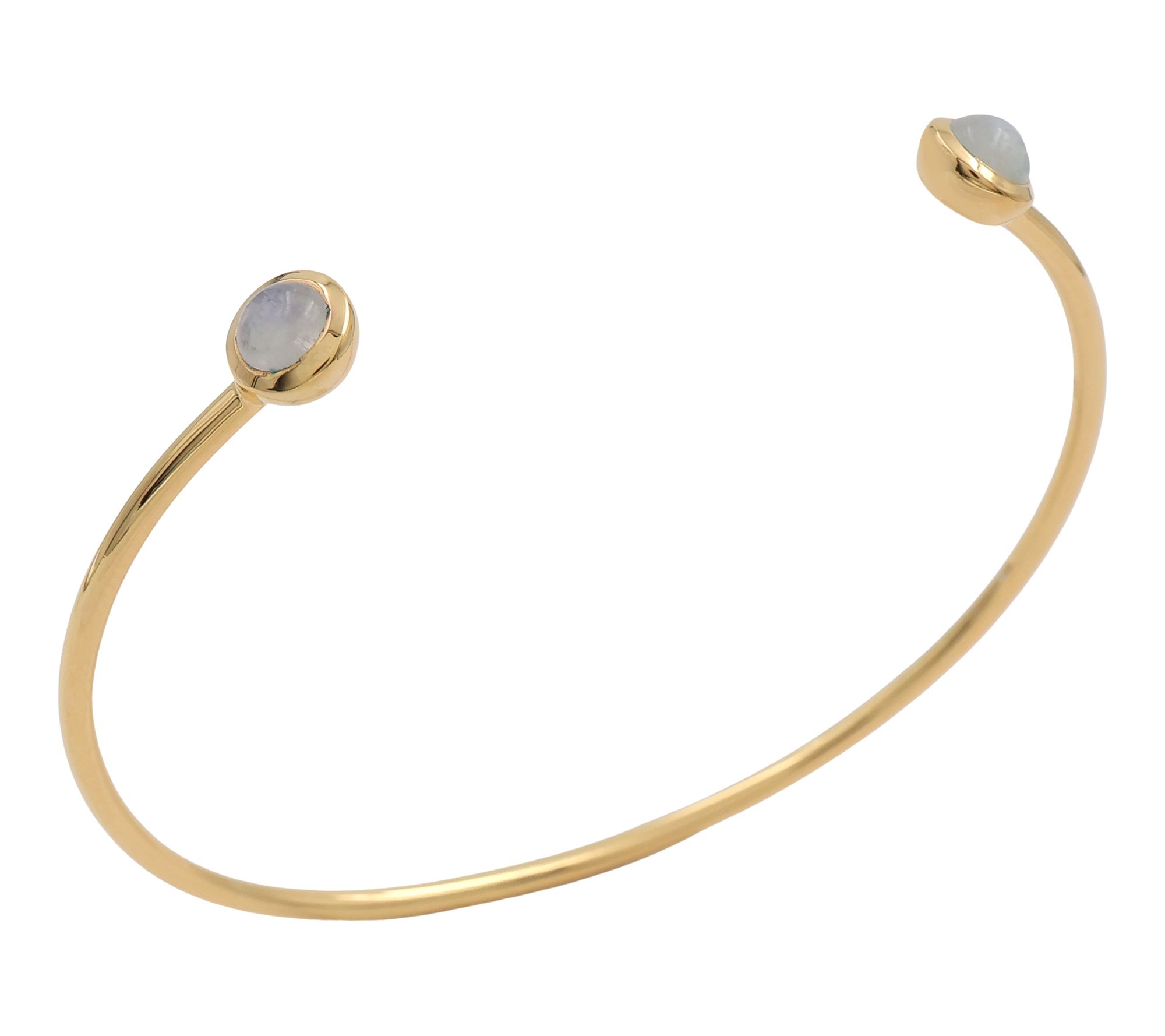 A luminous moonstone bangle adds a little drama to your jewelry box -- whether peeking out from a blouse cuff at brunch or shining solo at a summer soiree. This stunning bracelet showcases gleaming 14K gold-plated details and round cabochon rainbow moonstones that add enchanting iridescence to every gesture. From Affinity® Gems.