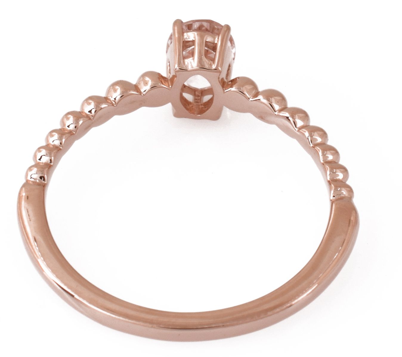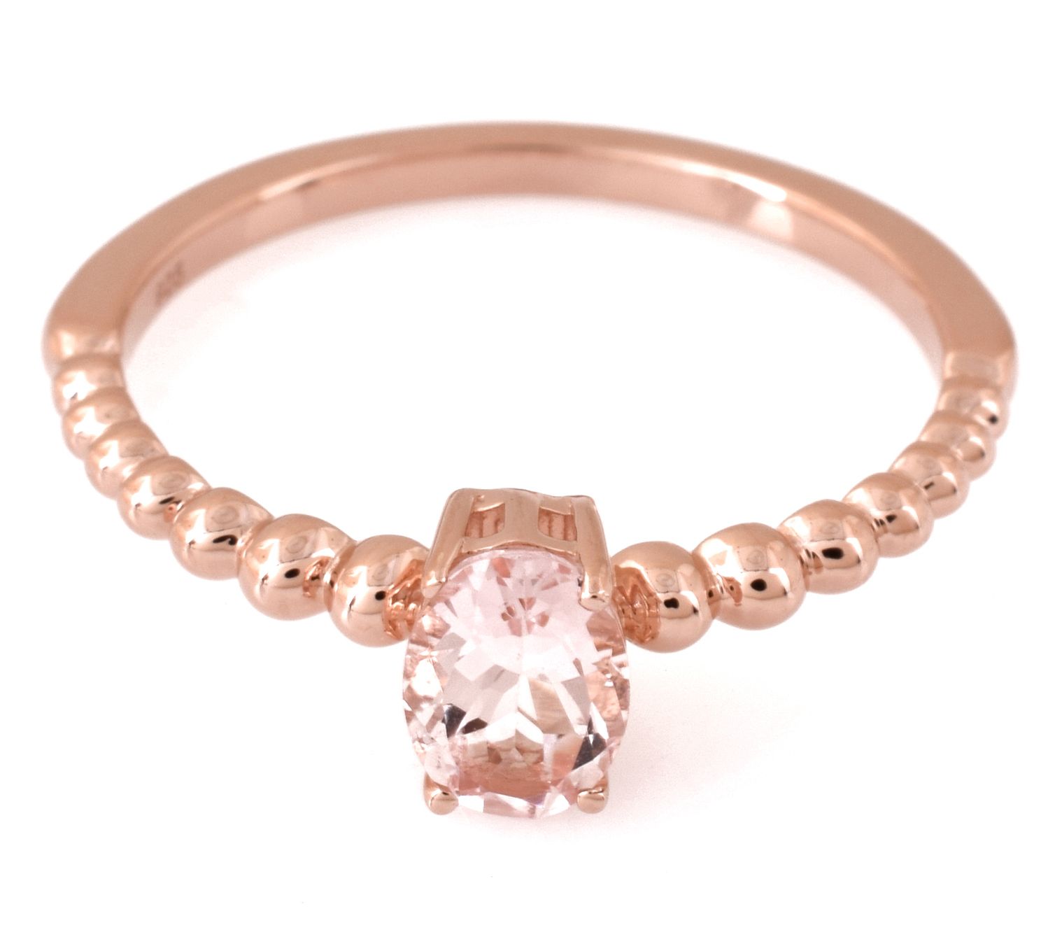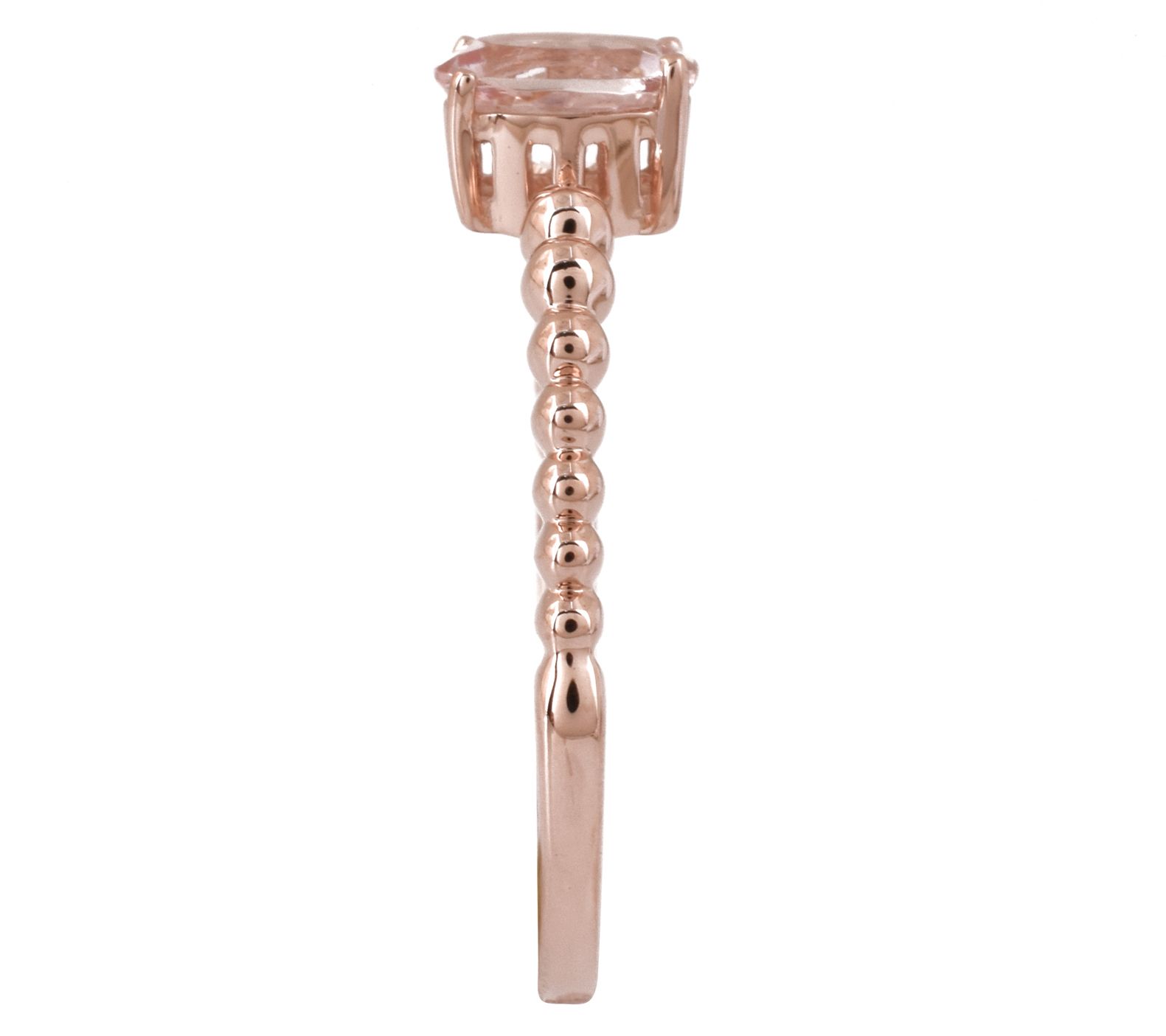 Solitaire ring with beaded texture and oval-cut, prong-set morganite center stone