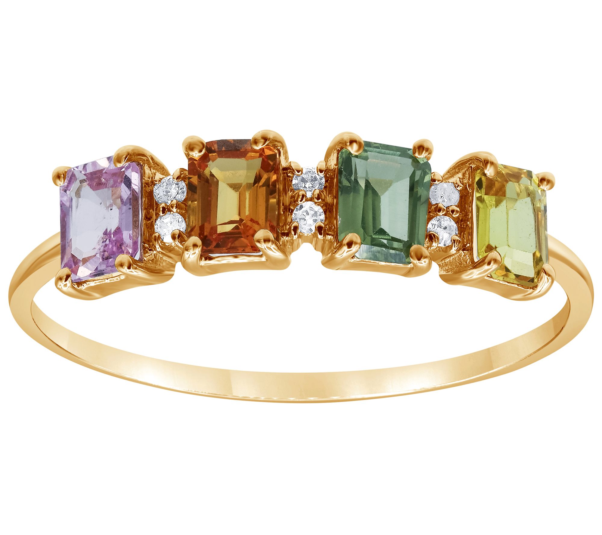 Illuminate your look with this radiant ring set in lustrous 14K yellow gold. It features a captivating array of emerald-cut sapphires in varying hues, each complemented by sparkling diamond accents. Perfect for elevating any outfit, it's a testament to elegance and sophistication. From Affinity Gems.