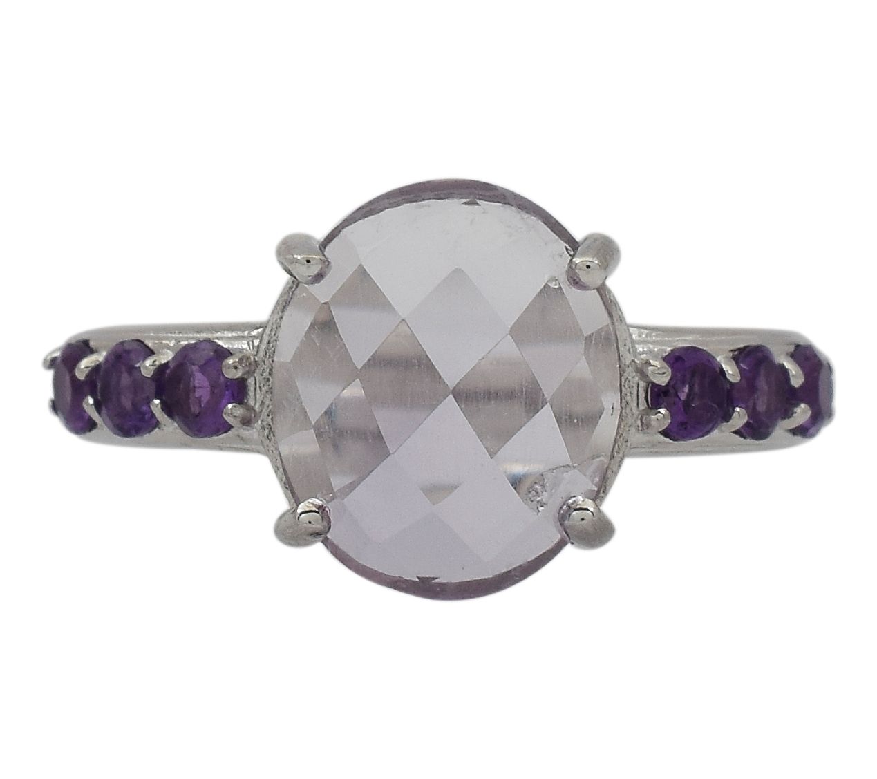 • Checkerboard oval-cut solitaire gemstone; round gemstones accented on sides