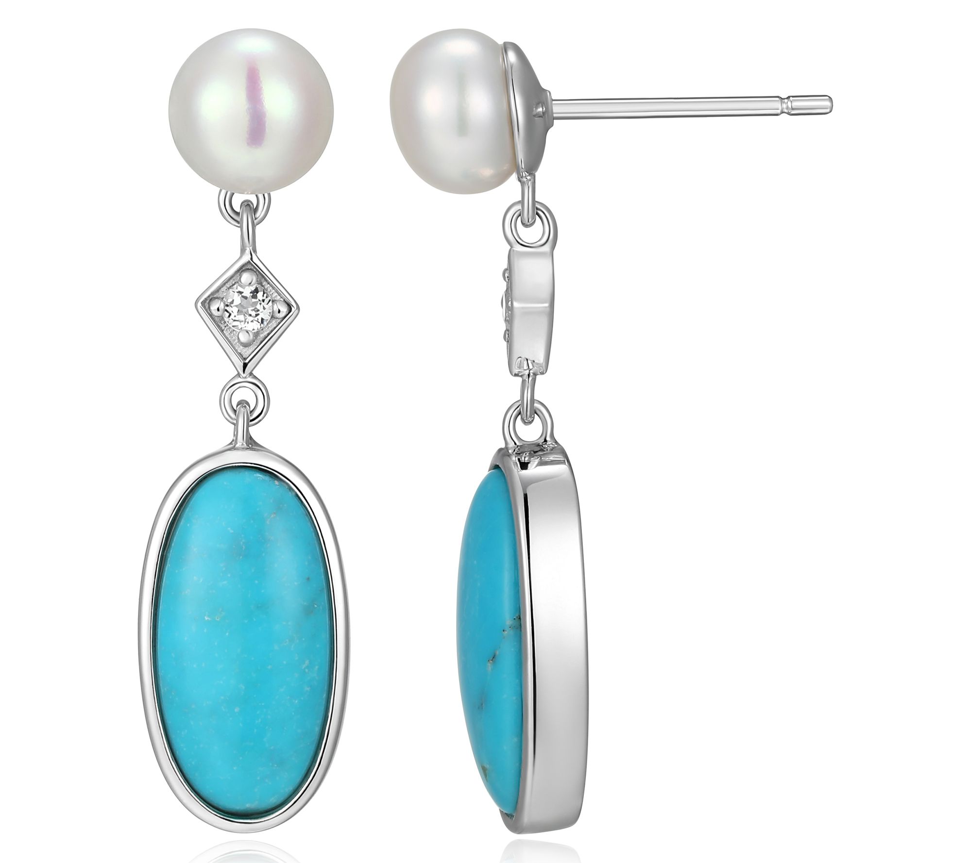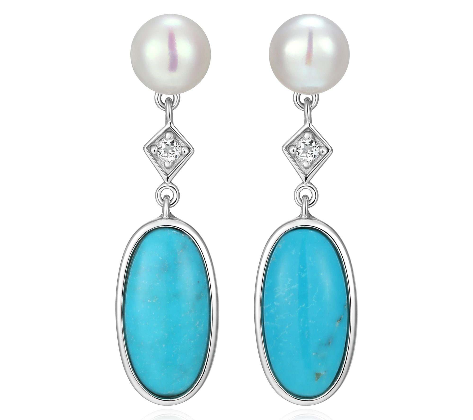 - Cultured freshwater pearl; drop design of oval-shaped stabilized turquoise and white topaz accent
