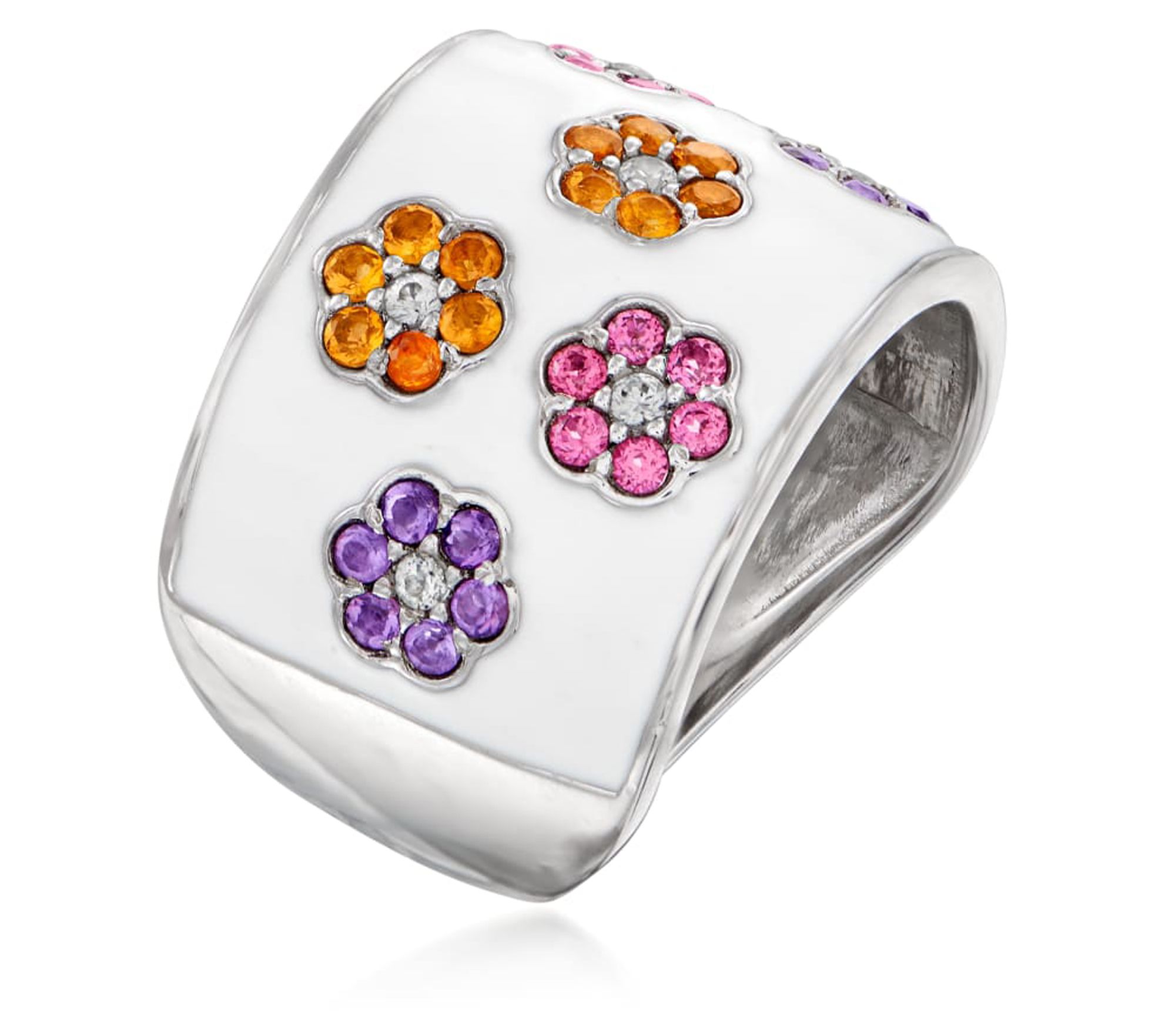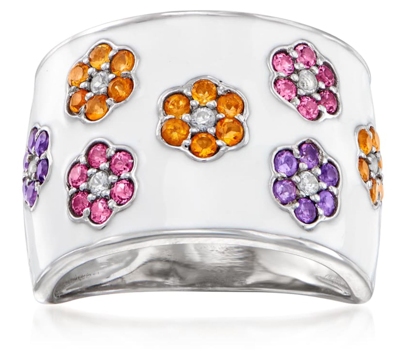 The Affinity Gems multi-gemstone floral dome ring in sterling silver offers a vibrant blend of colors and elegance. With its array of African amethyst, rhodolite, citrine, sunset citrine, and white zircon stones, this ring is perfect for adding a touch of sophistication to any outfit. From Affinity® Gems.