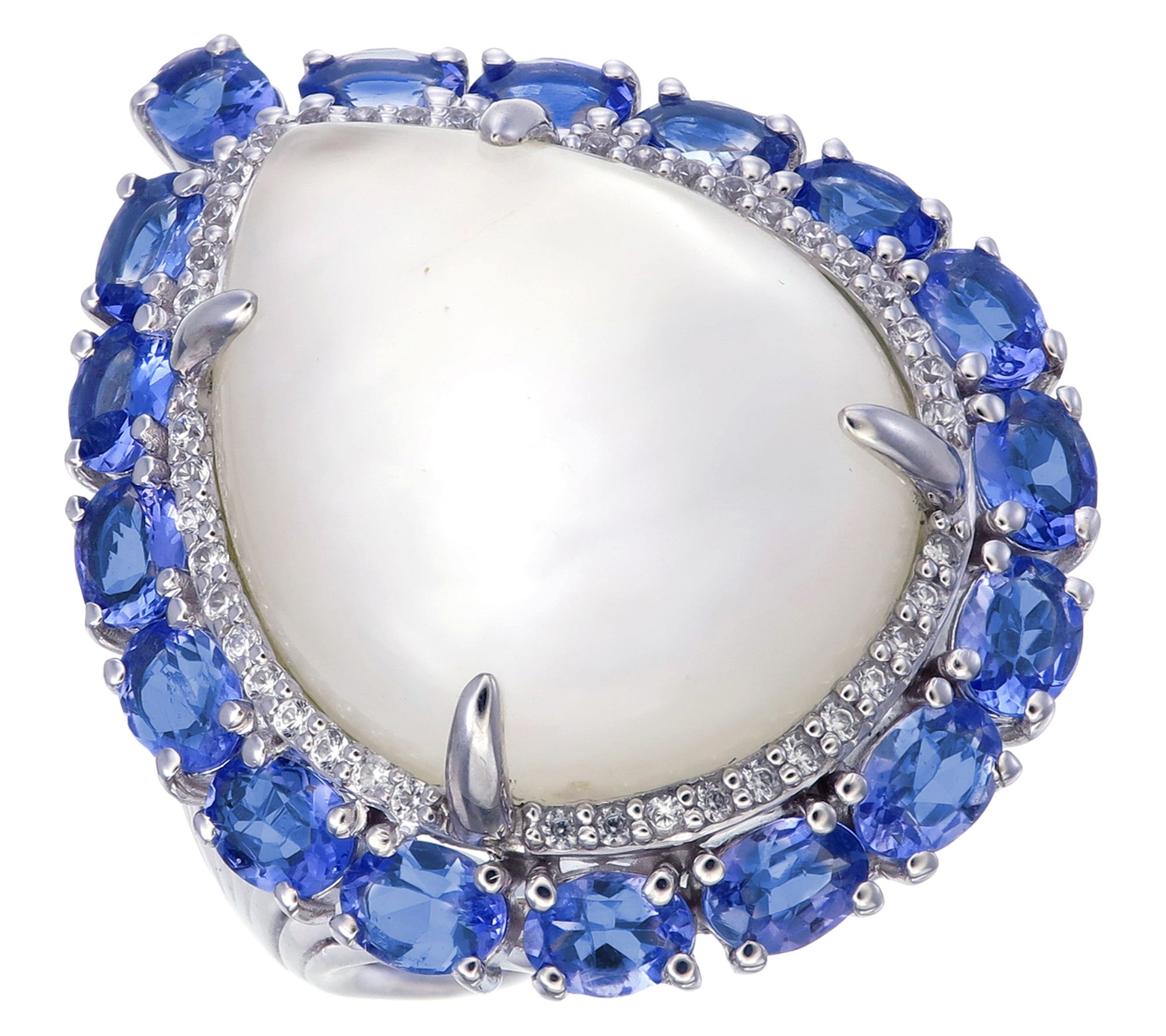 • Pear-shaped doublet with a quartz top and a mother-of-pearl base; oval-shaped tanzanite; round white zircon; polished finish