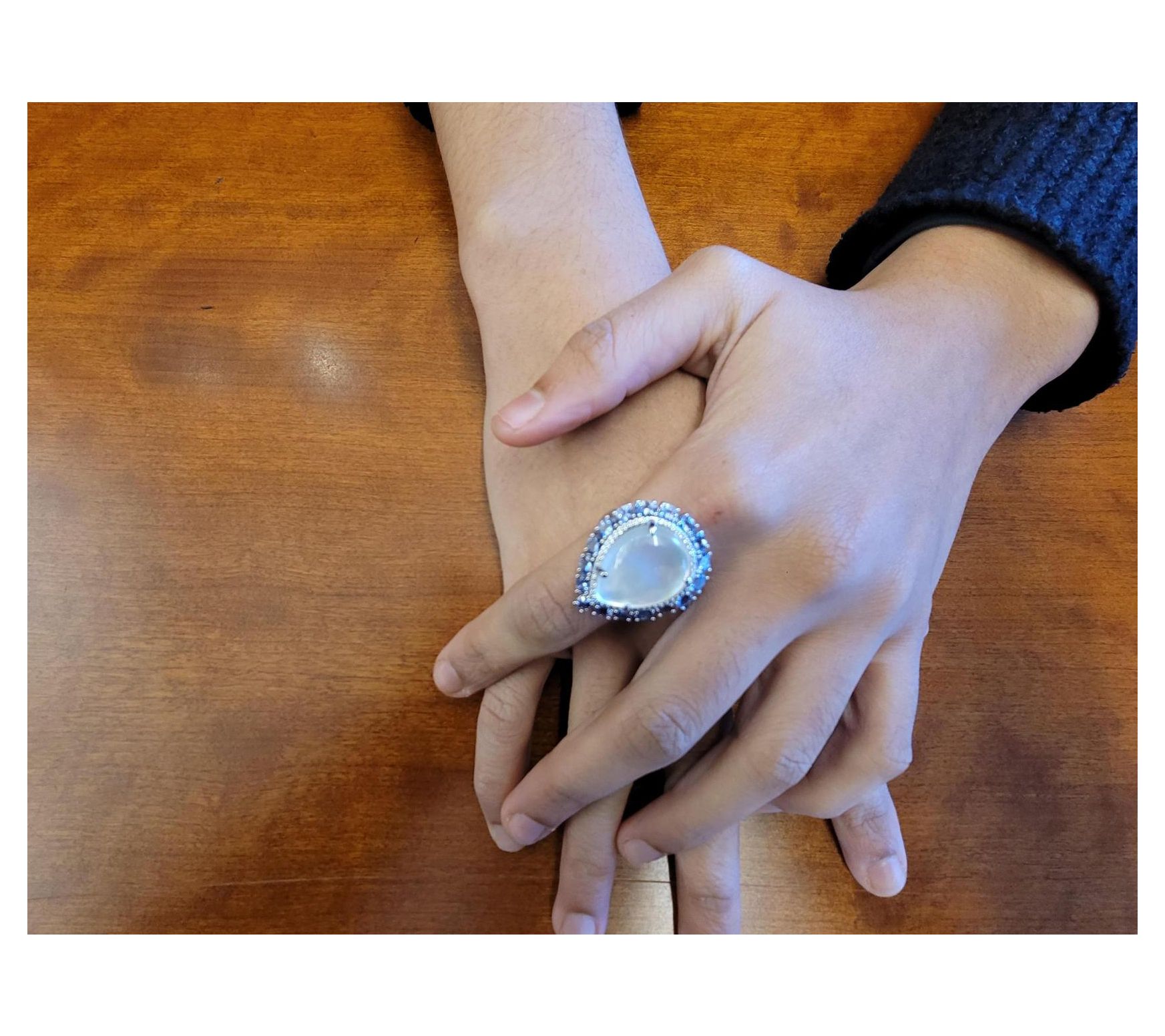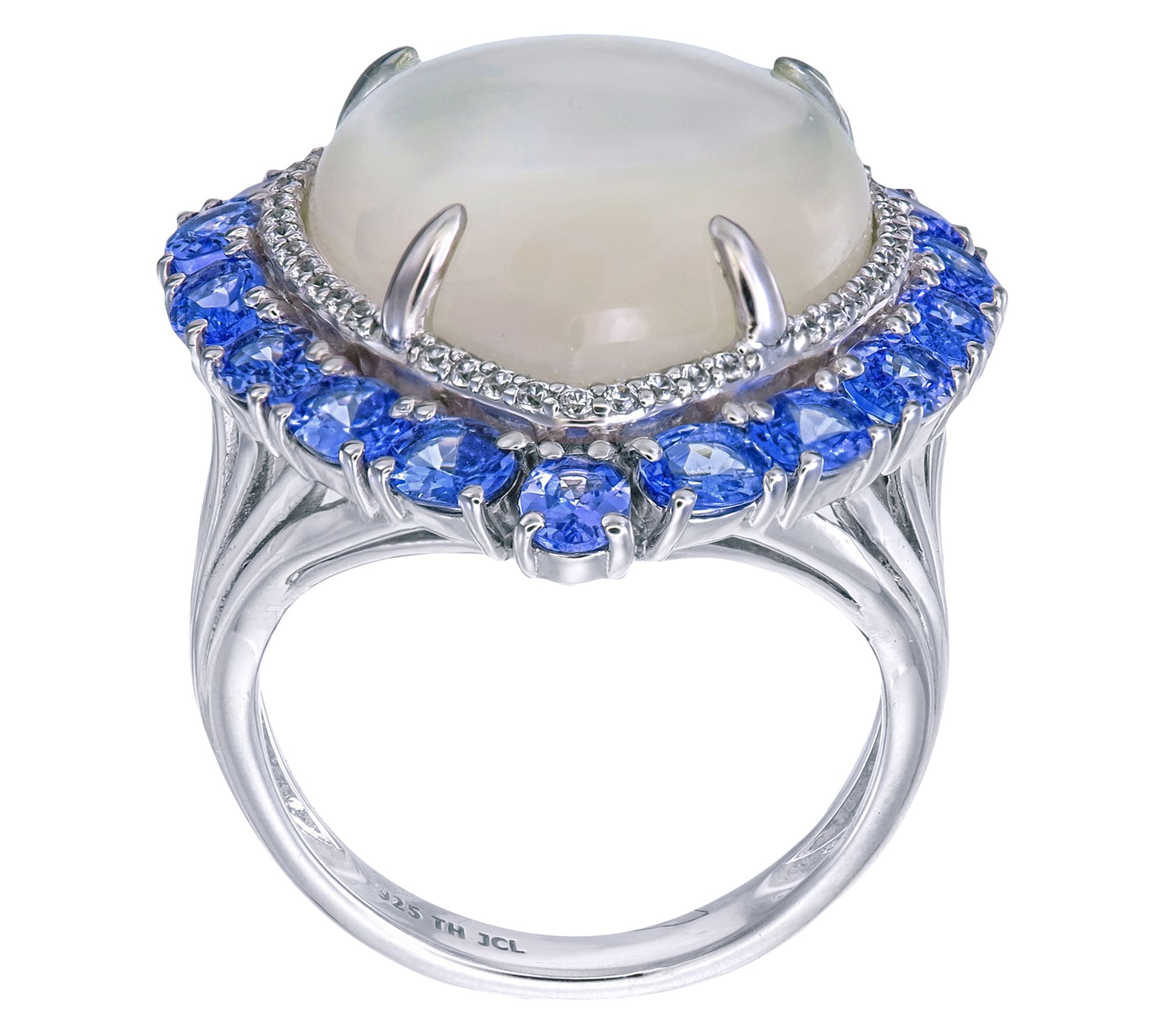Your hand will radiate with elegance as you slip on this stunning halo cocktail ring. Featuring a mesmerizing mother-of-pearl quartz doublet, oval-shaped tanzanite gemstones, and round white zircon accents, this is a showstopper piece. From Affinity® Gems.
