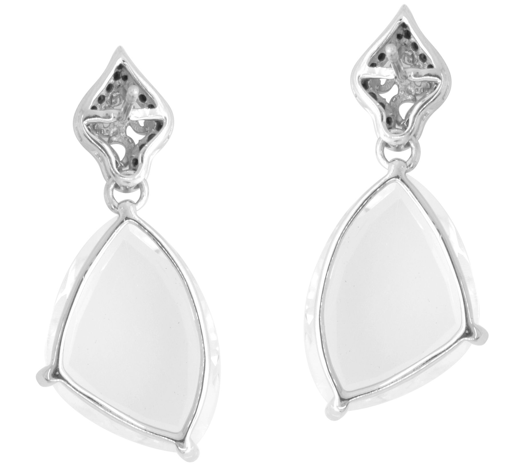 Irregular one-side flat-cut rock crystal and round-cut black spinel in prong setting dangle earrings