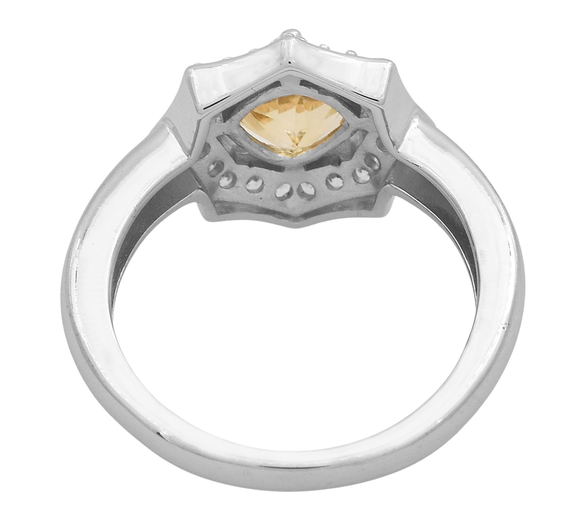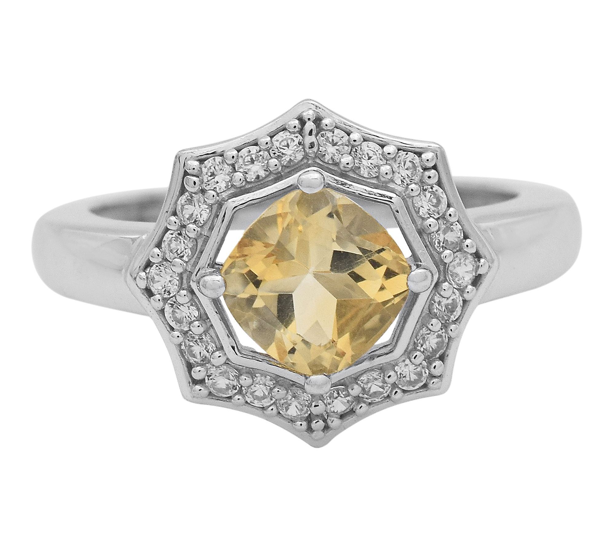 Cushion-cut, prong-set gemstone; halo of round, prong-set white zircon gemstones