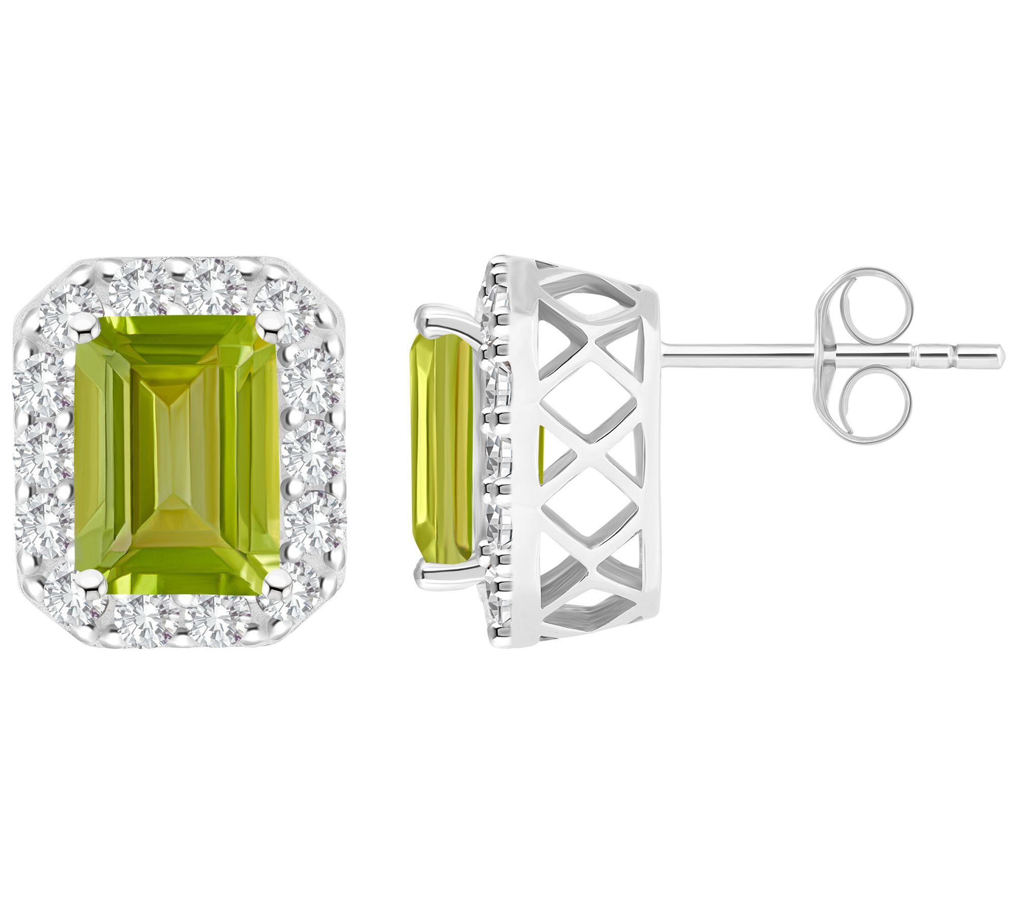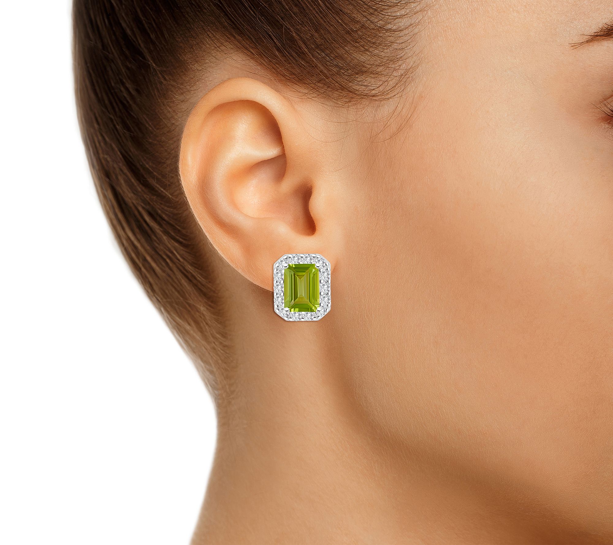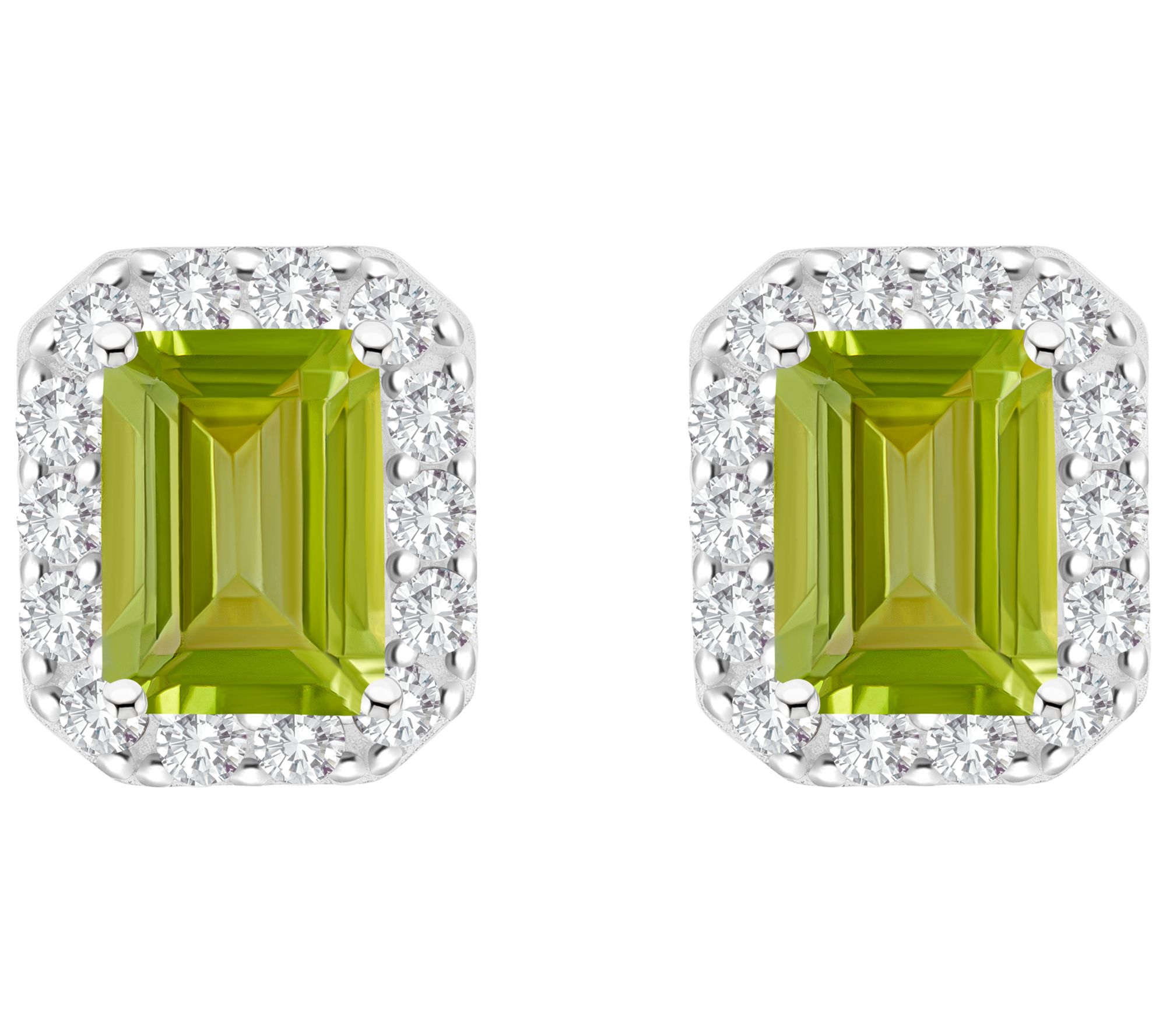 Prong-set emerald-cut gemstone surrounded by halo of round prong-set white topaz