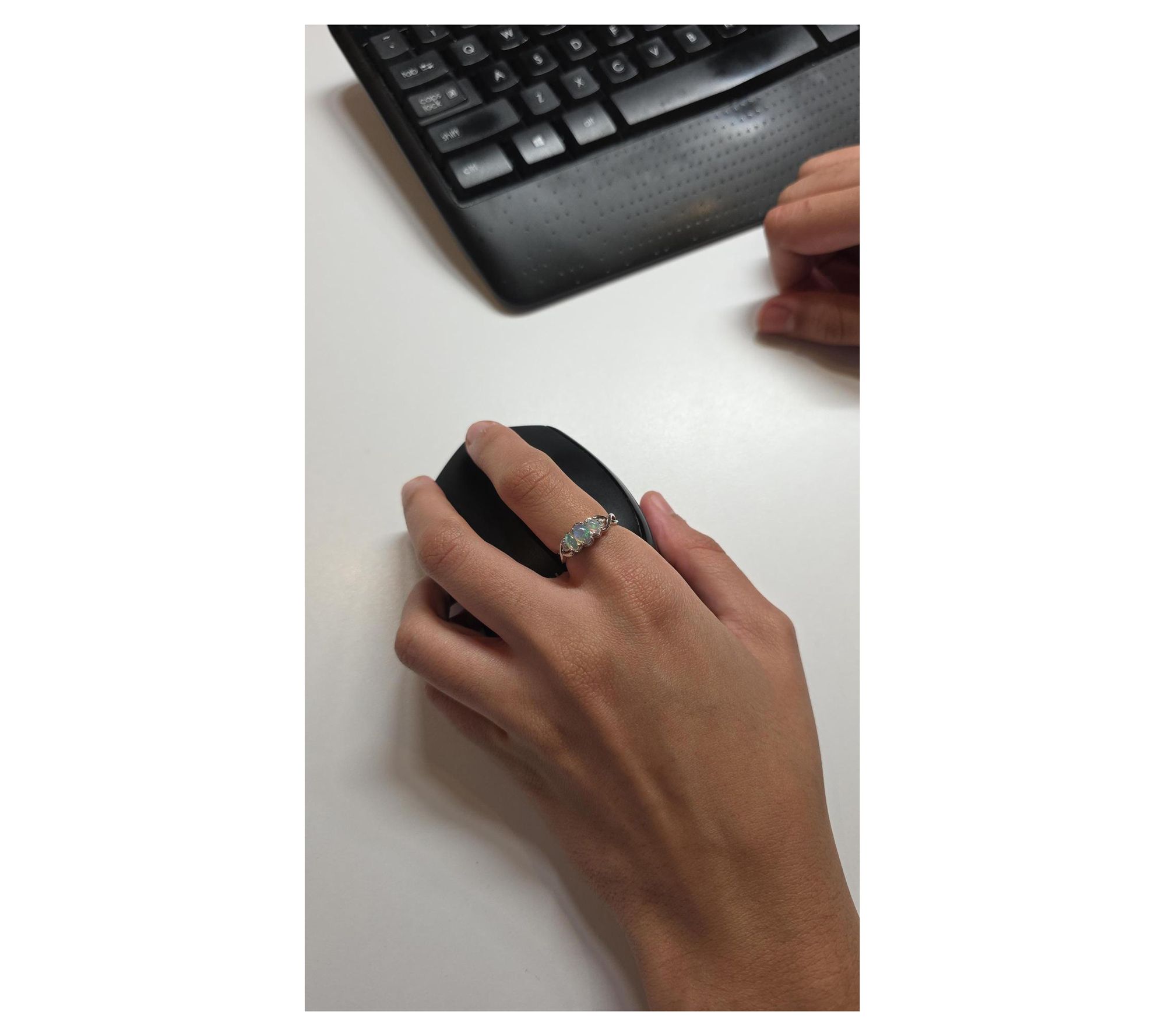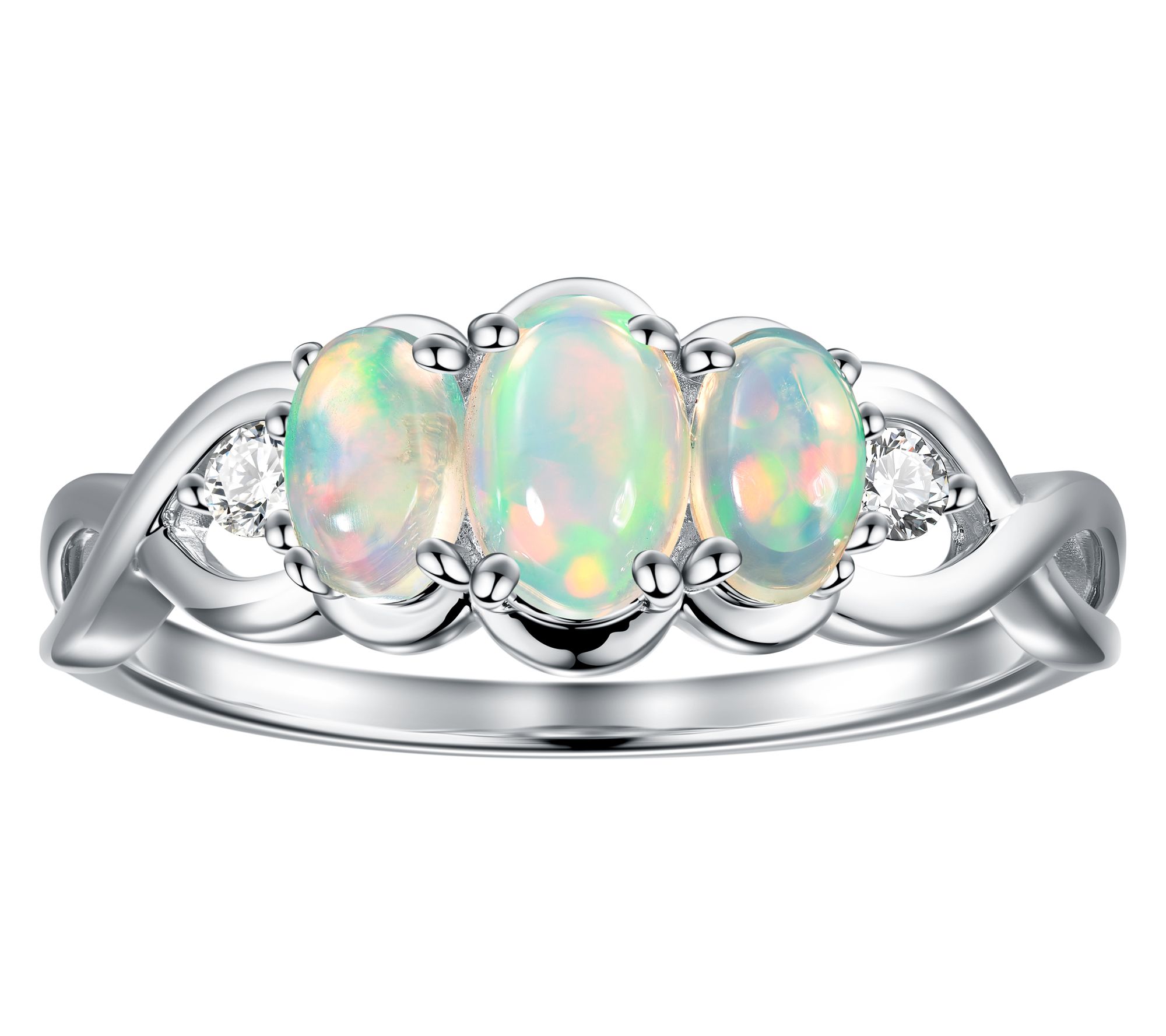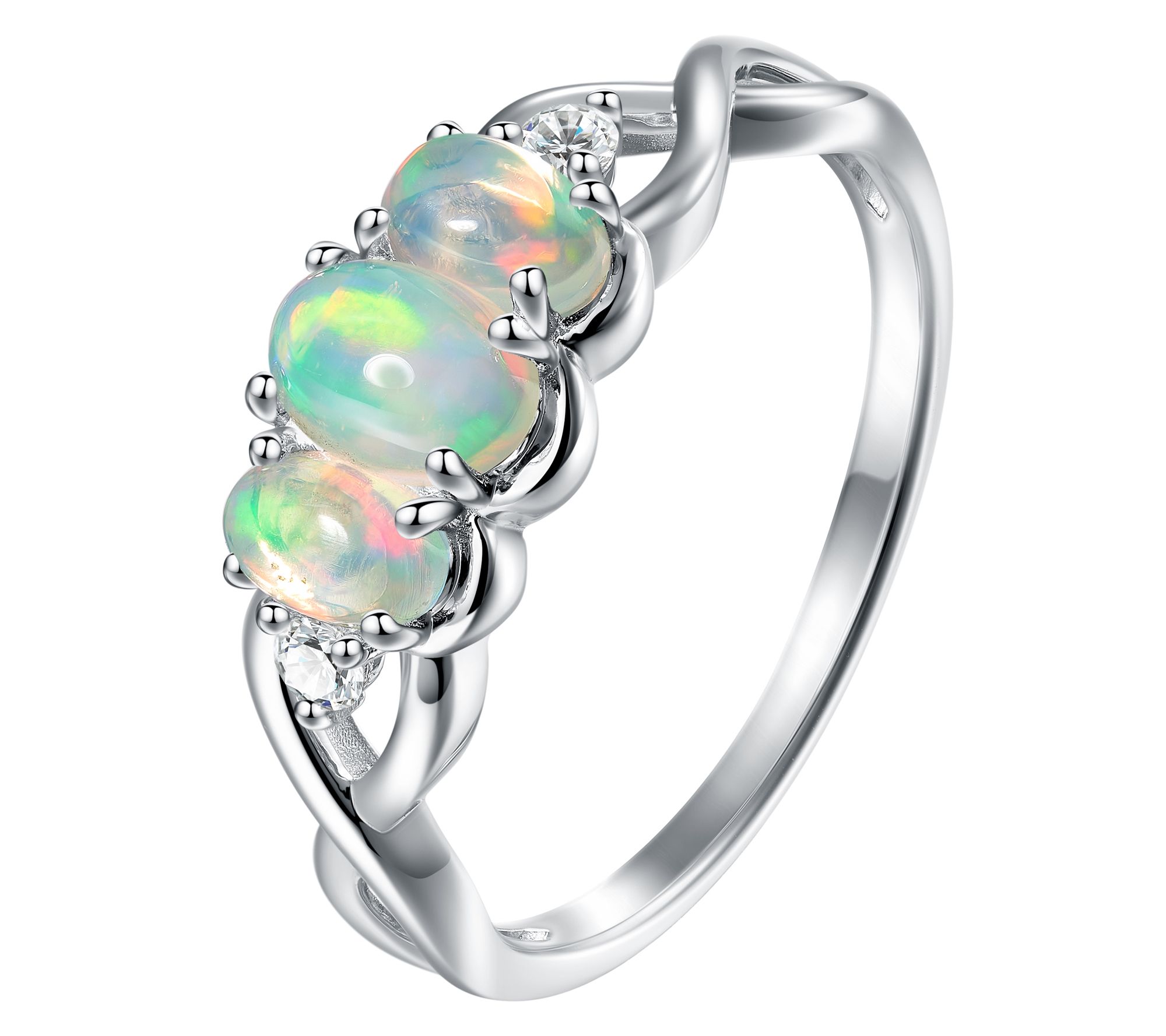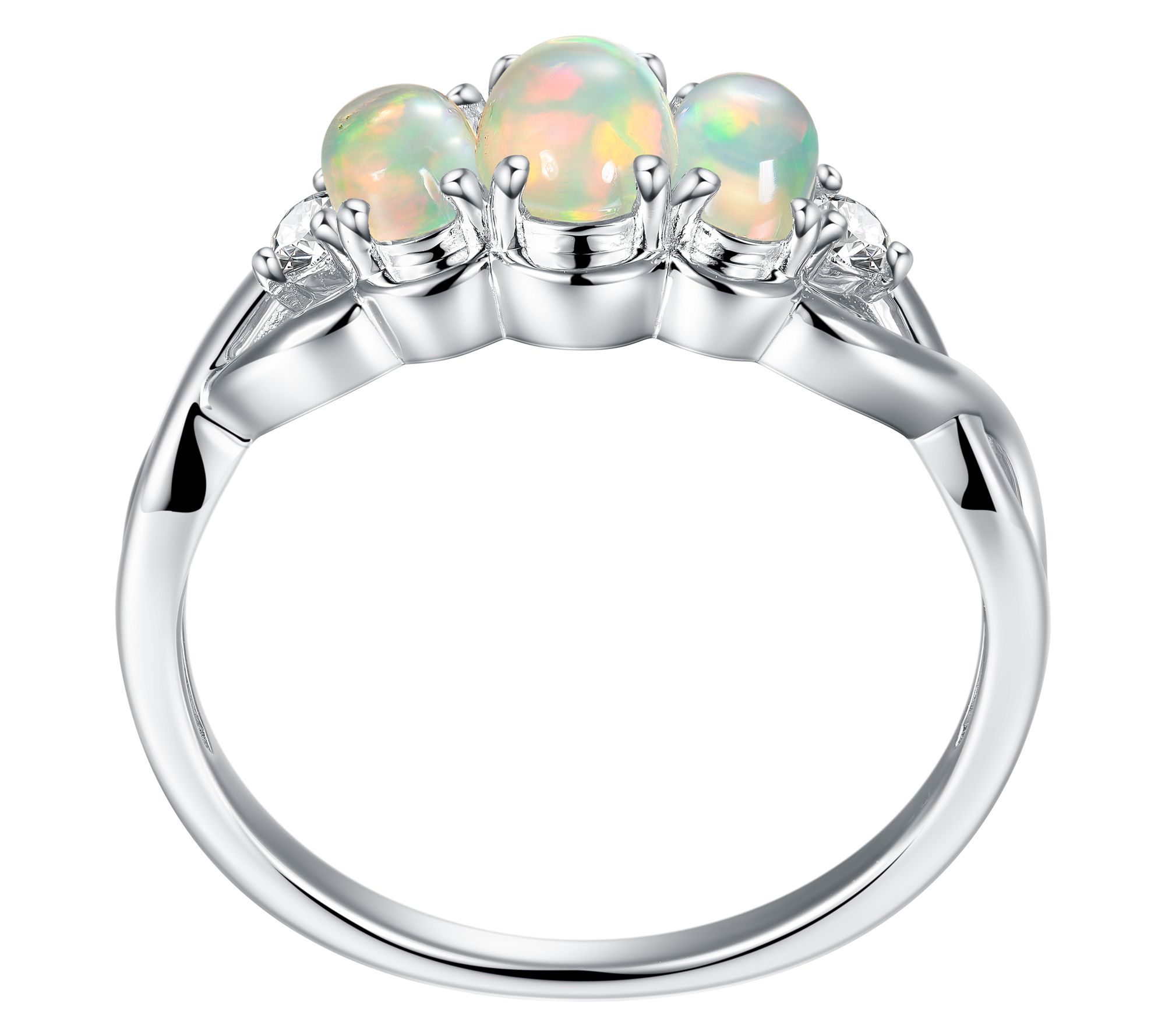 Prong-set, oval-cut gemstones; white zircon used as accents only; round-cut stones; three-stone infinity style band