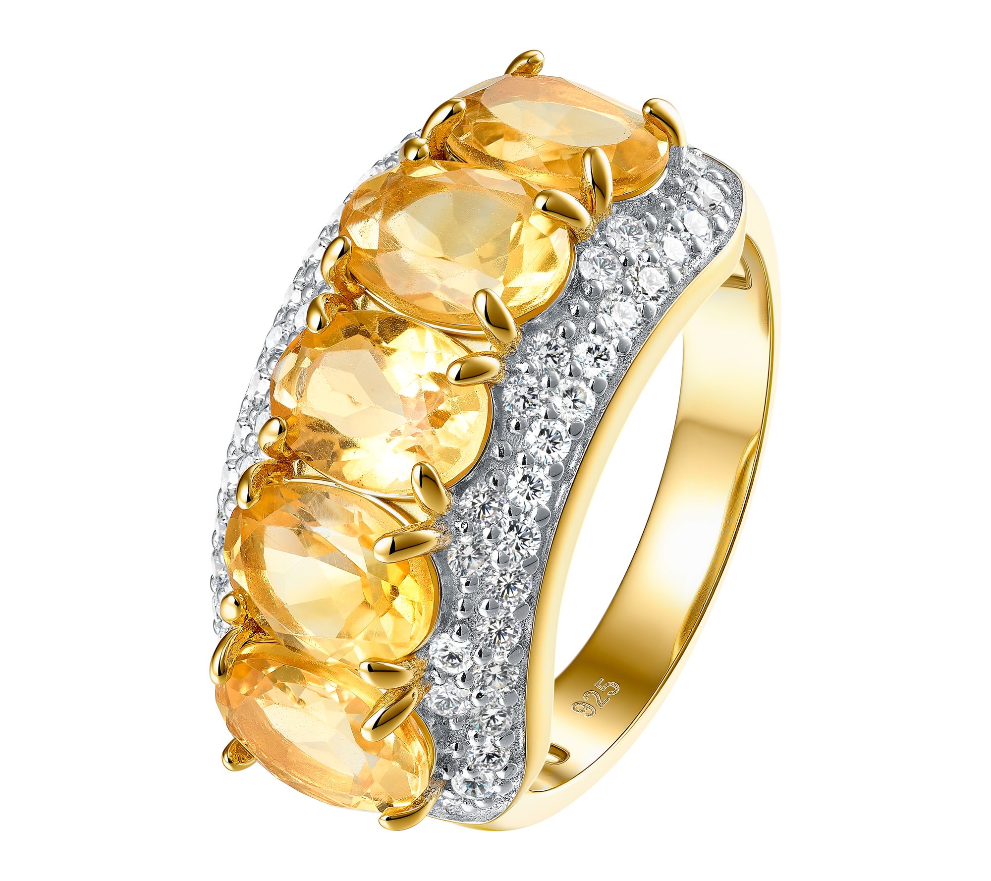 Five oval, prong-set gemstones with pave-set white zircon; wide band design