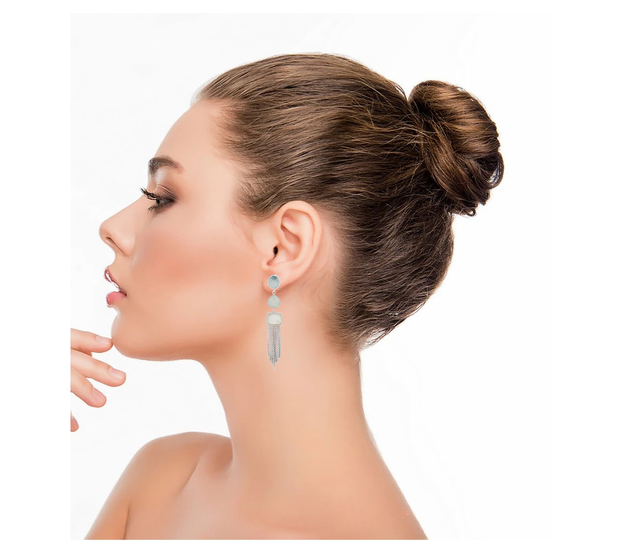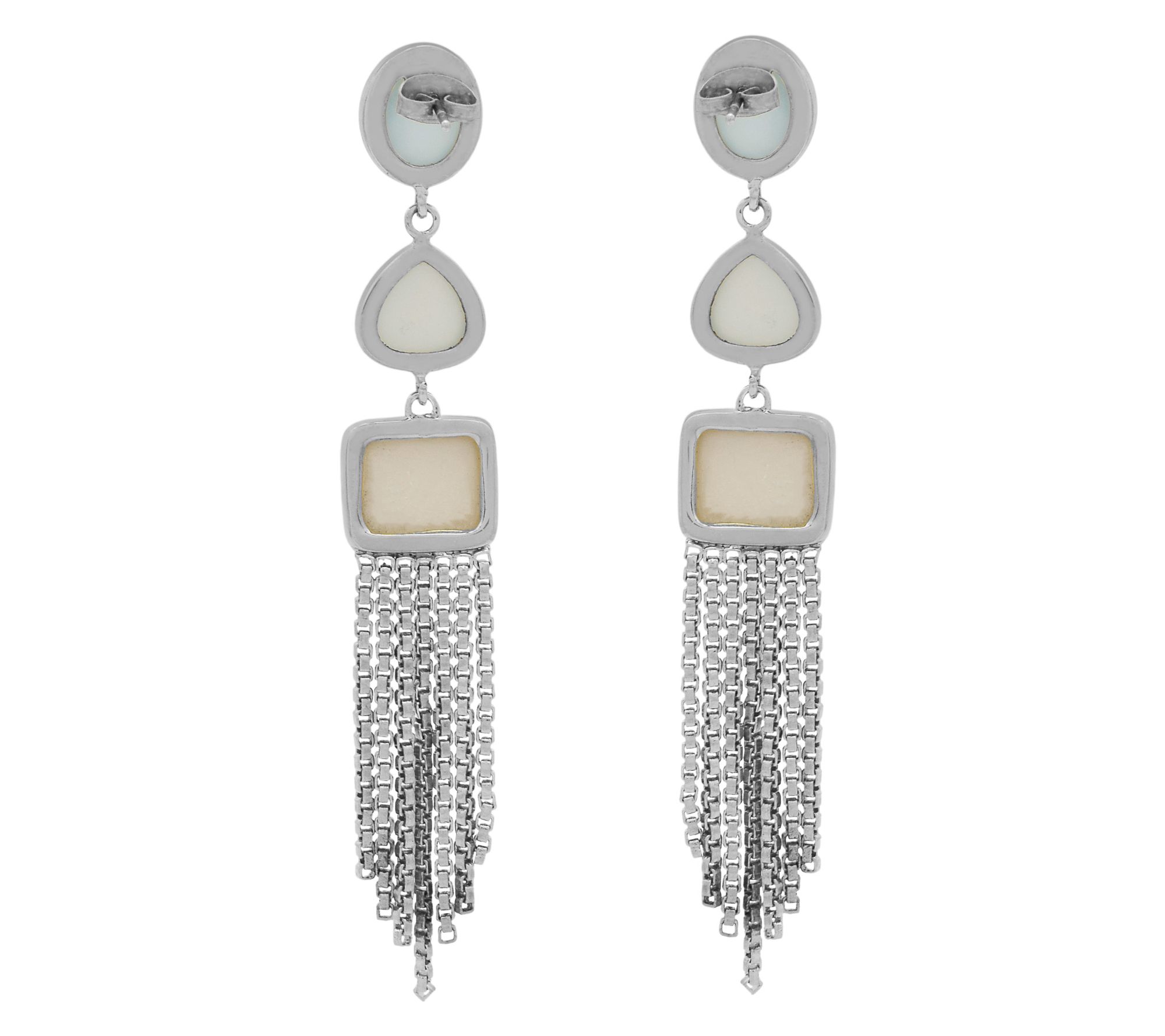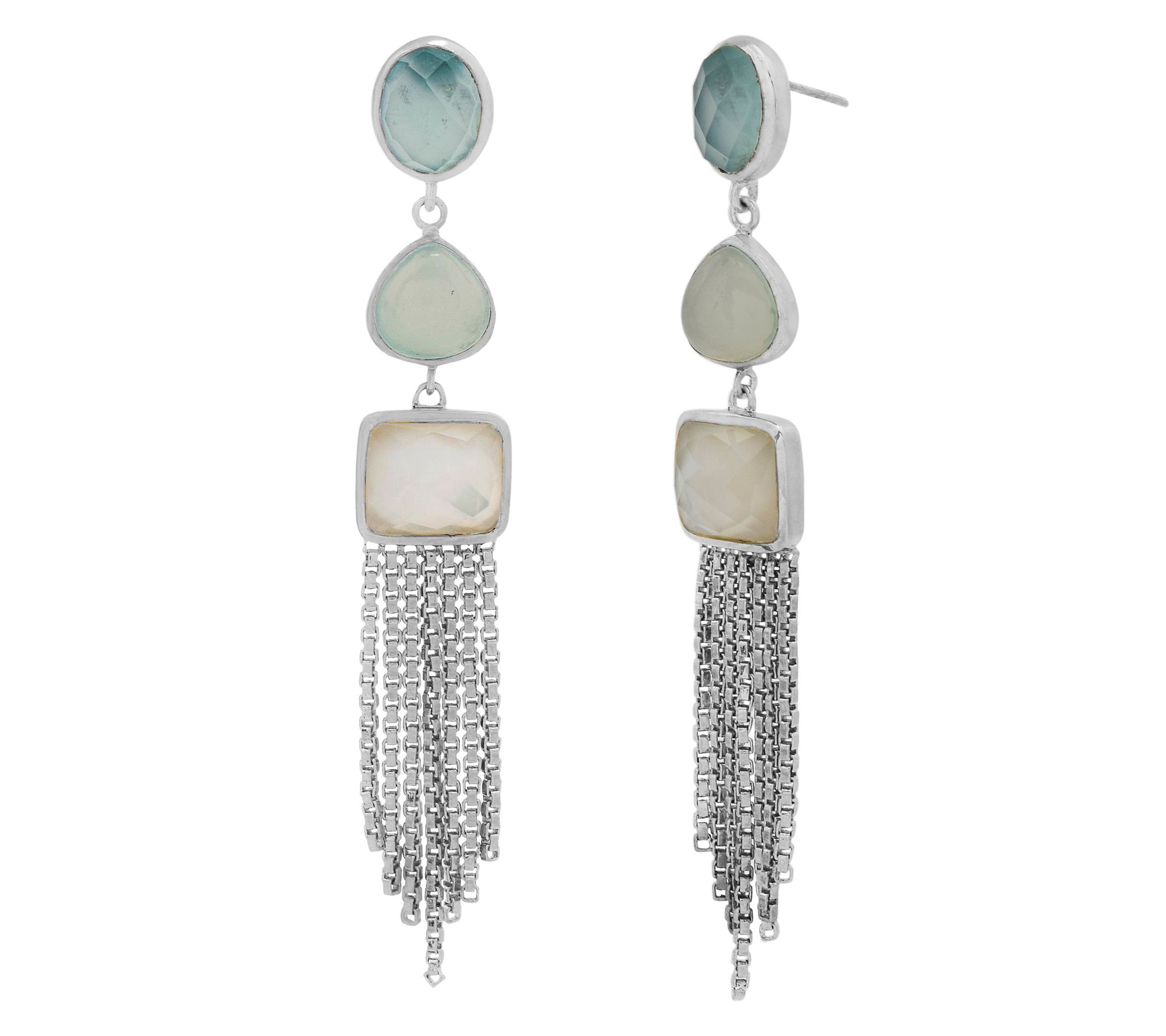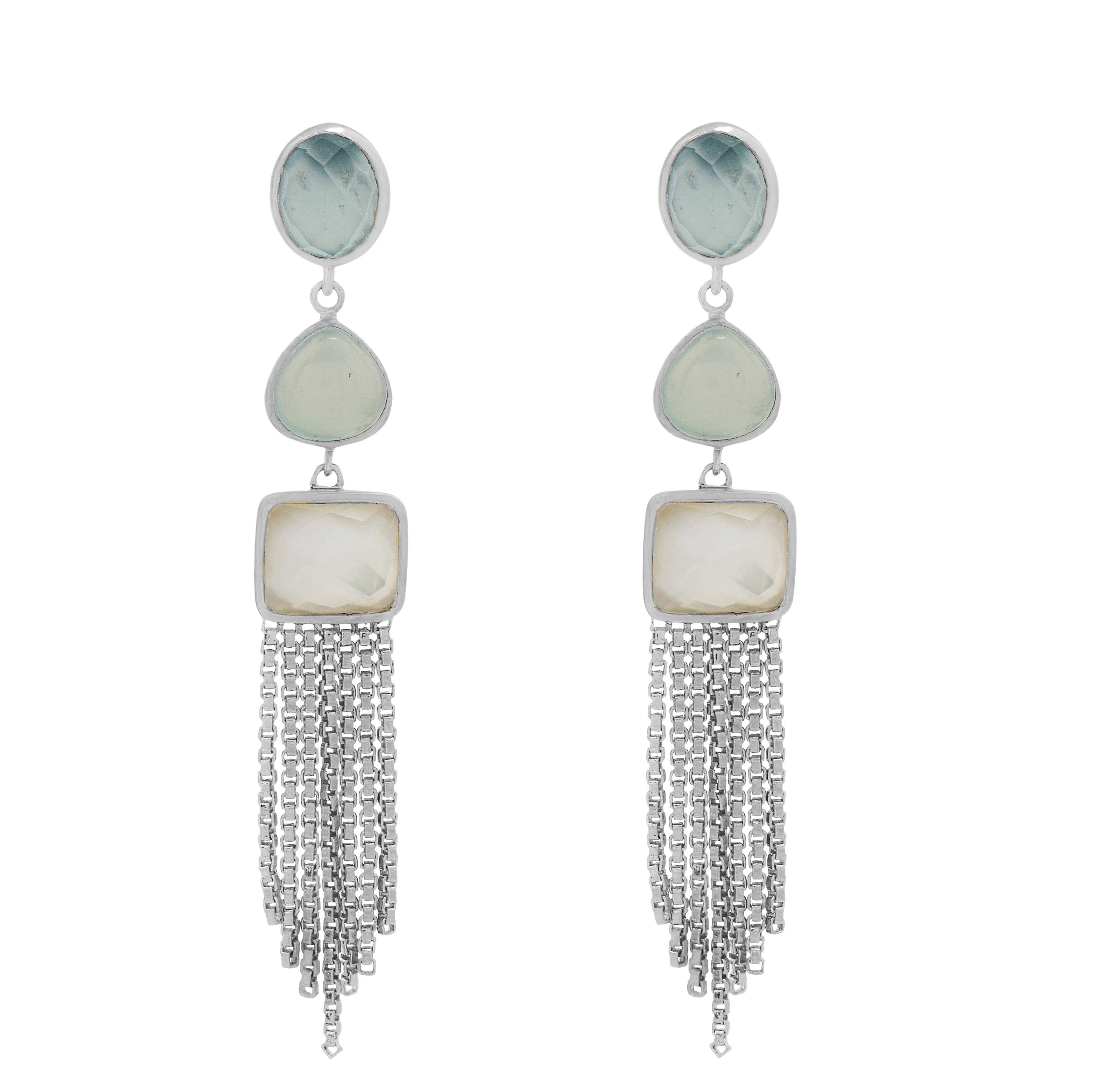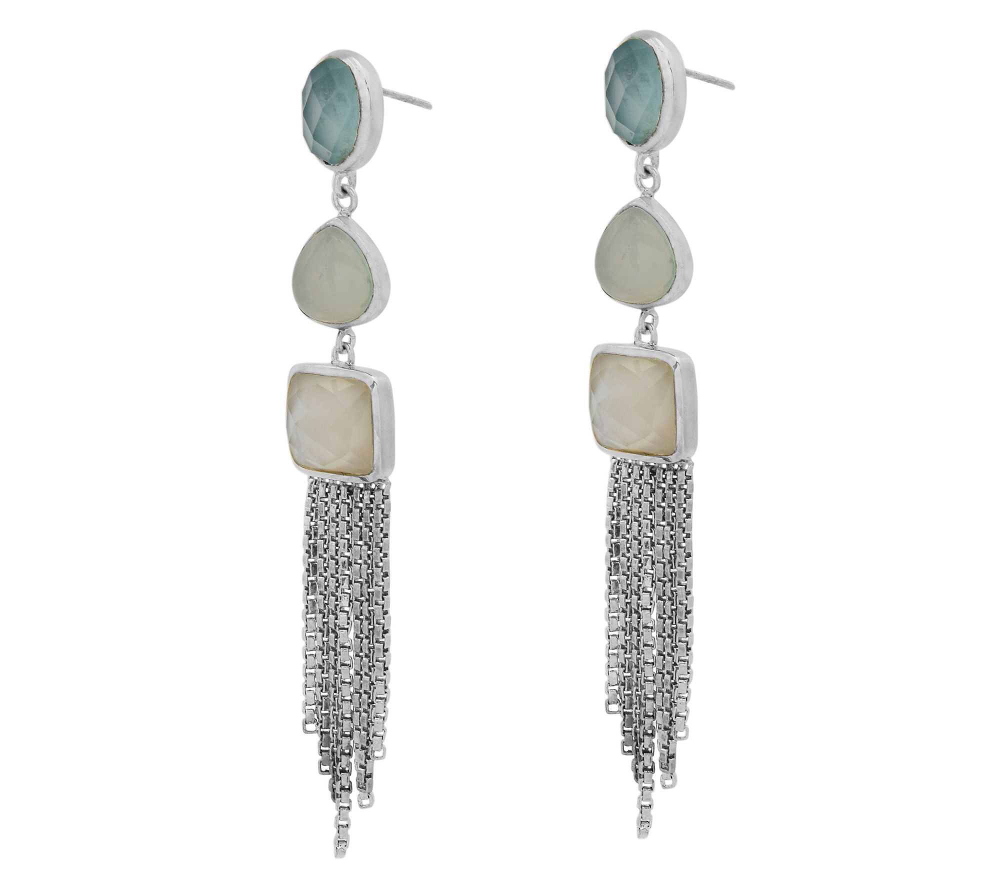 Brighten any occasion with these vibrant gemstone dangle earrings -- bold aqua-colored chalcedony, dreamy prehnite-colored chalcedony, and luminous doublet shell with rock crystal quartz catch the light with every step. Whether accenting a cocktail dress or elevating your favorite denim, these showstoppers bring artful color and sophisticated sparkle. From Affinity® Gems.