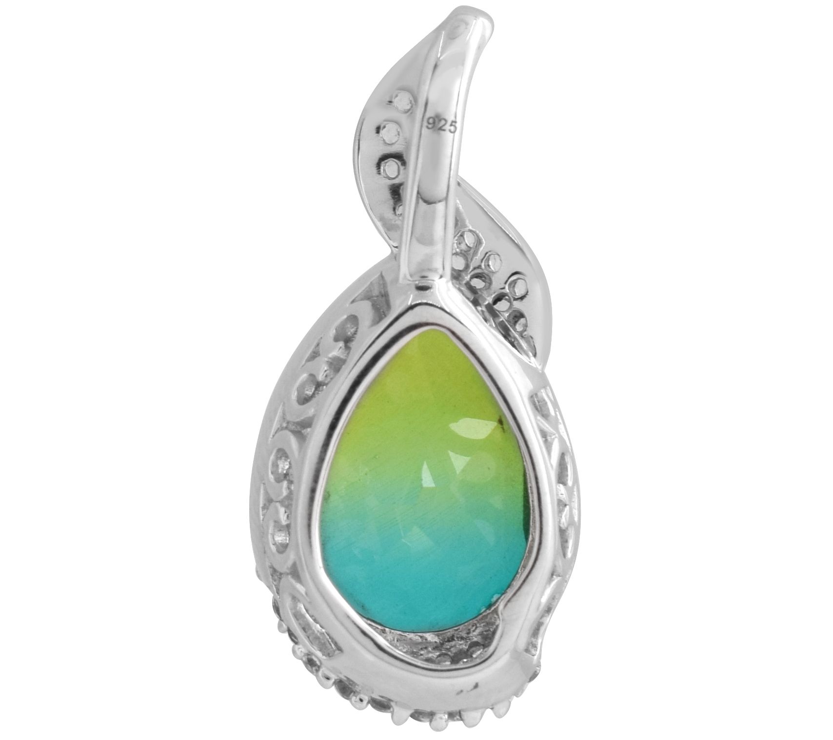 Pear-cut aurora borealis mystic quartz in a half-bezel setting accented by round, prong-set white topaz