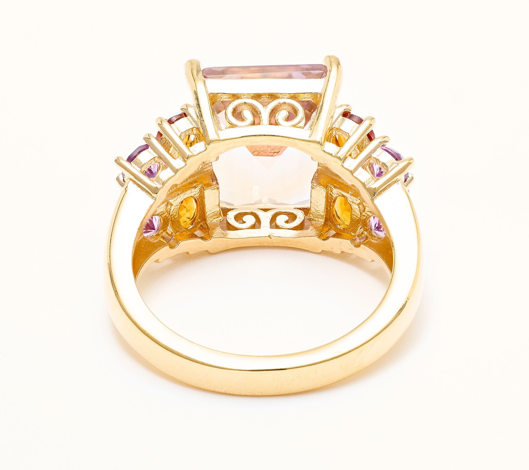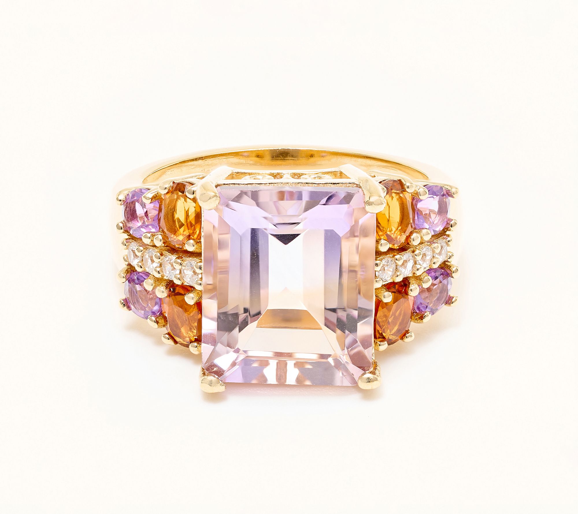 Brilliantly blending the golden hues of citrine with the violet tones of amethyst, this octagon ametrine ring captures attention with its unexpected beauty. Faceted white zircon, amethyst, and rich Madeira citrine accents add a sparkling finish that makes this statement piece a natural complement for dressy occasions or everyday glamour. From Affinity® Gems.
