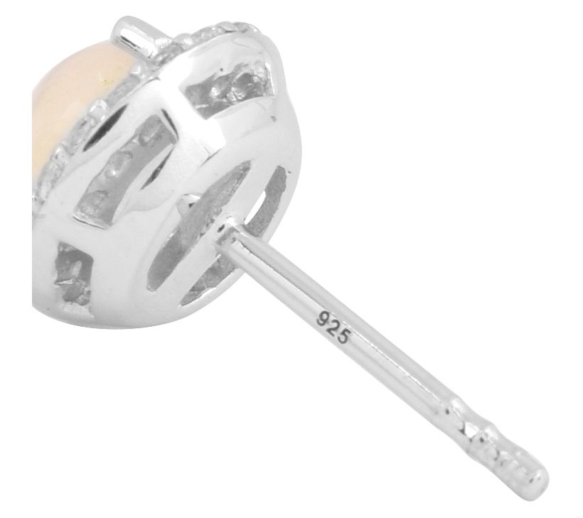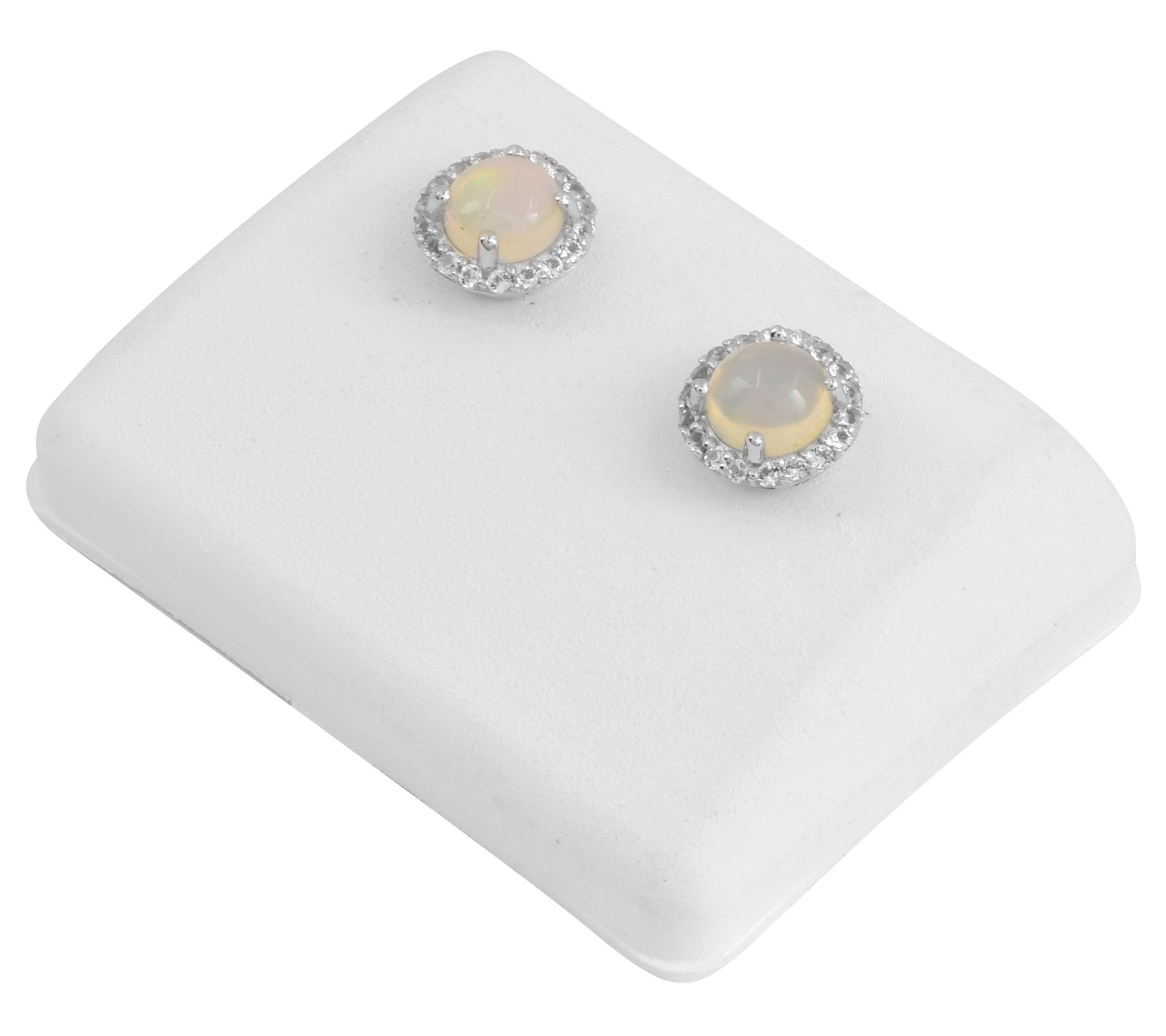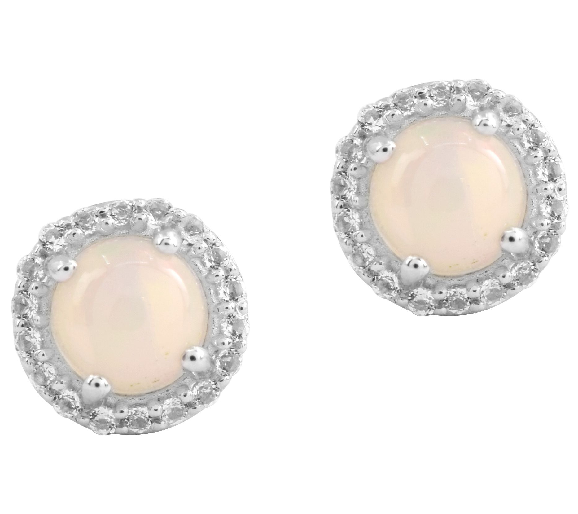 • Stud design; Ethiopian opal surrounded by a halo of round, prong-set white topaz gemstones