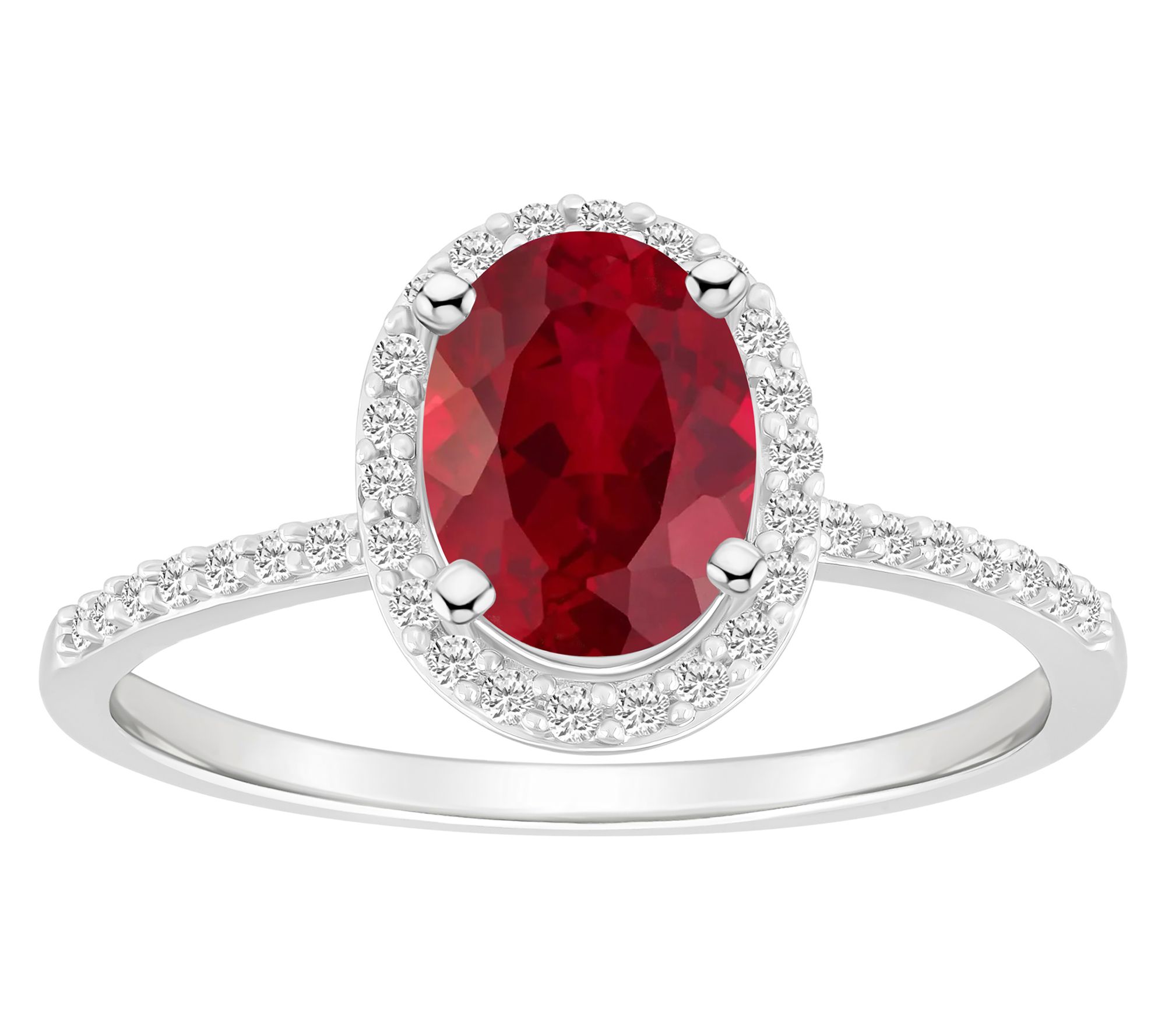 Oval-cut created gemstone with a round-cut created white sapphire halo; prong setting; polished finish