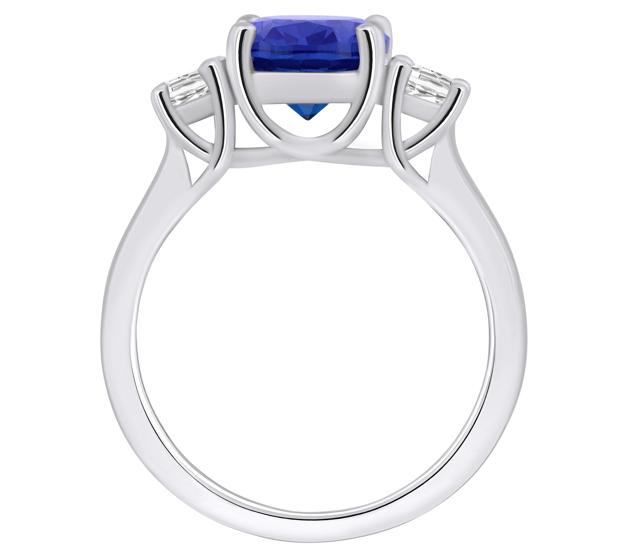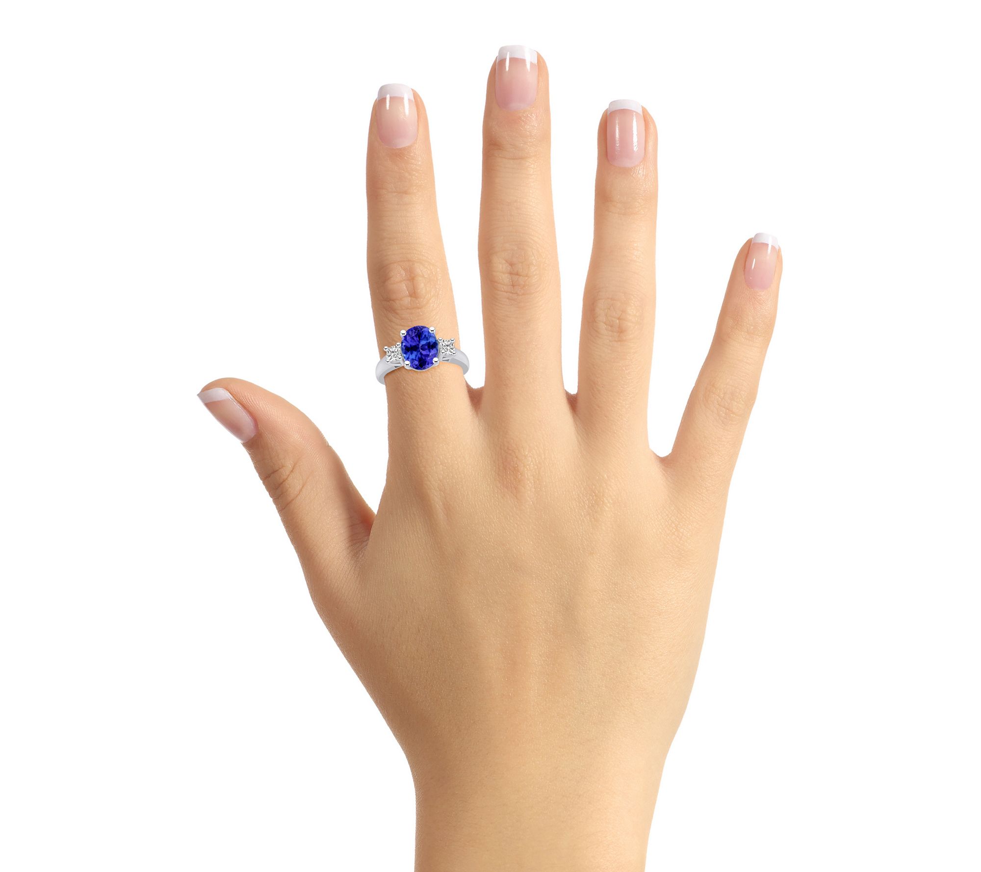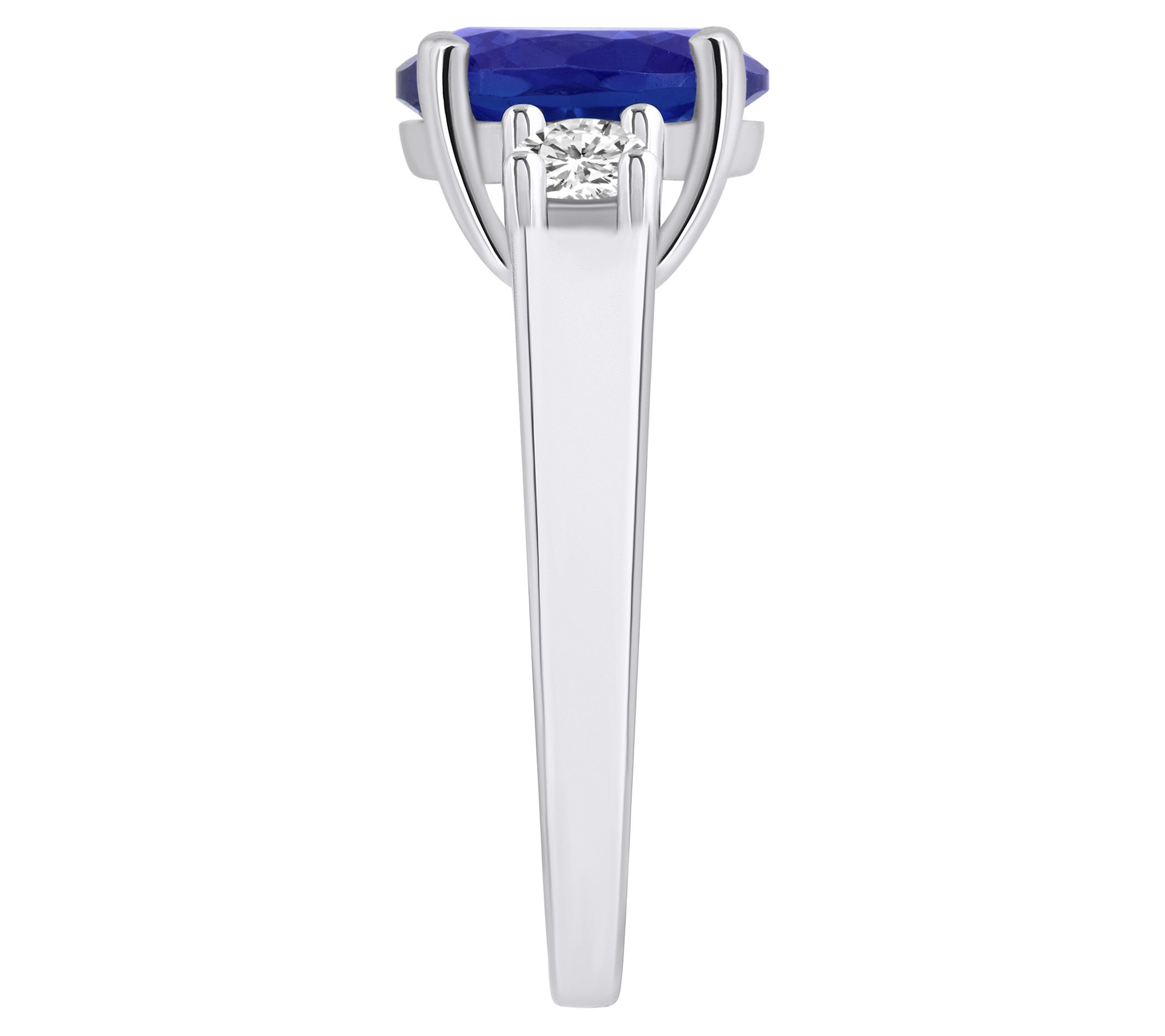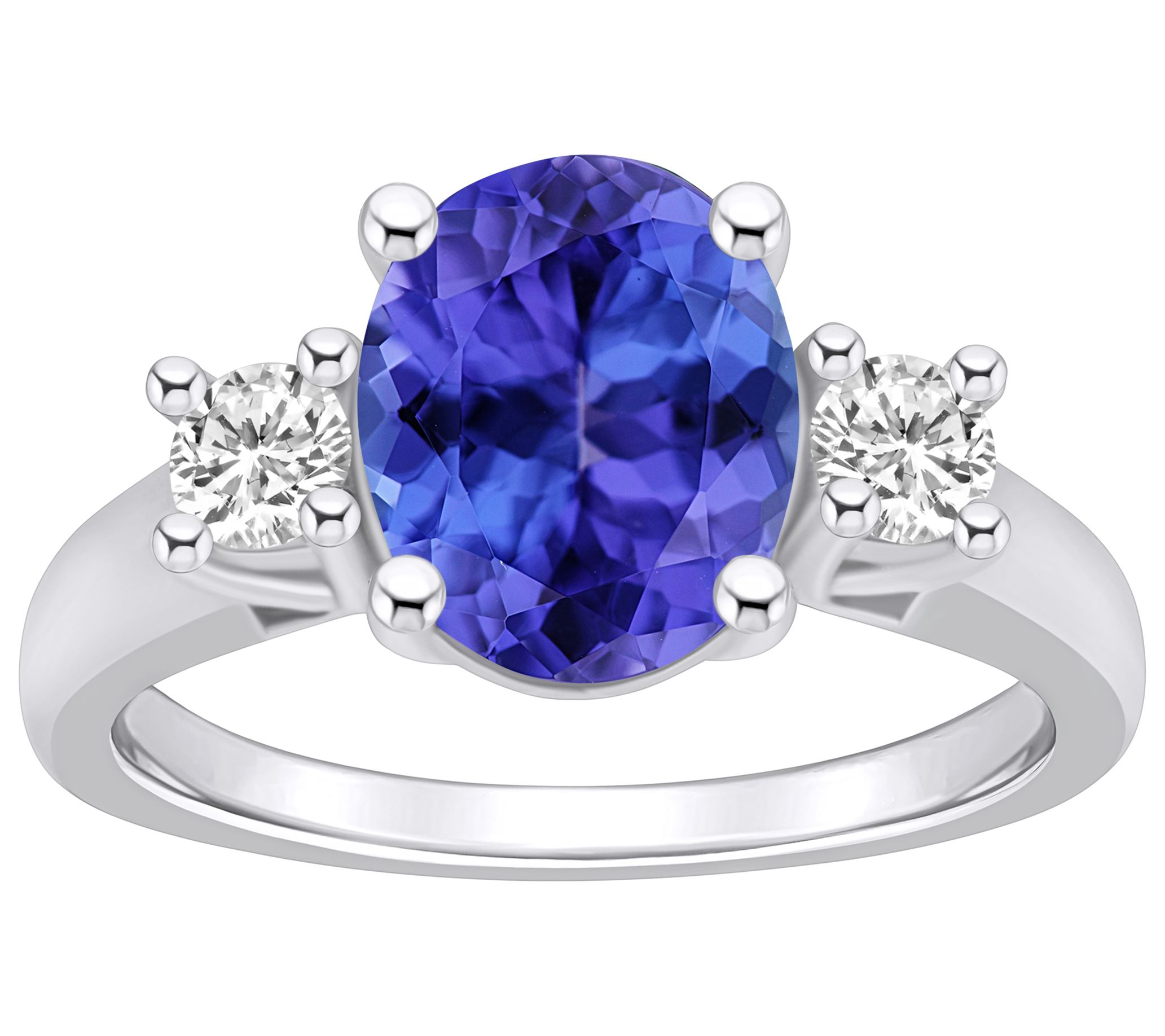- Center oval-cut tanzanite flanked by two round-cut diamonds
