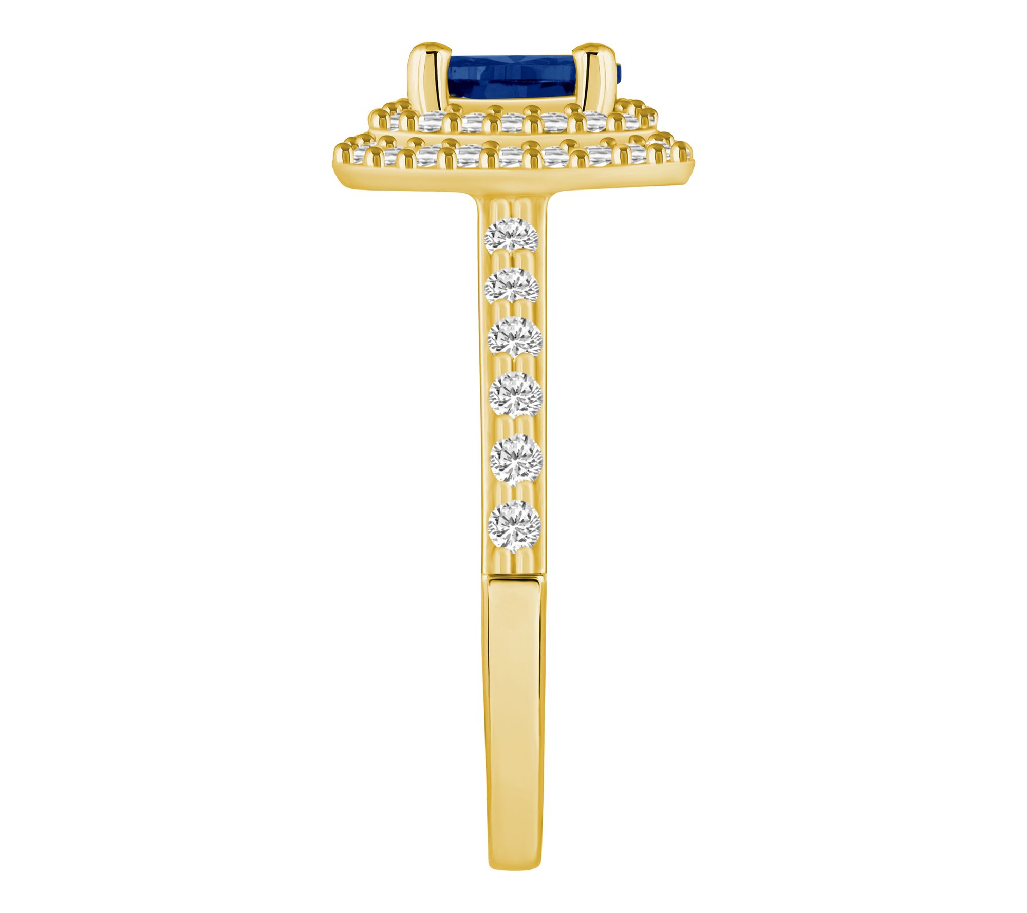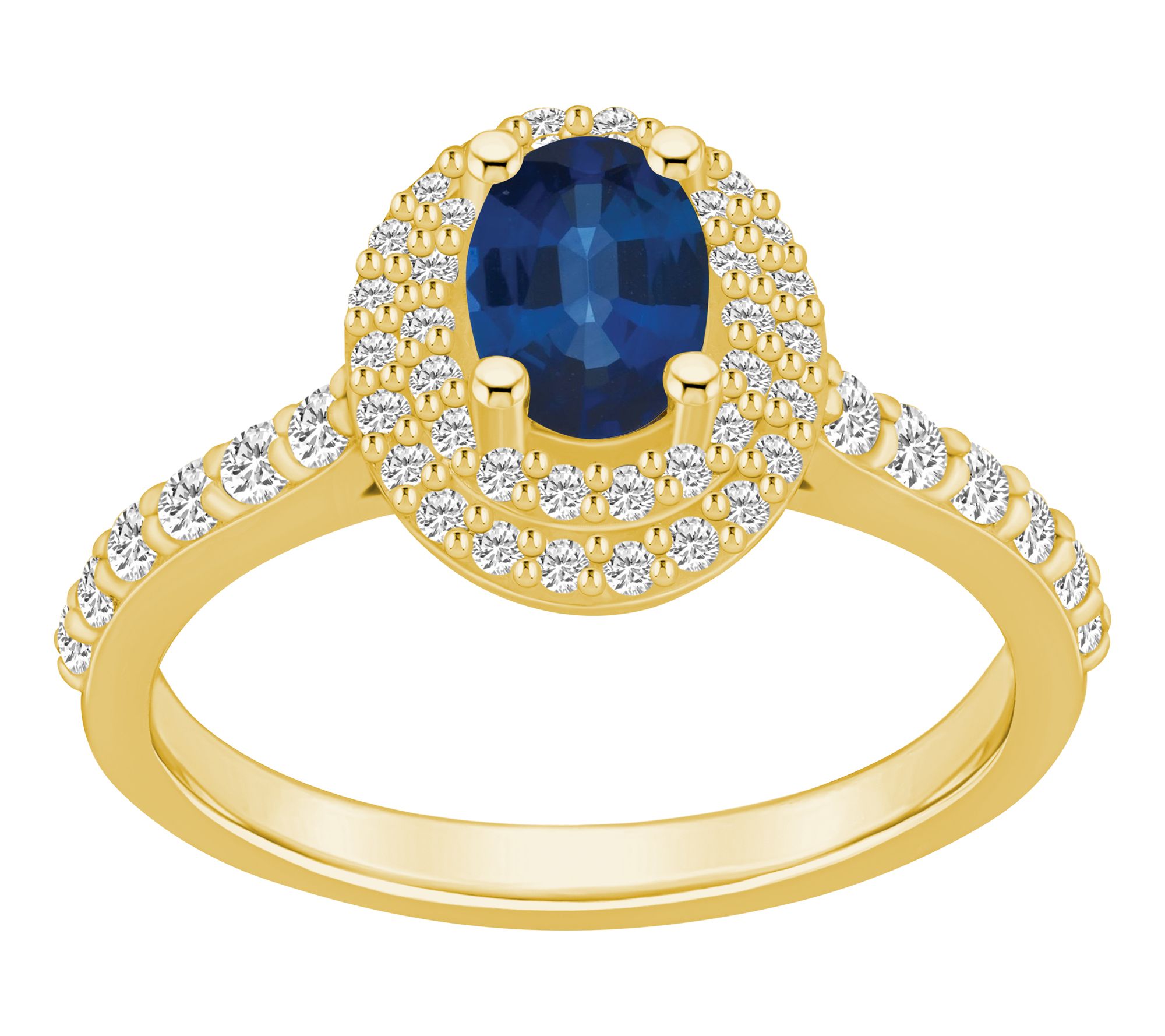 This stunning halo ring features an oval-shaped gemstone encircled by a double halo of sparkling diamonds, with additional diamond accents on the shank. From Affinity® Gems.