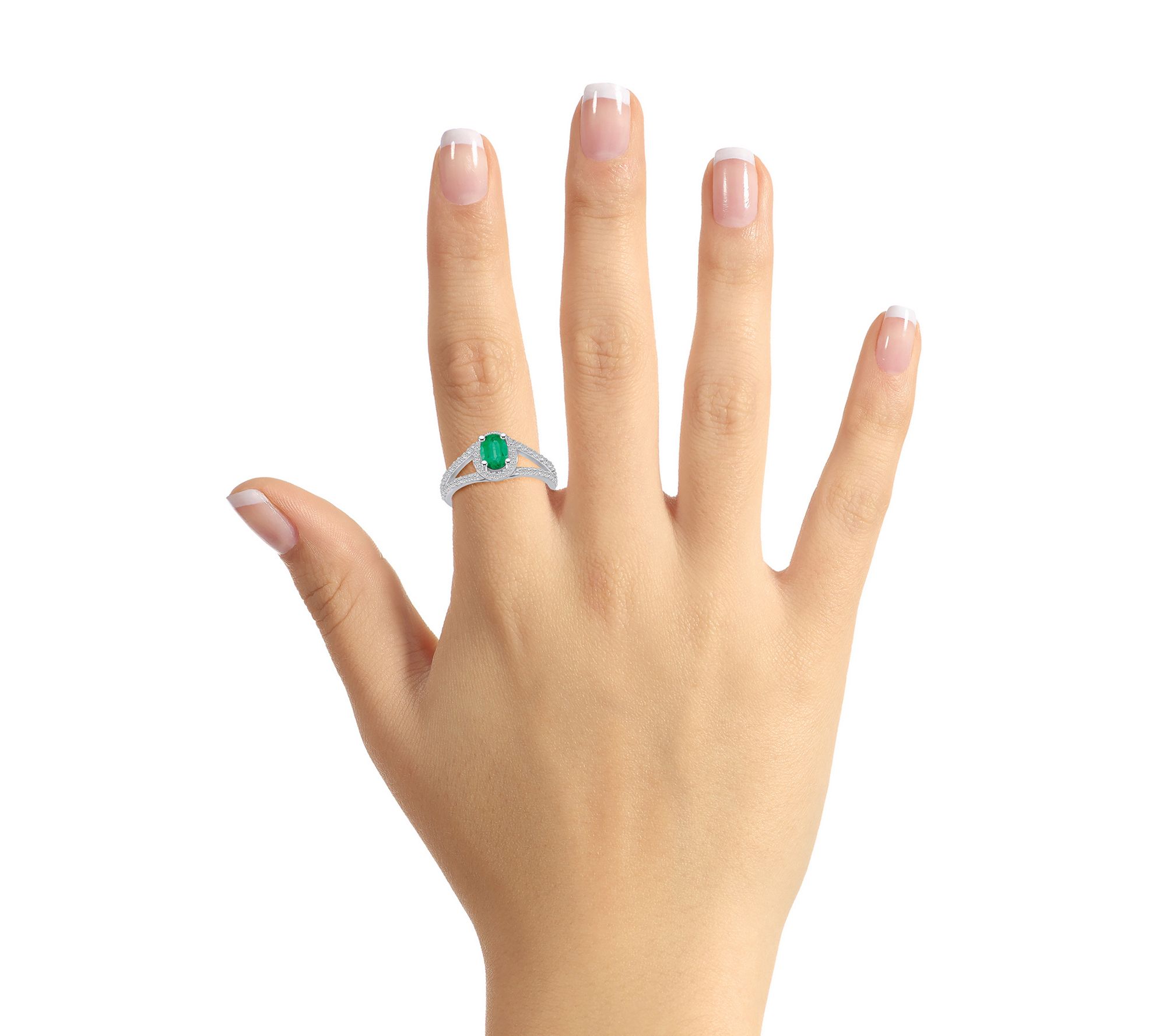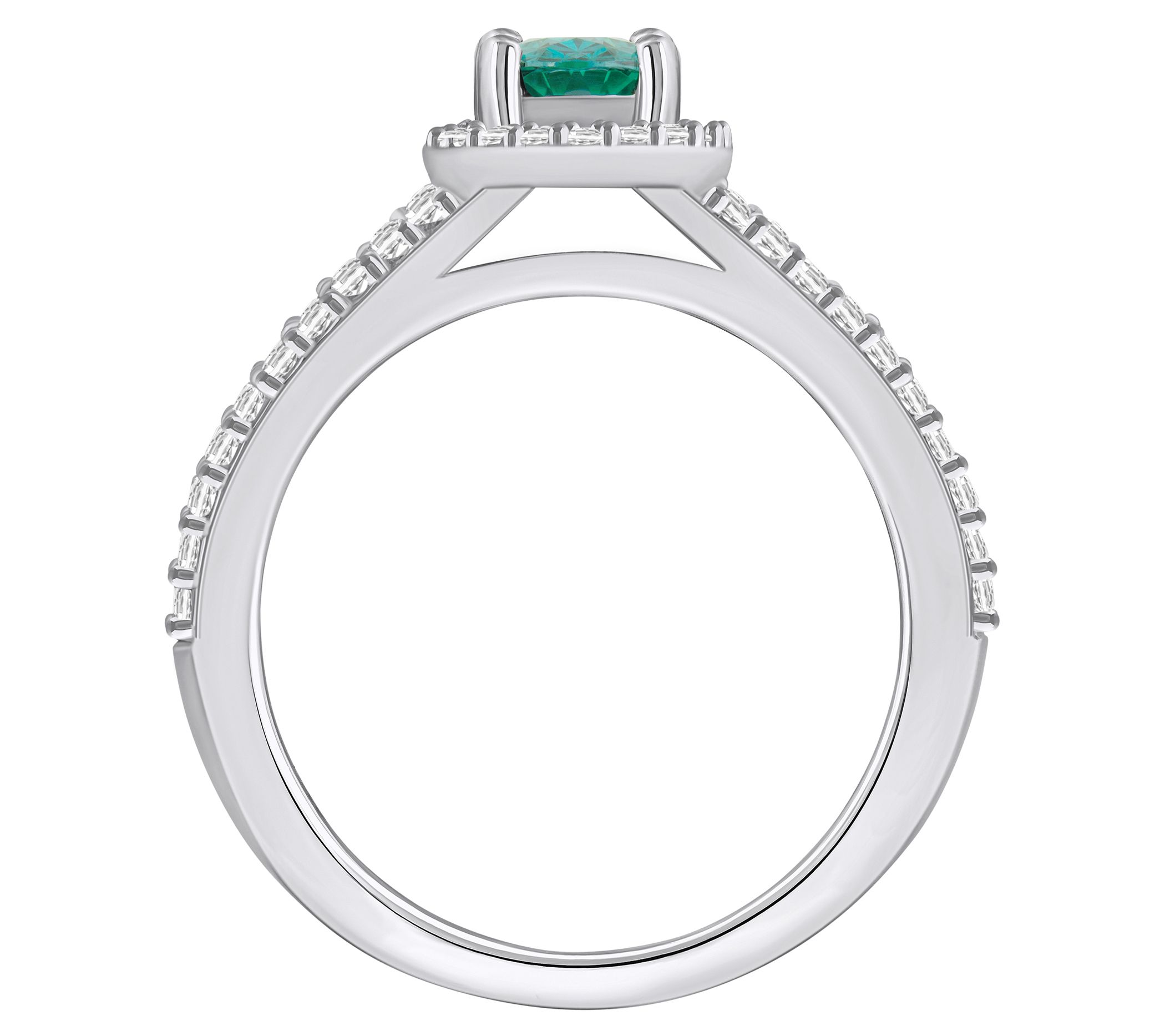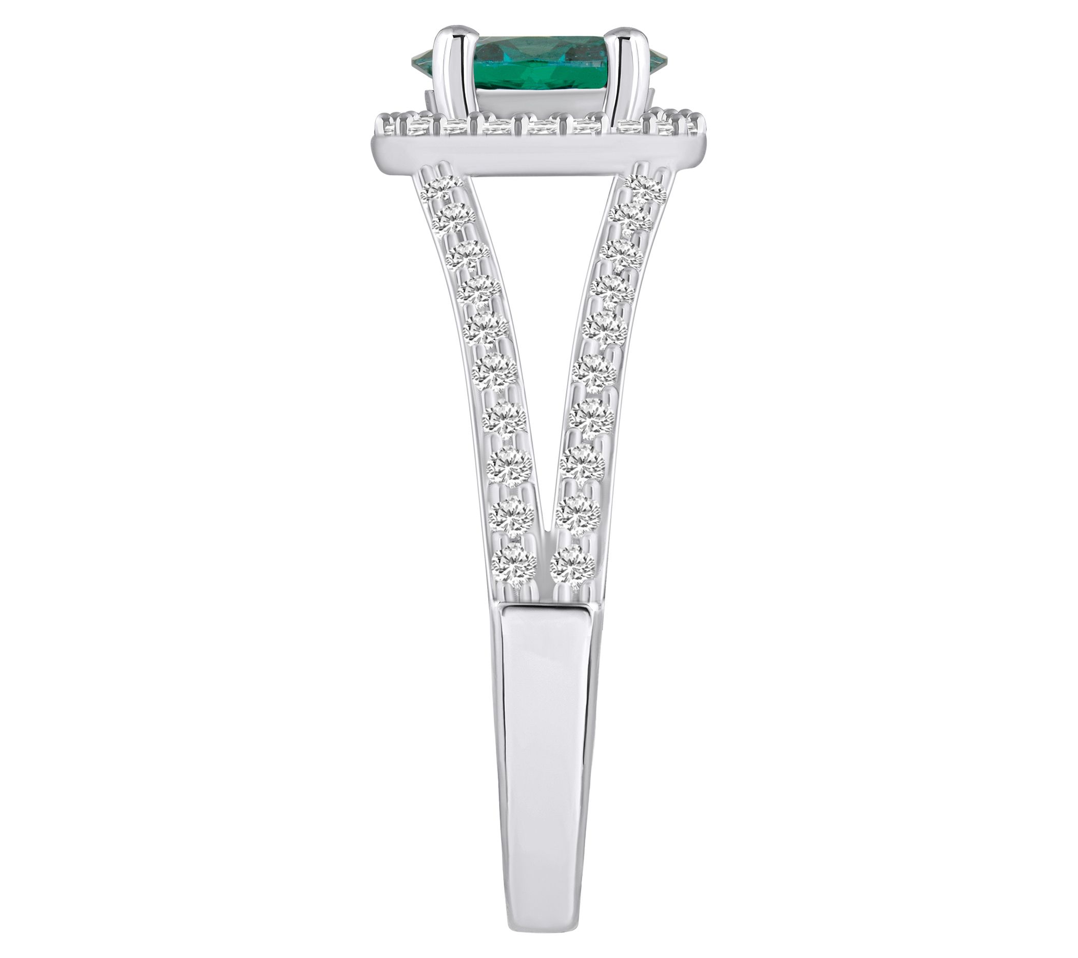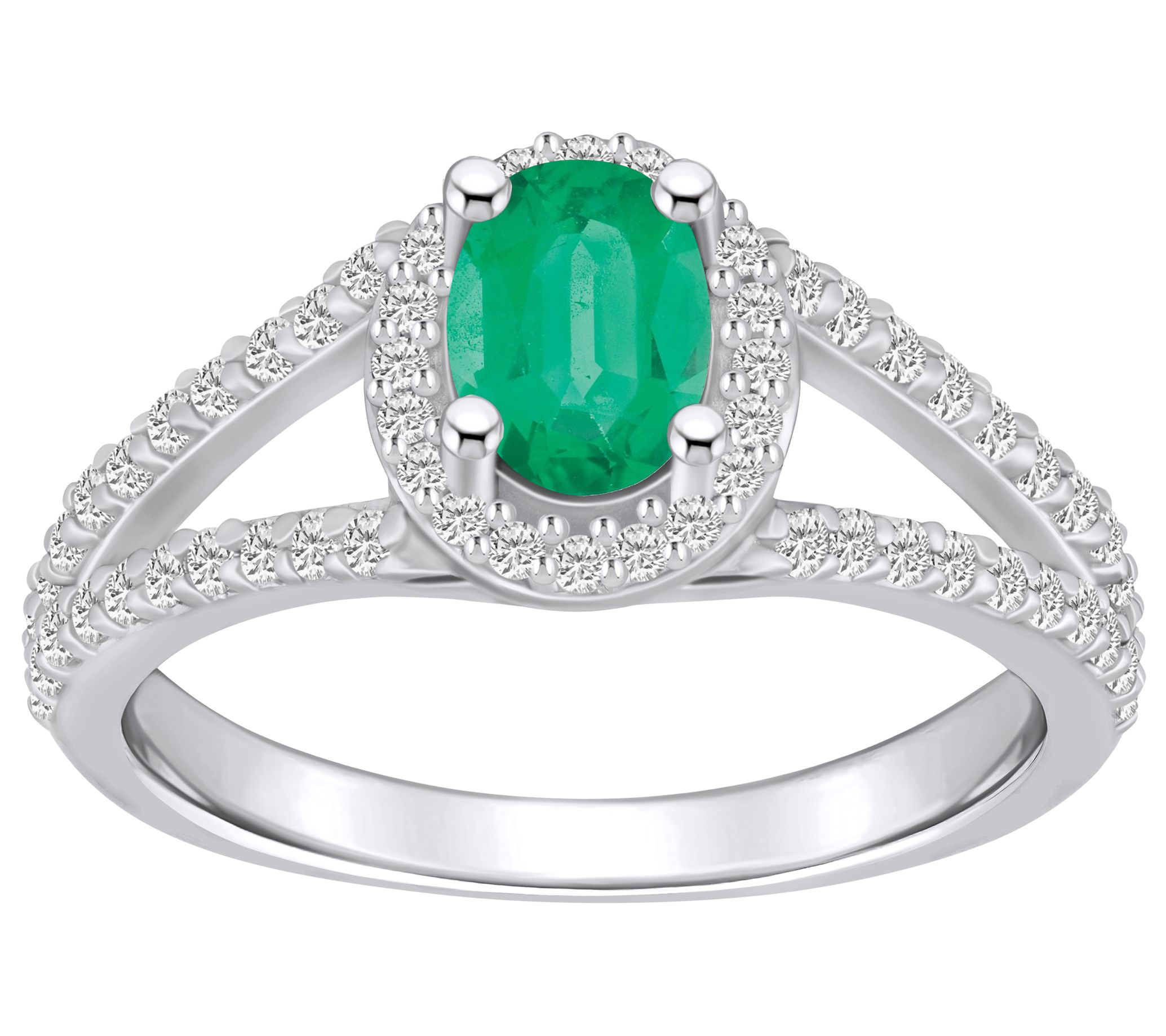 - Prong-set, round gemstone with a halo of prong-set, round diamonds and prong-set round diamond accents on the split shank