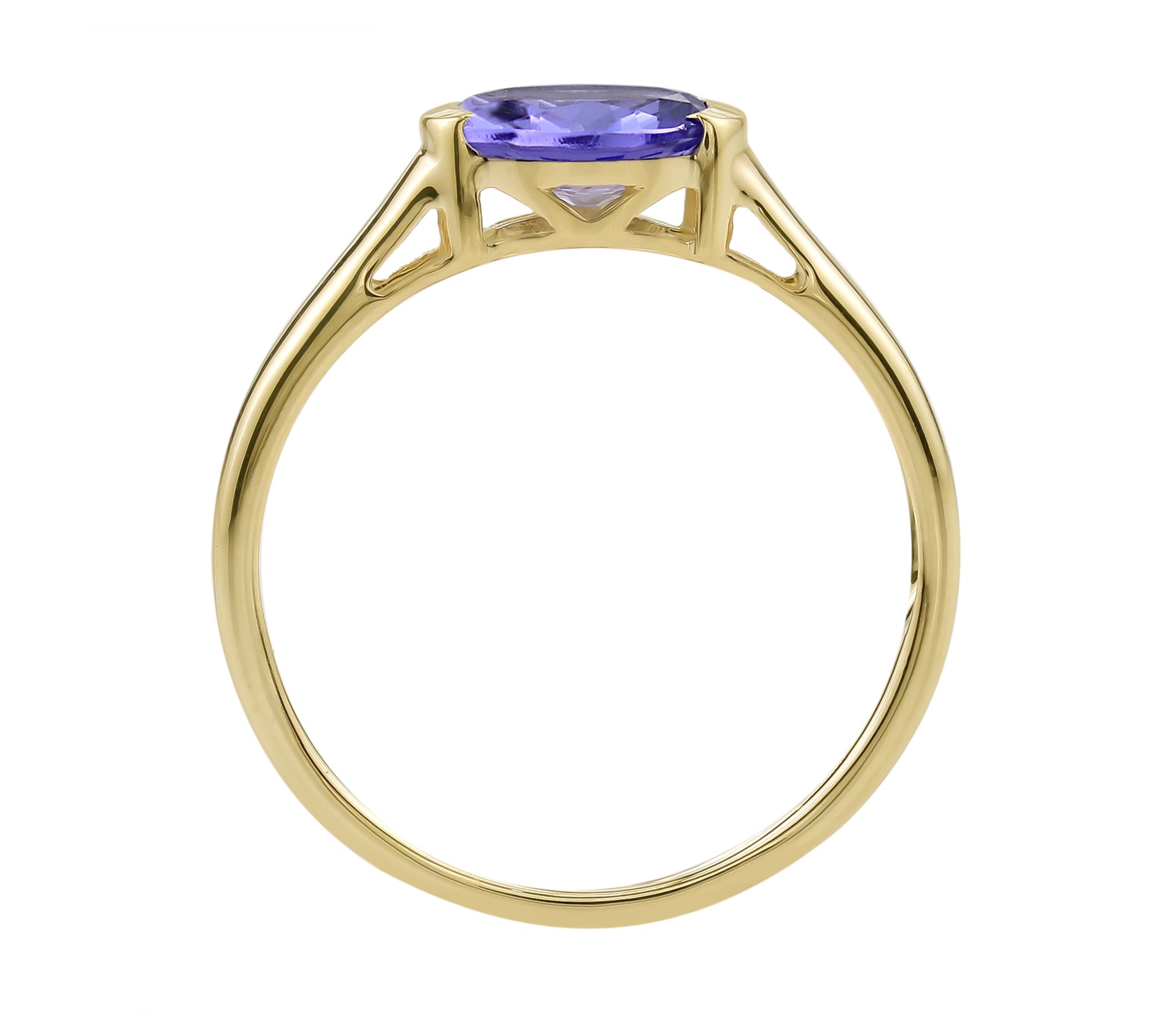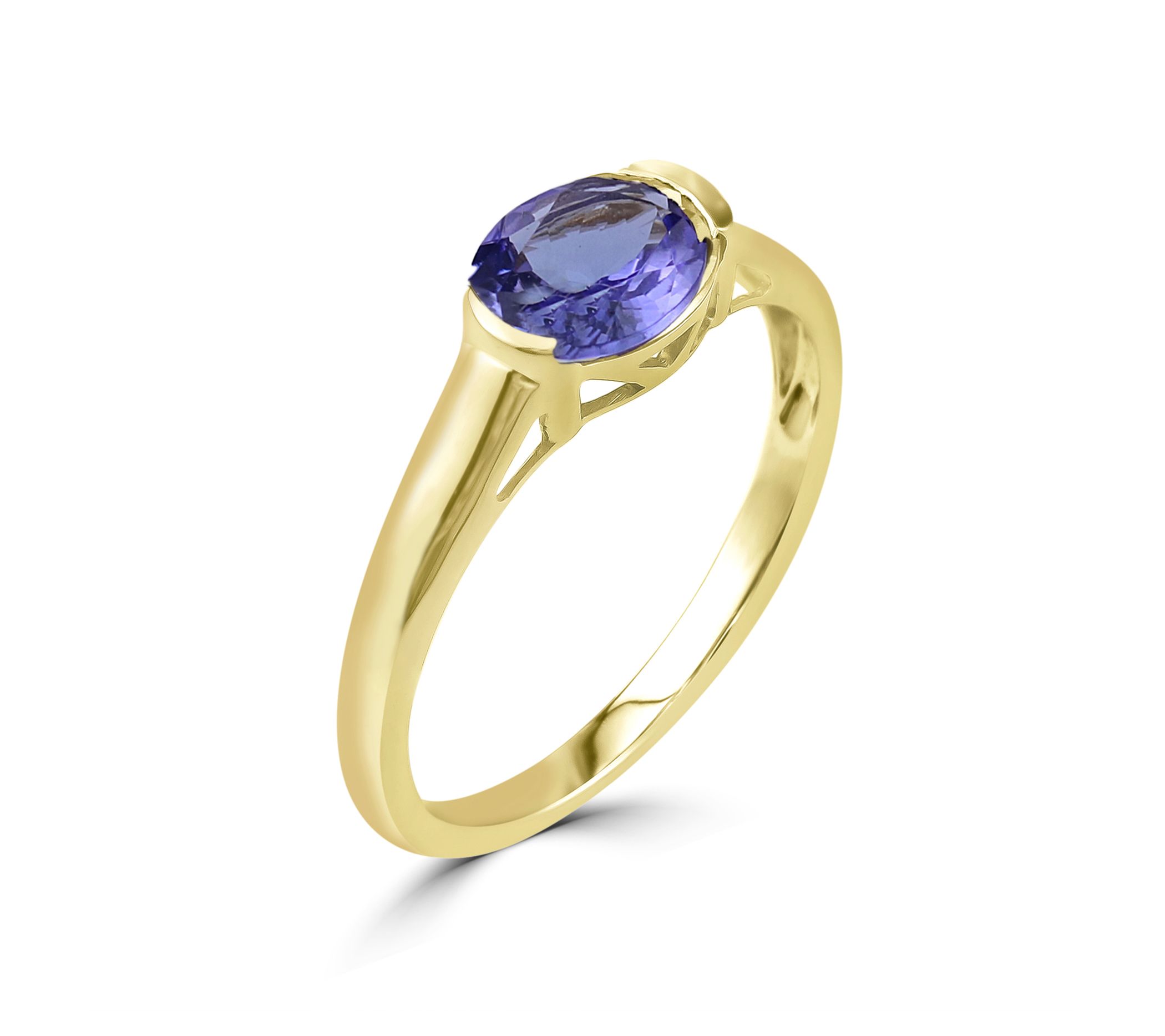 • Bezel-set, oval-cut gemstone; tapered shank; polished finish