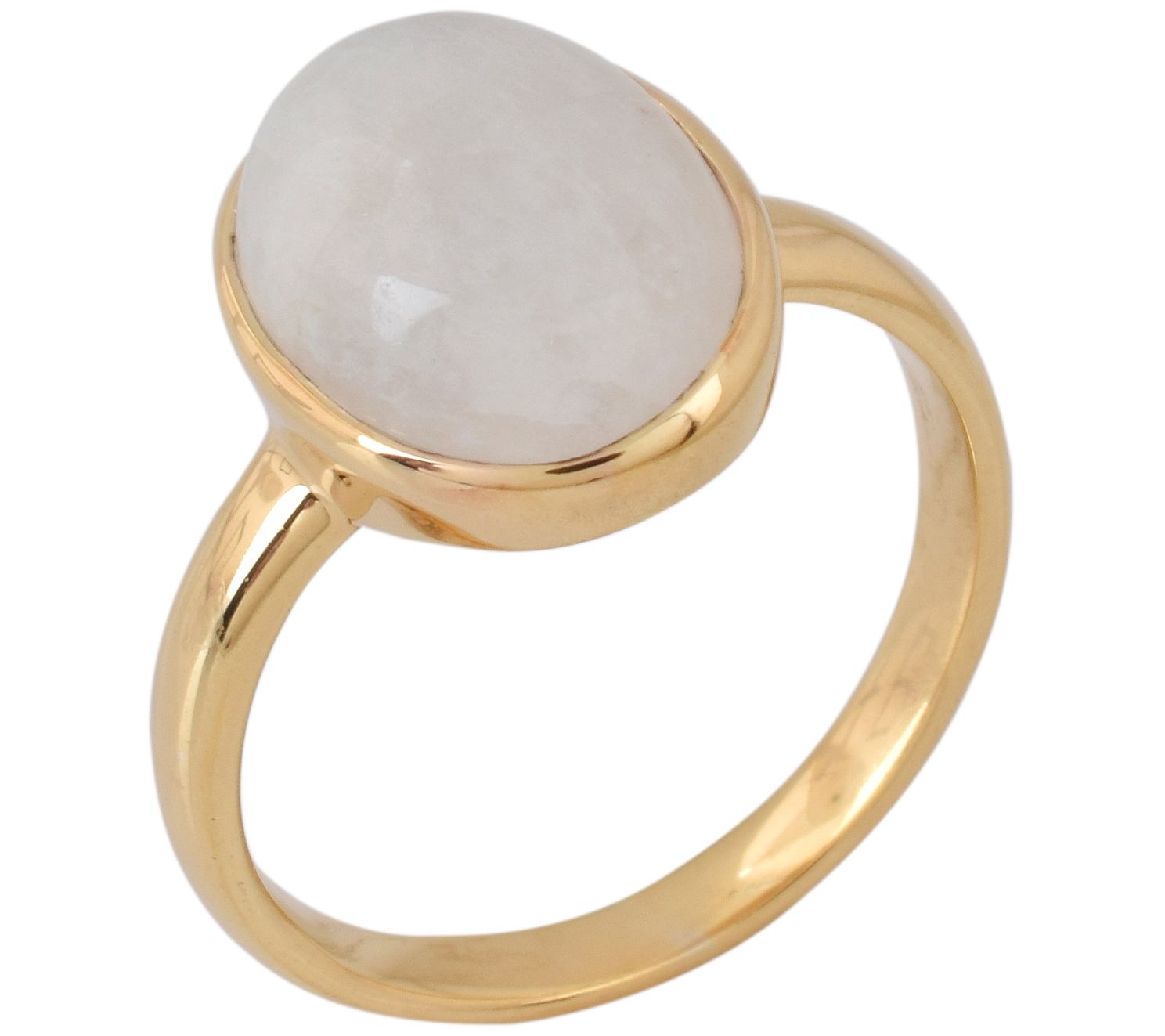 Solitaire ring with oval-cut, bezel-set rainbow moonstone cabochon