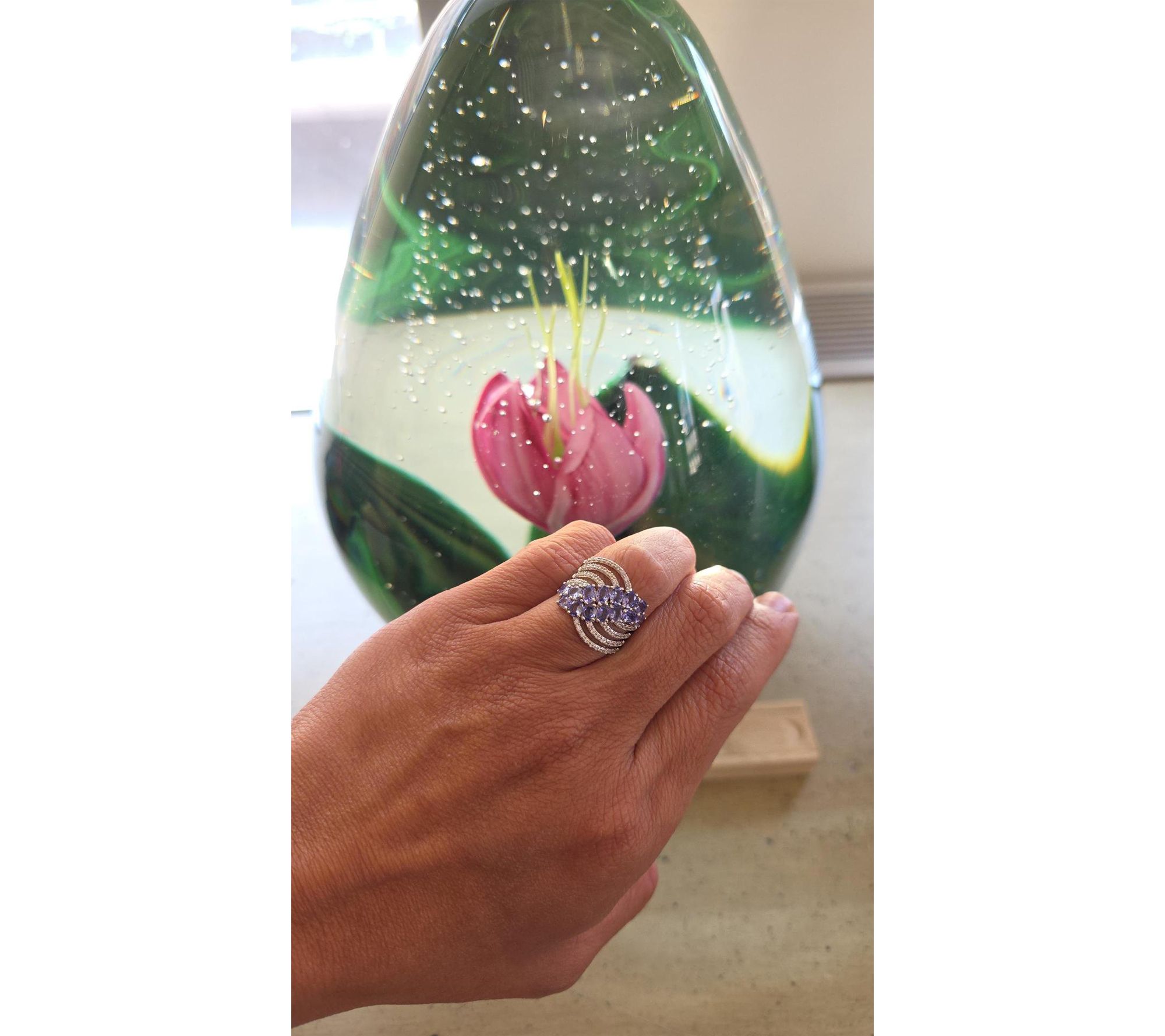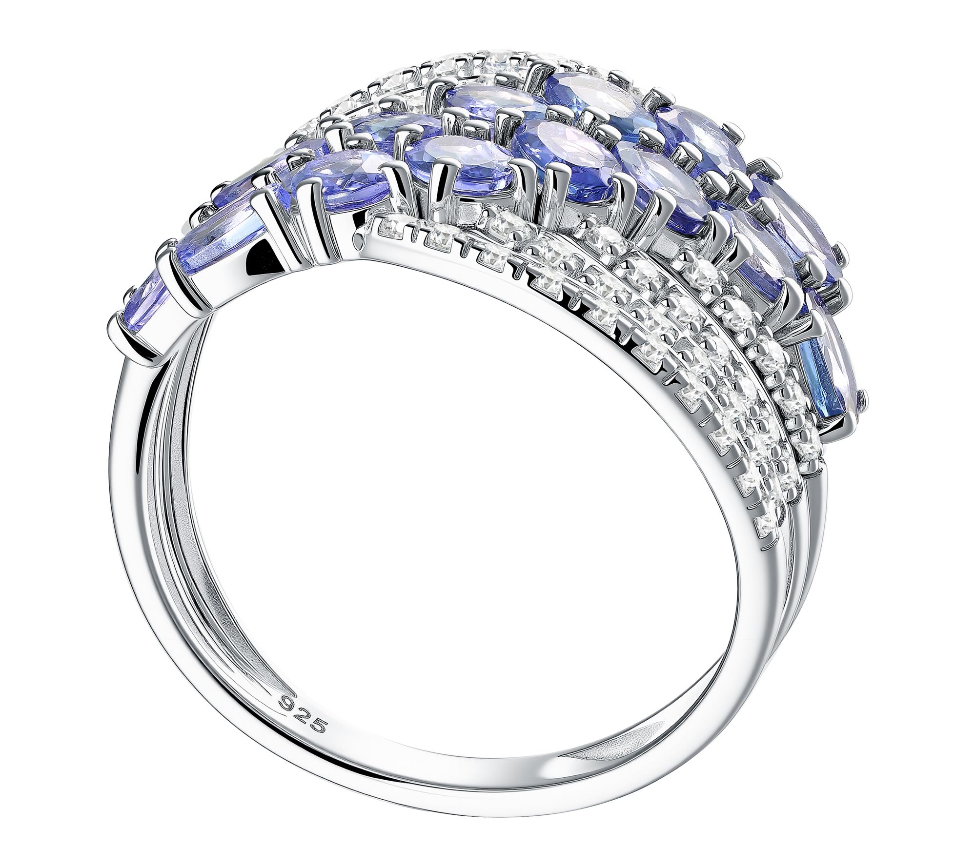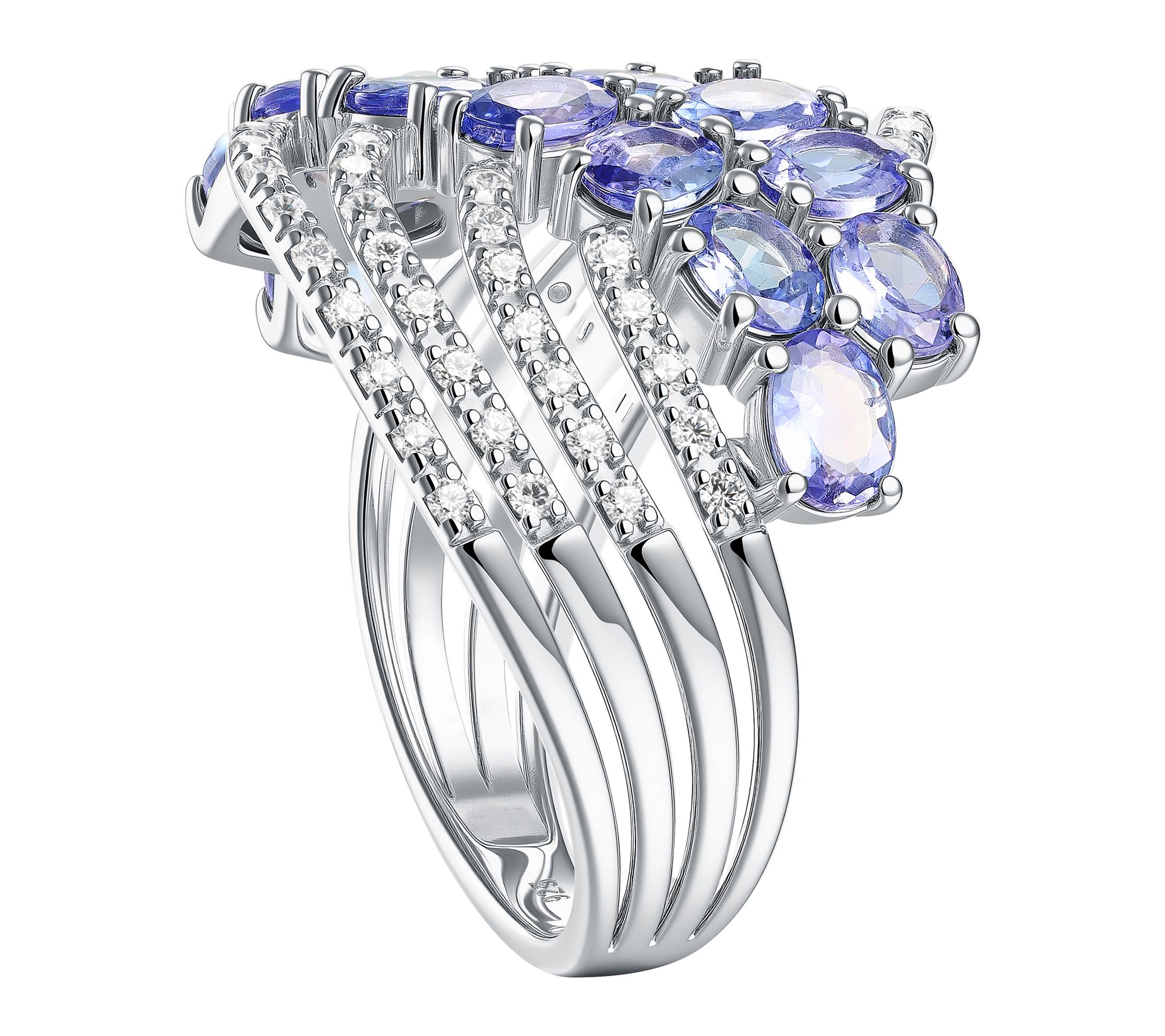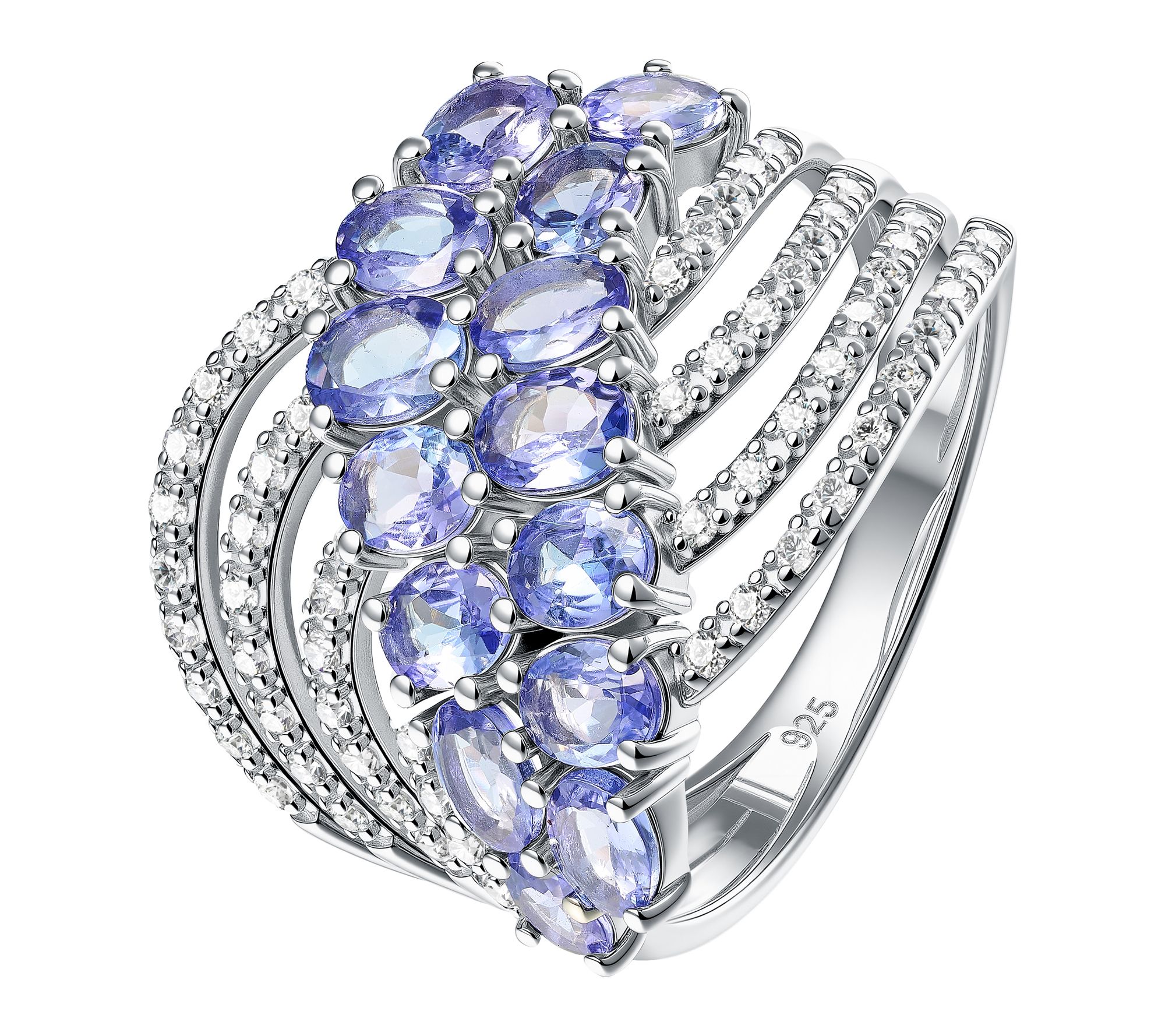 Two rows of oval-cut, prong-set pastel tanzanite gemstones with pave-set white zircon; cascading multi-row design