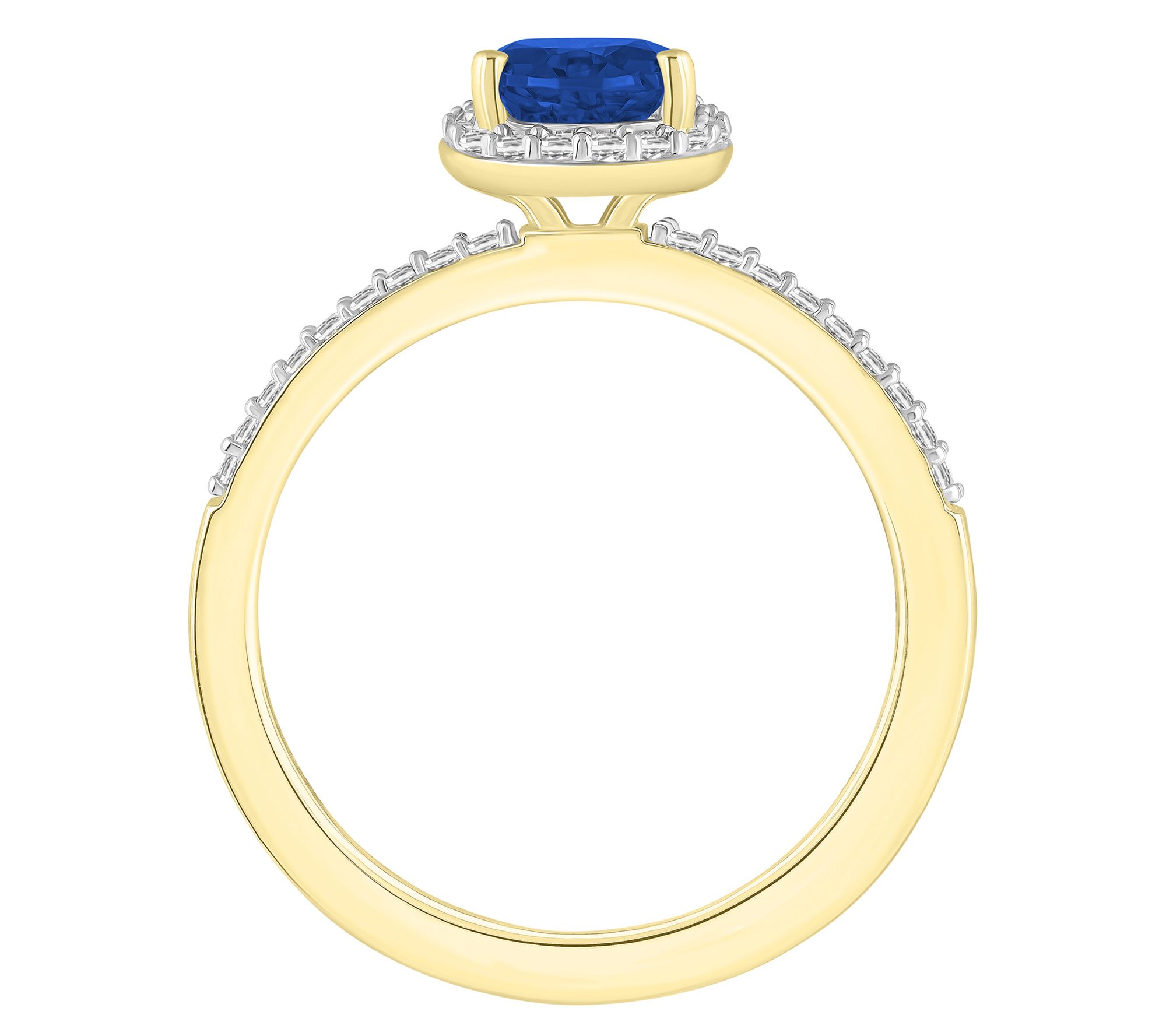 Pear-shaped created gemstone; created white sapphire halo; prong setting