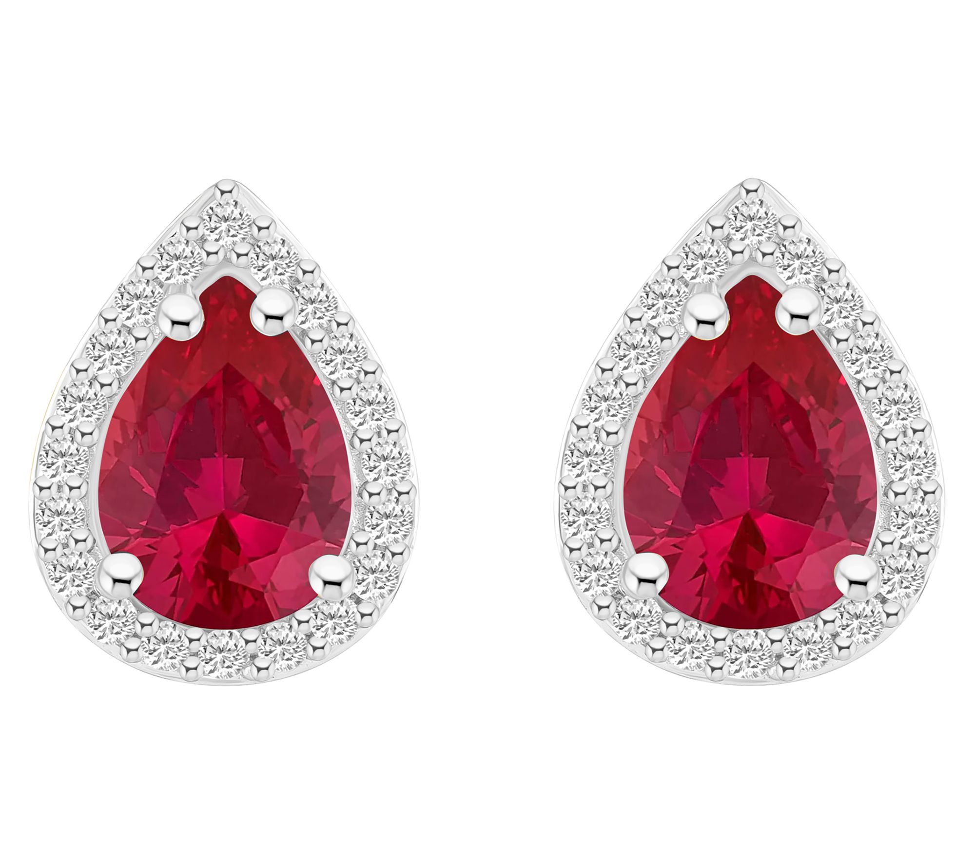Elevate your style with these stunning stud earrings featuring a pair of pear-cut created gemstones delicately surrounded by a halo of created white sapphires. From Affinity® Gems.