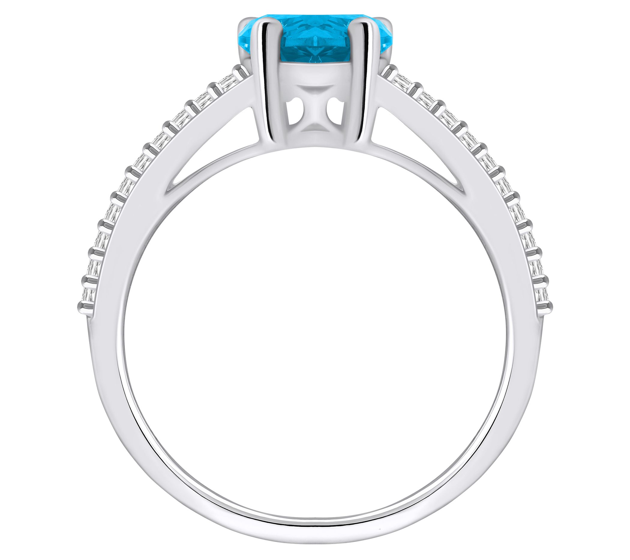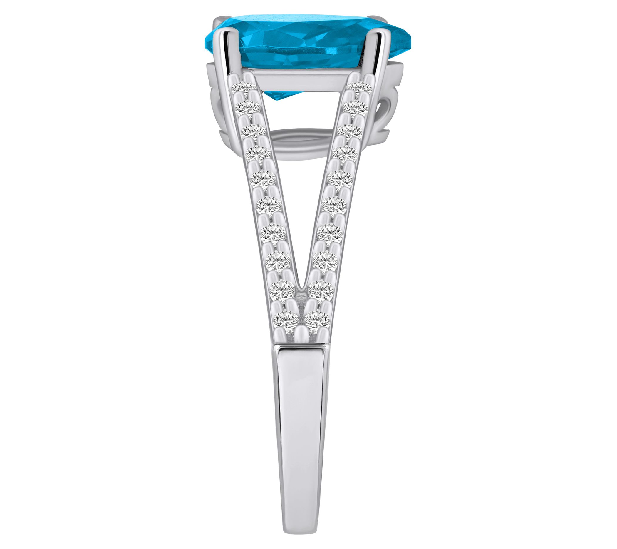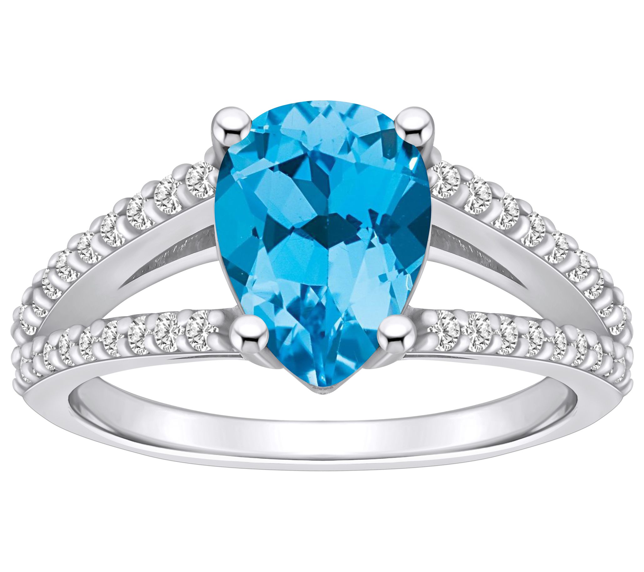 - Center pear-cut gemstone; split shank with diamond accents