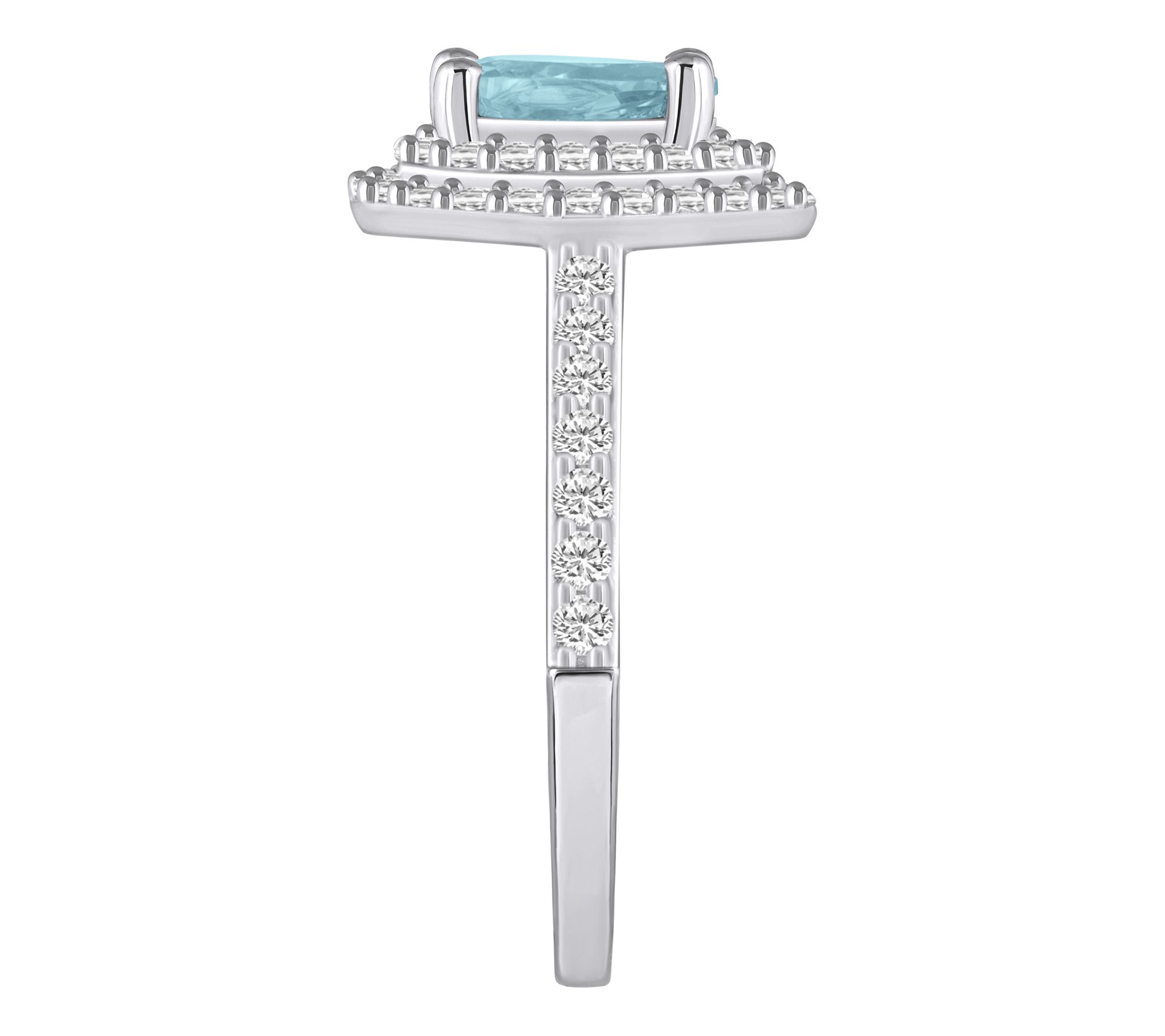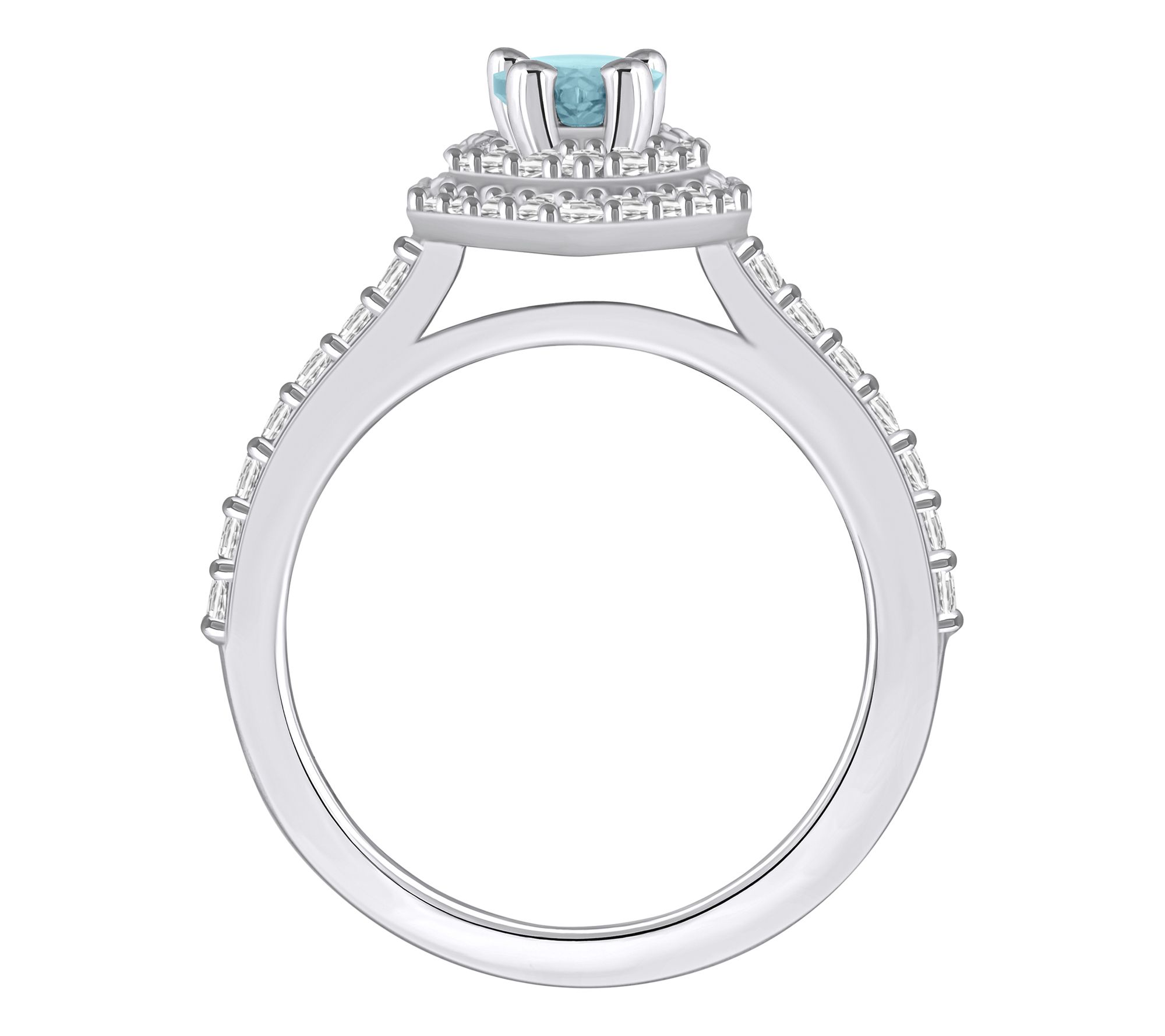 Pear-shaped gemstone; double halo of diamonds; diamond accents on the shank; prong setting