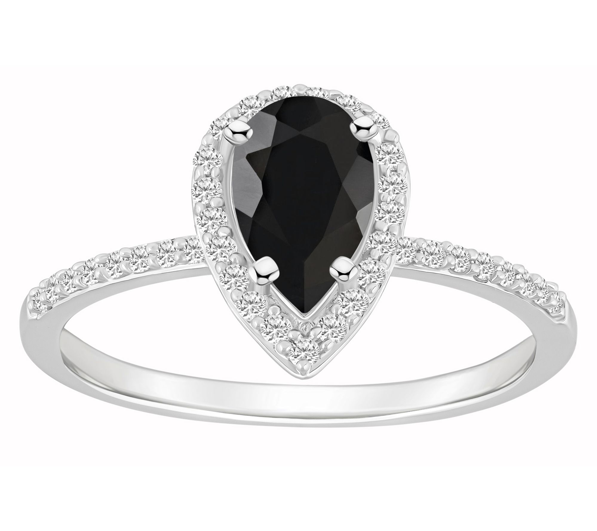 Enhance any outfit with this stunning pear onyx ring, surrounded by a shimmering halo of created white sapphires. Perfect for both casual and formal occasions, this ring adds a touch of elegance and sophistication to your look. From Affinity Gems.