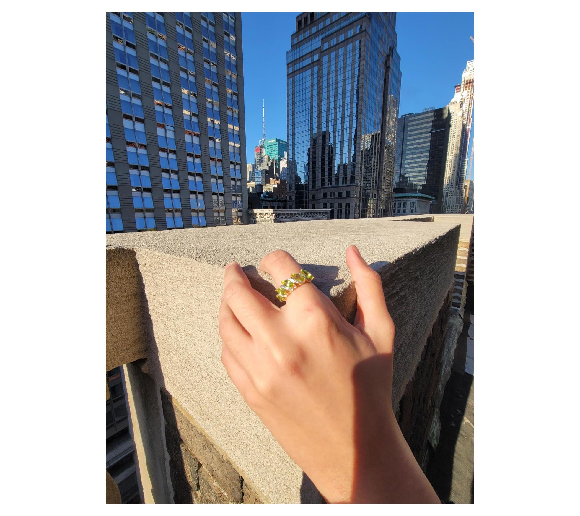 Brighten up any outfit with this peridot ring. This vibrant piece showcases marquise-shaped peridot gemstones complemented by sparkling white zircon accents. Perfect for a night out or a special occasion. From Affinity® Gems.