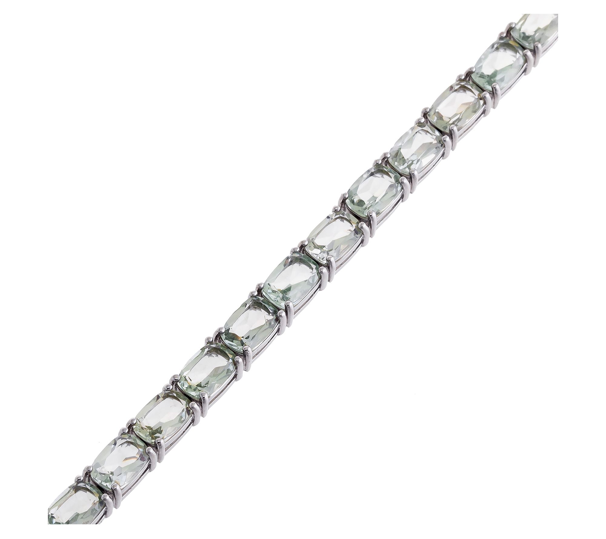 Showcasing a lovely line-up of cushion-cut, prong-set prasiolite gemstones, this stunning tennis bracelet elevates your accessory game in sophisticated style. From Affinity Gems.