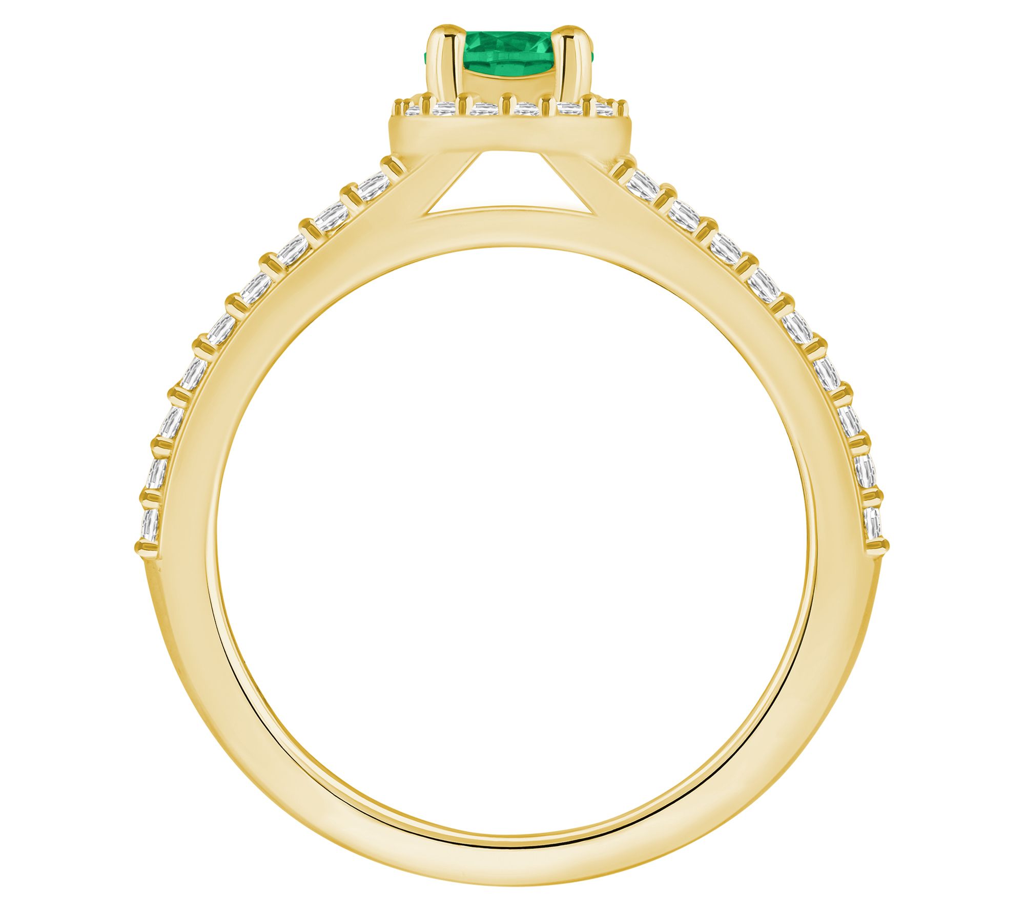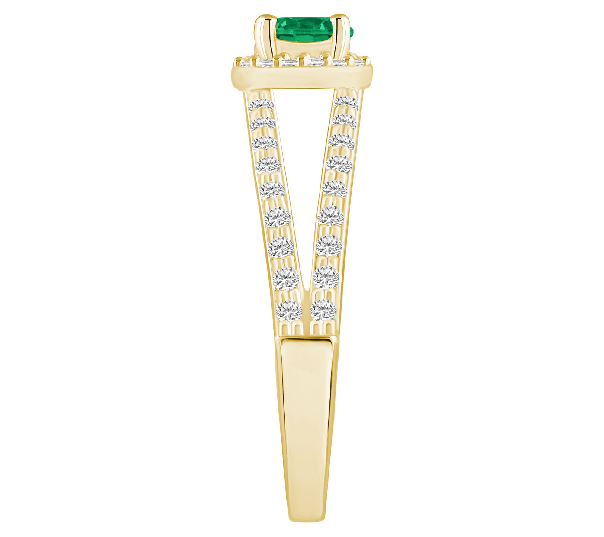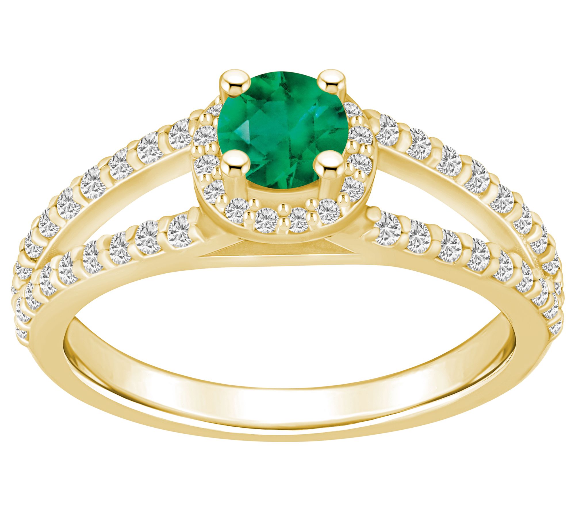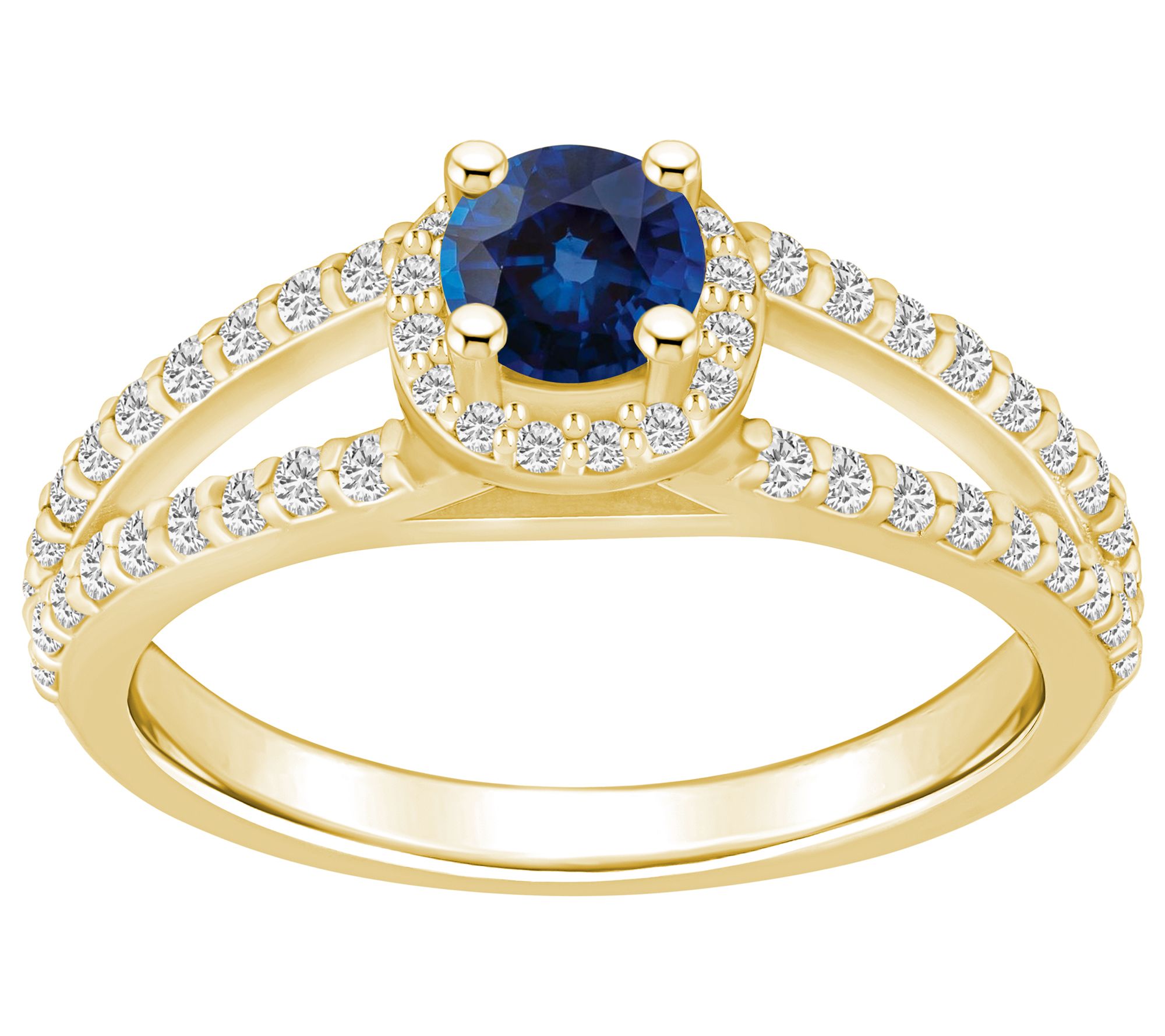 Steal the spotlight with this striking 14K gold ring, fashioned with a prong-set, round gemstone at the center surrounded by a halo of prong-set, round diamonds. A glittering procession of prong-set, round diamond accents decorates the split shank to finish off this gorgeous piece. From Affinity® Gems.