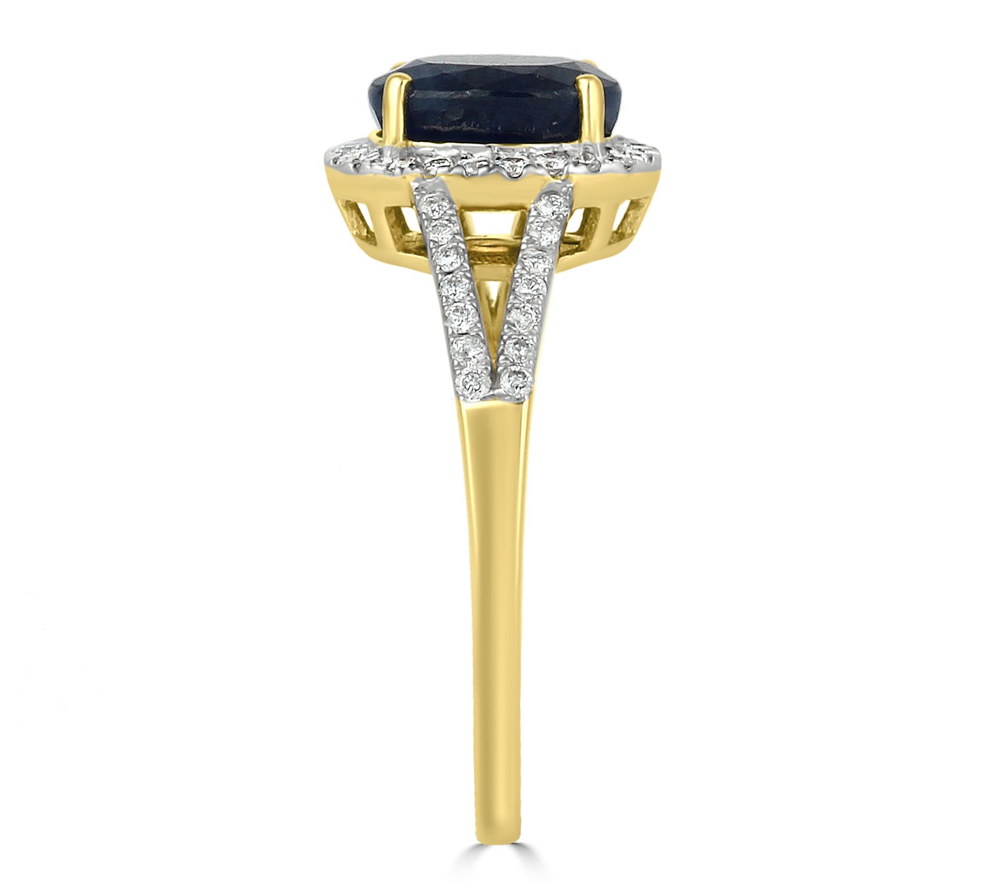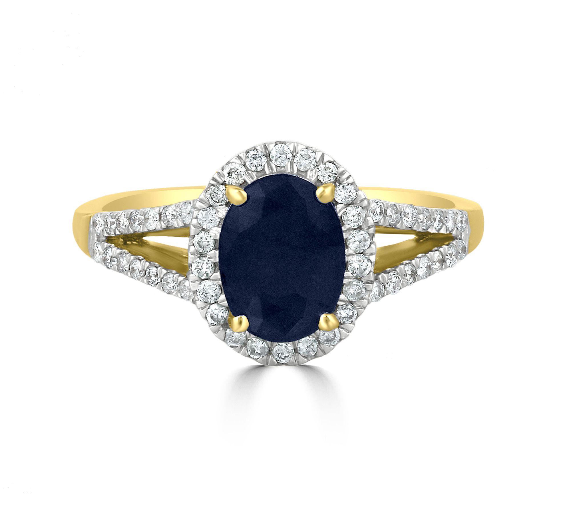 • Prong-set, oval-cut center gemstone; micro-pave, round-cut diamond halo; split shank with micro-pave diamonds on top of shank