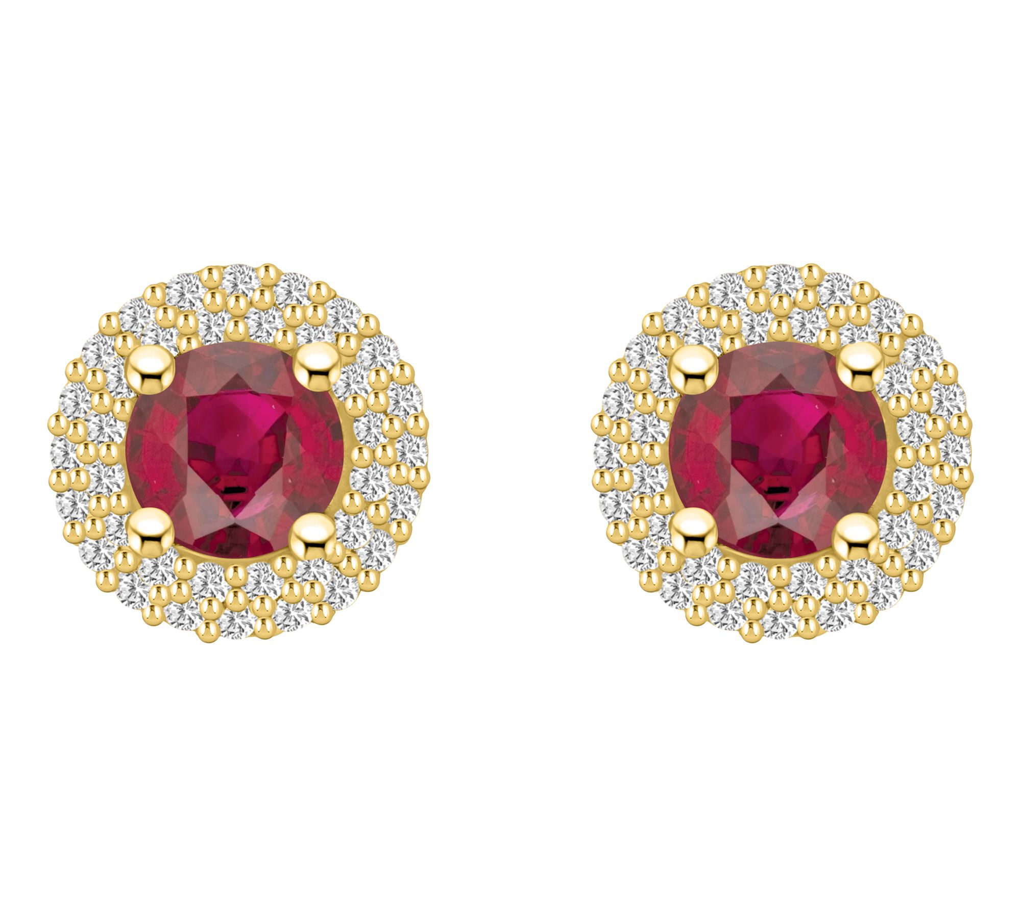 • Round gemstones; prong and pave settings; double halo of diamonds