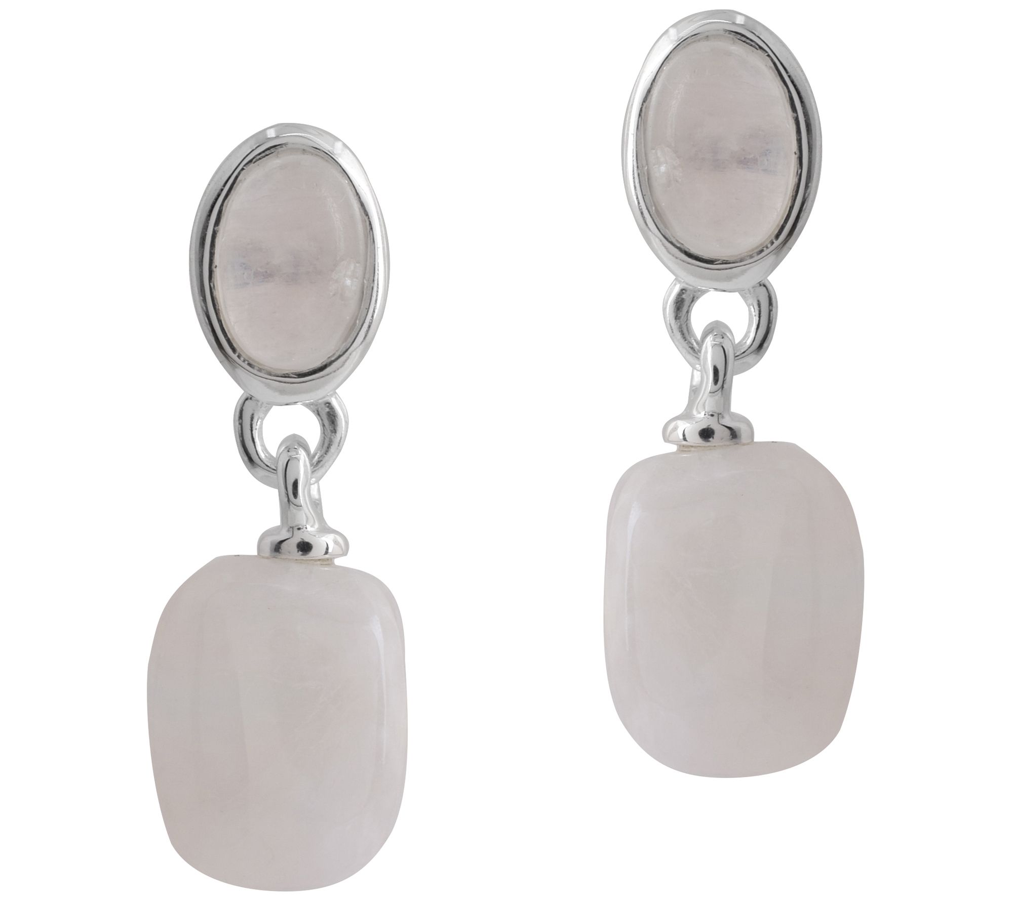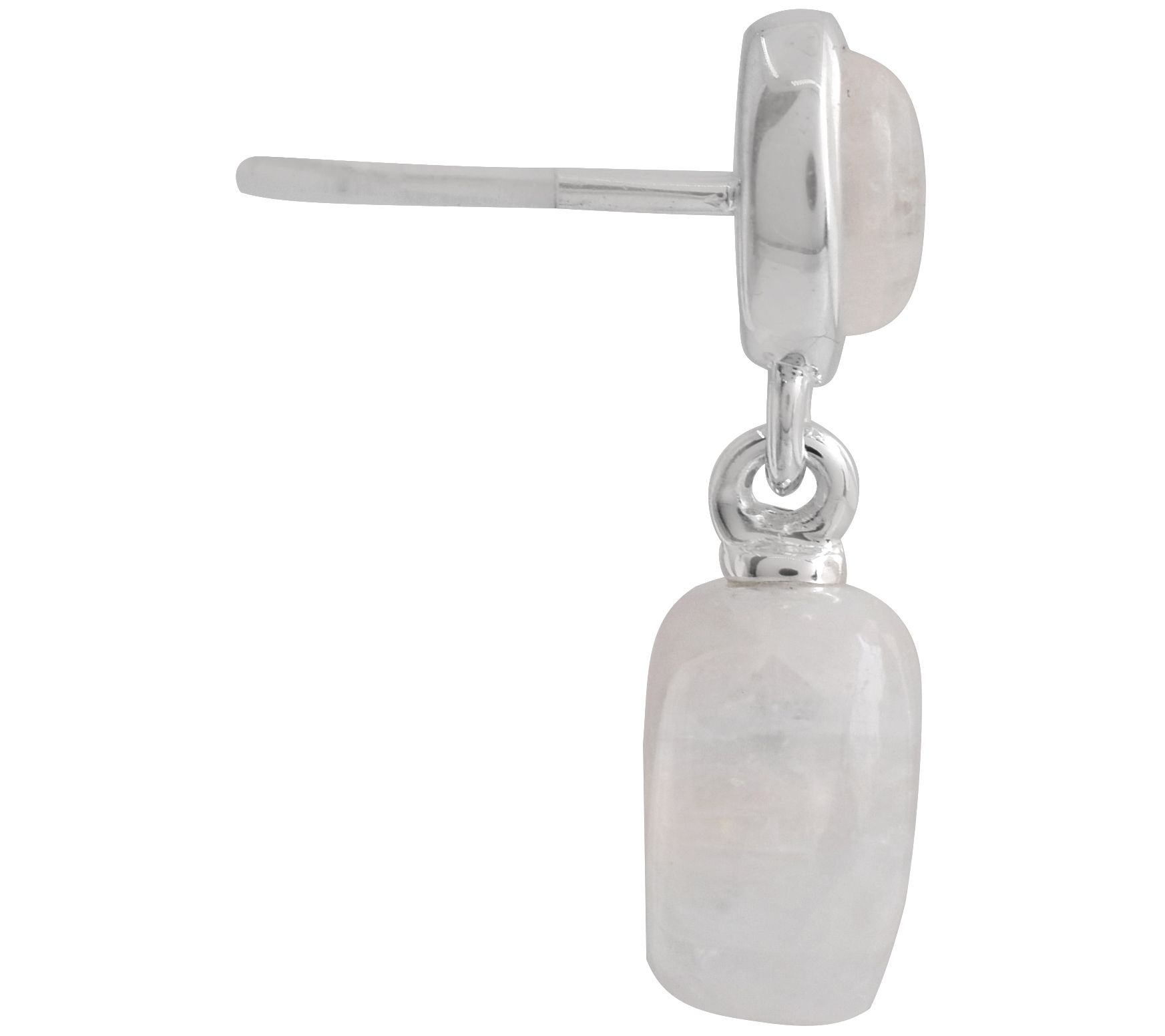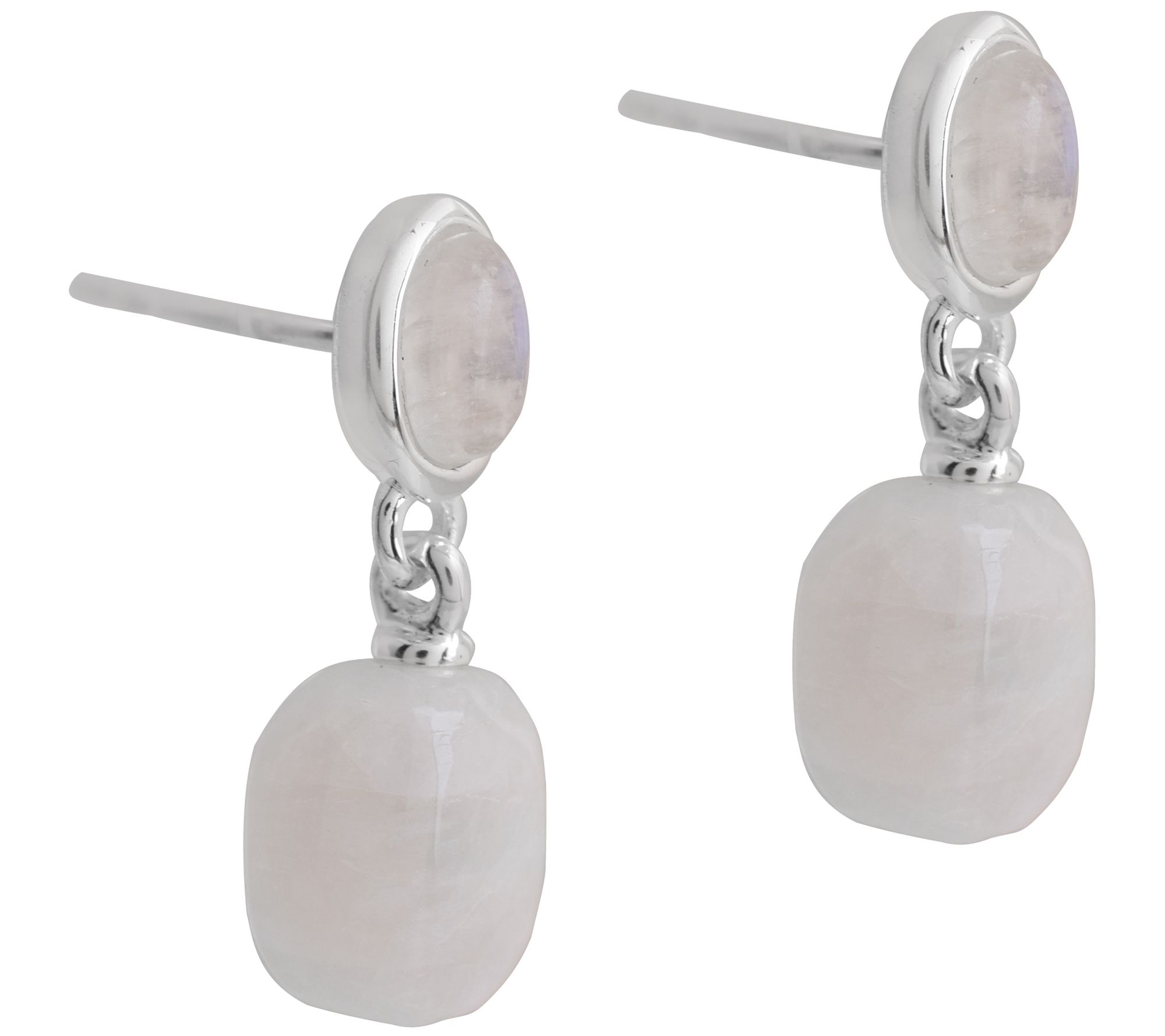 • Dangling rainbow moonstone beads; oval bezel-set rainbow moonstone cabochon on post