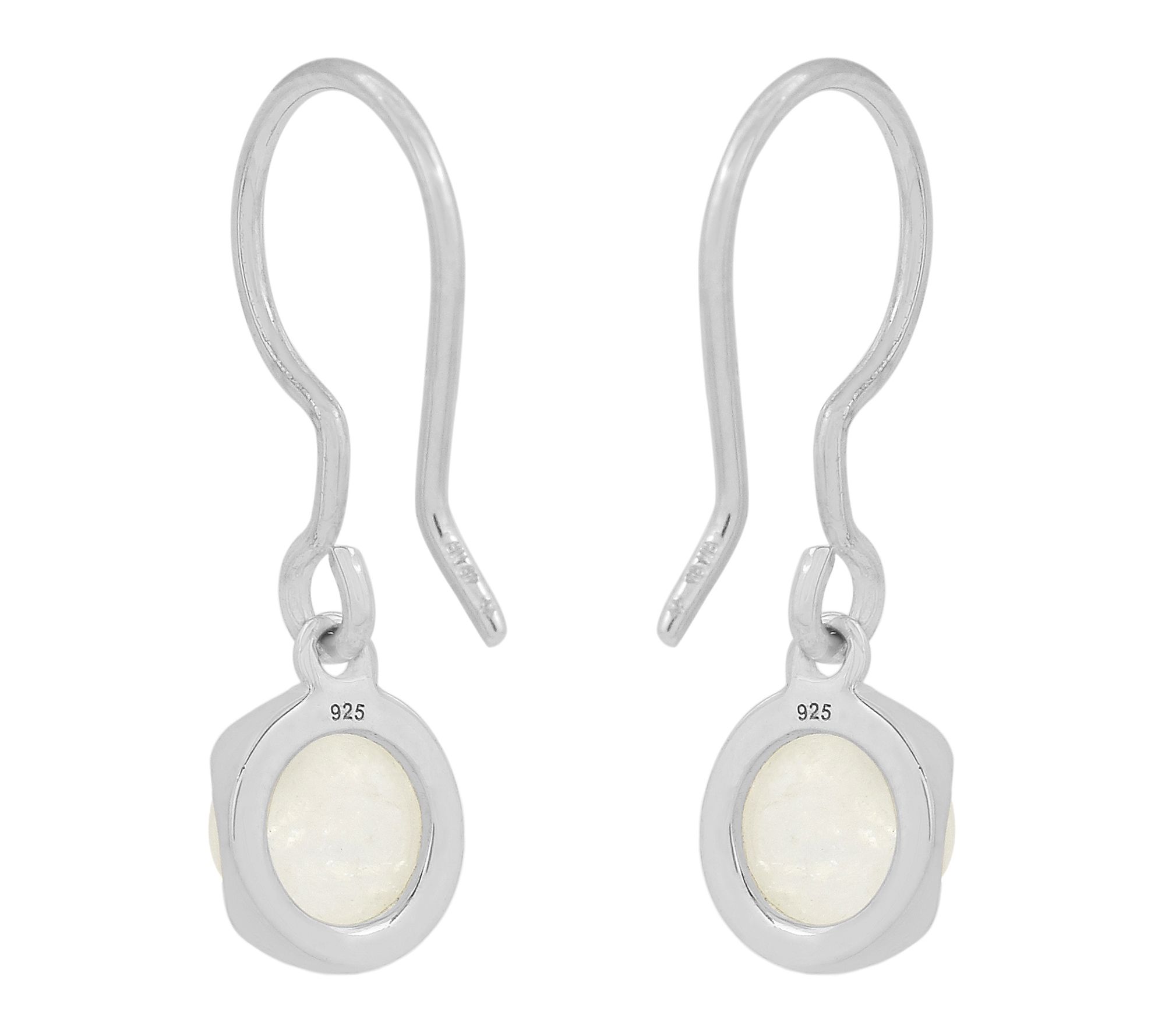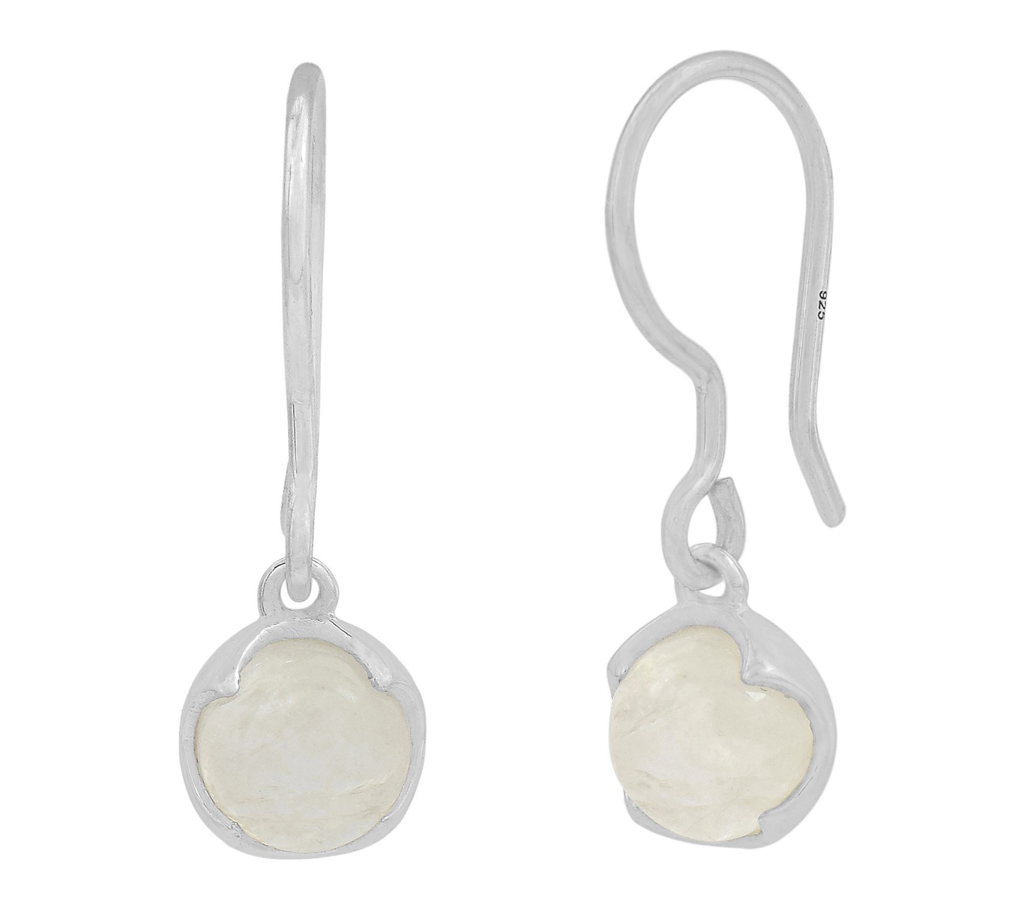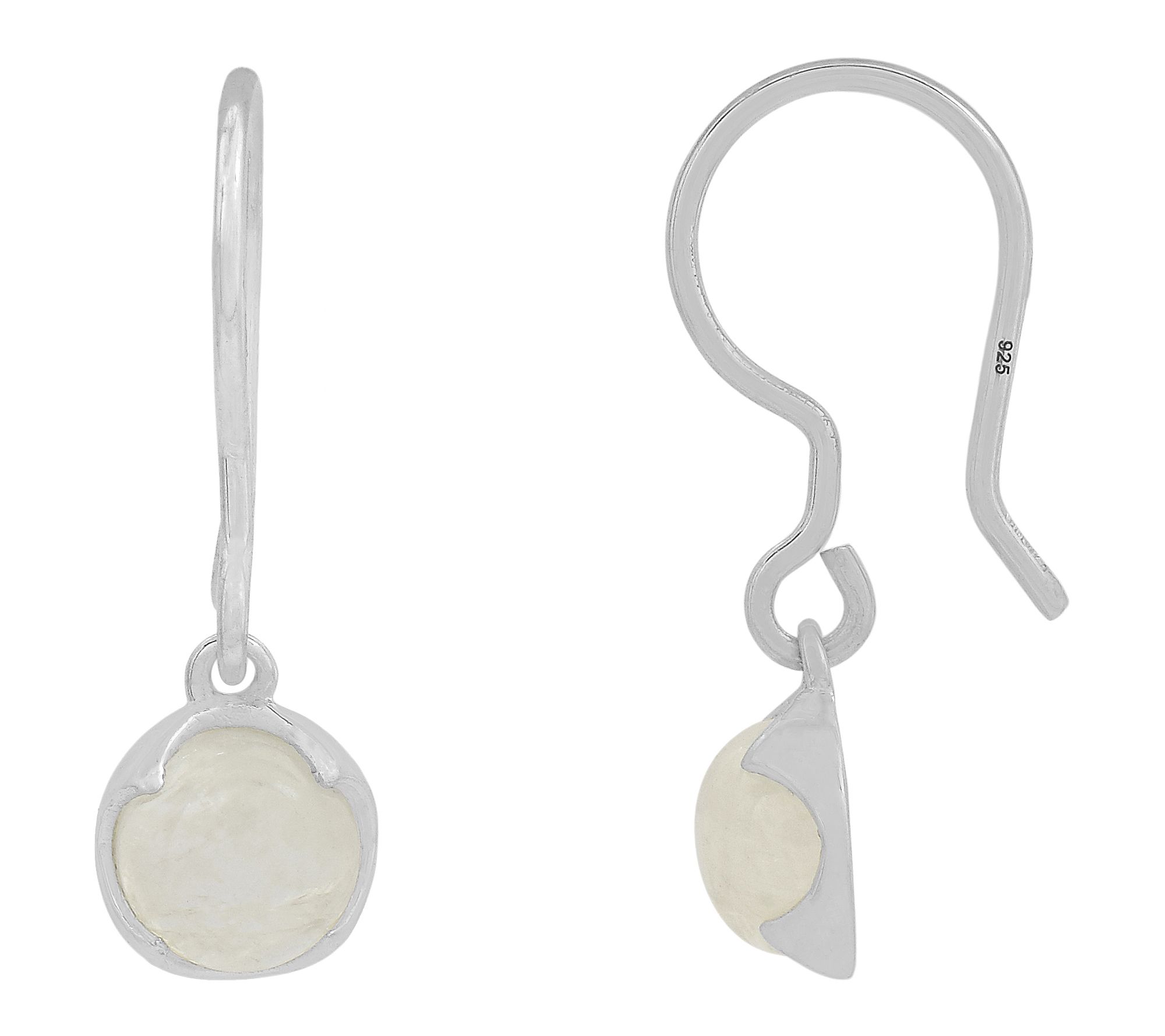 • Round cabochon rainbow moonstones; bezel set; dangle design