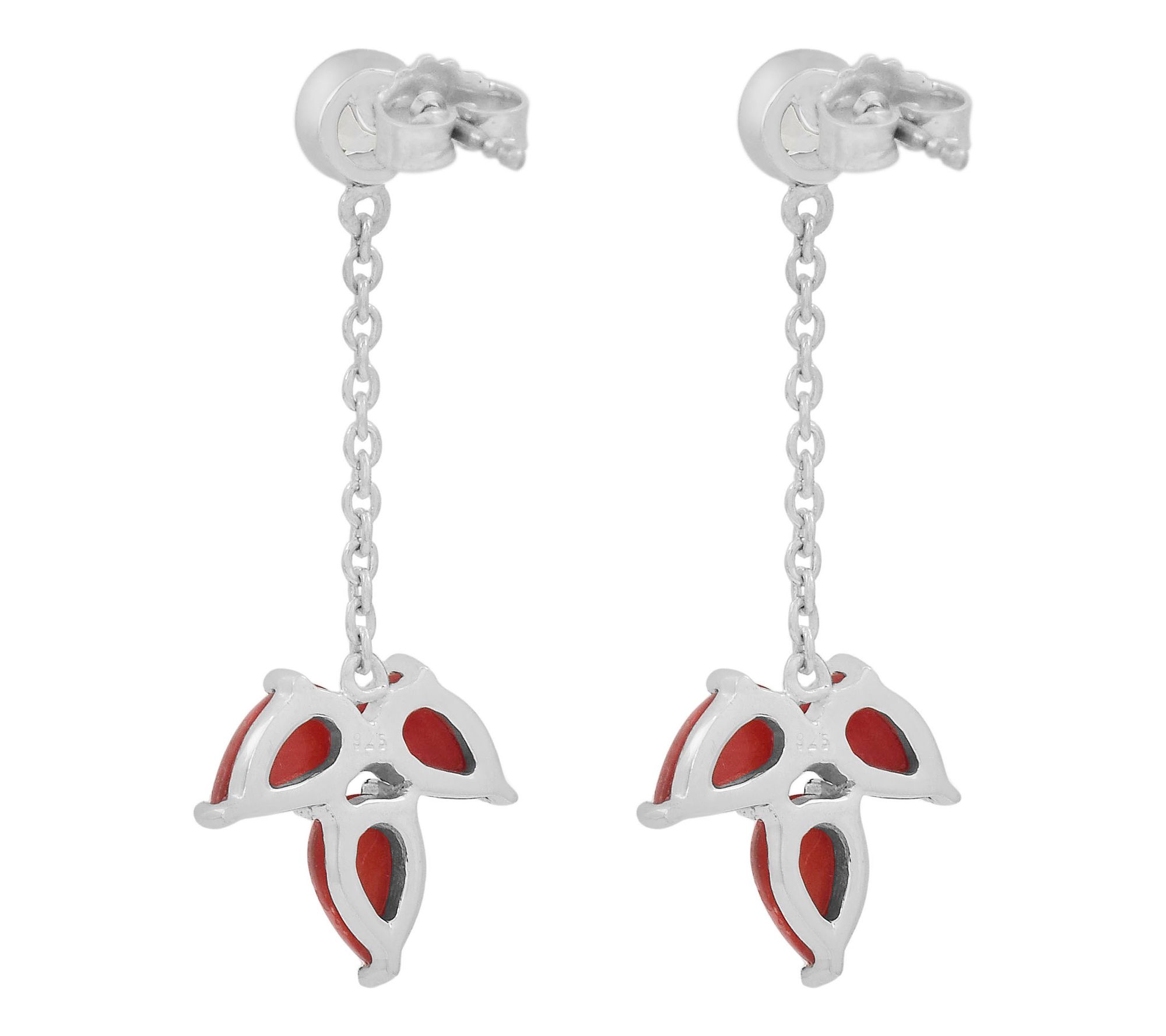 Dangling design; prong-set, pear-shaped red-dyed bamboo coral cabochon; round-cut, bezel-set white topaz gemstones; oval link chain design