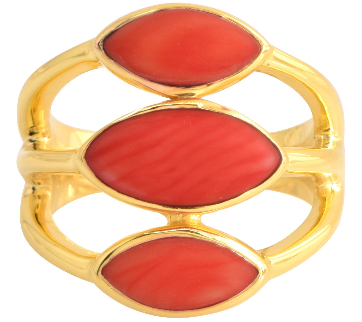 • Three marquise-cut, bezel-set red-dyed bamboo cabochons set in a line design