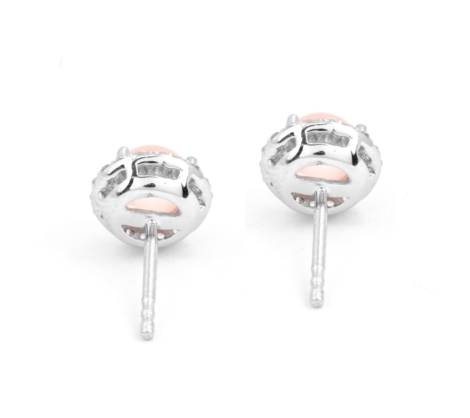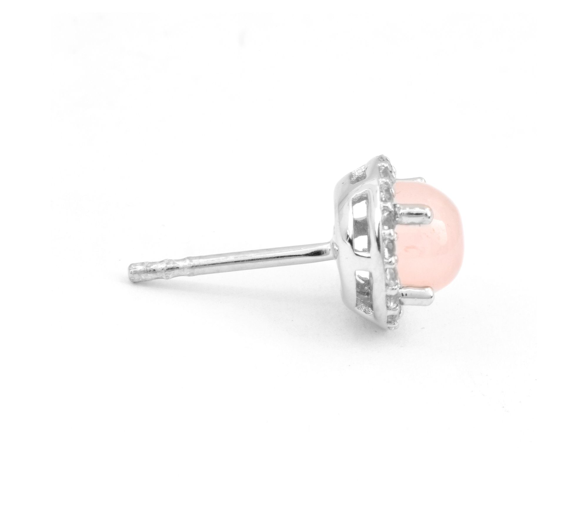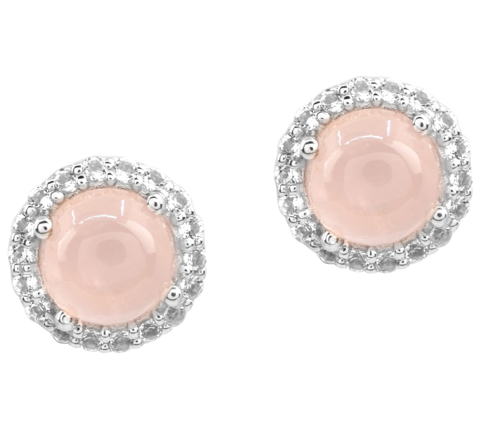 - Stud design; rose quartz cabochon center gemstone with a halo of prong-set white topaz gemstones
