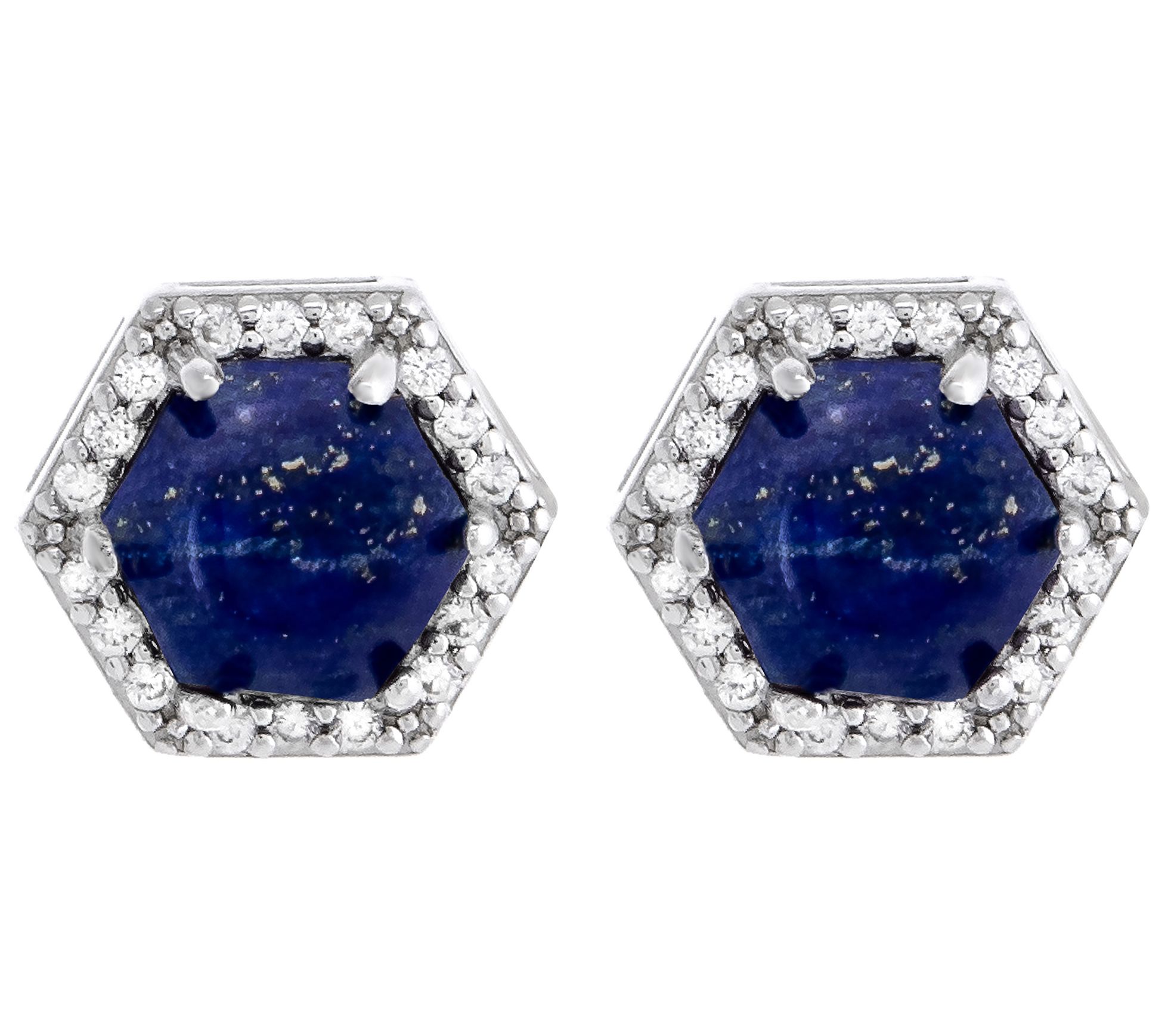 • Hexagon-cut, prong-set gemstone surrounded by a halo of white zircon