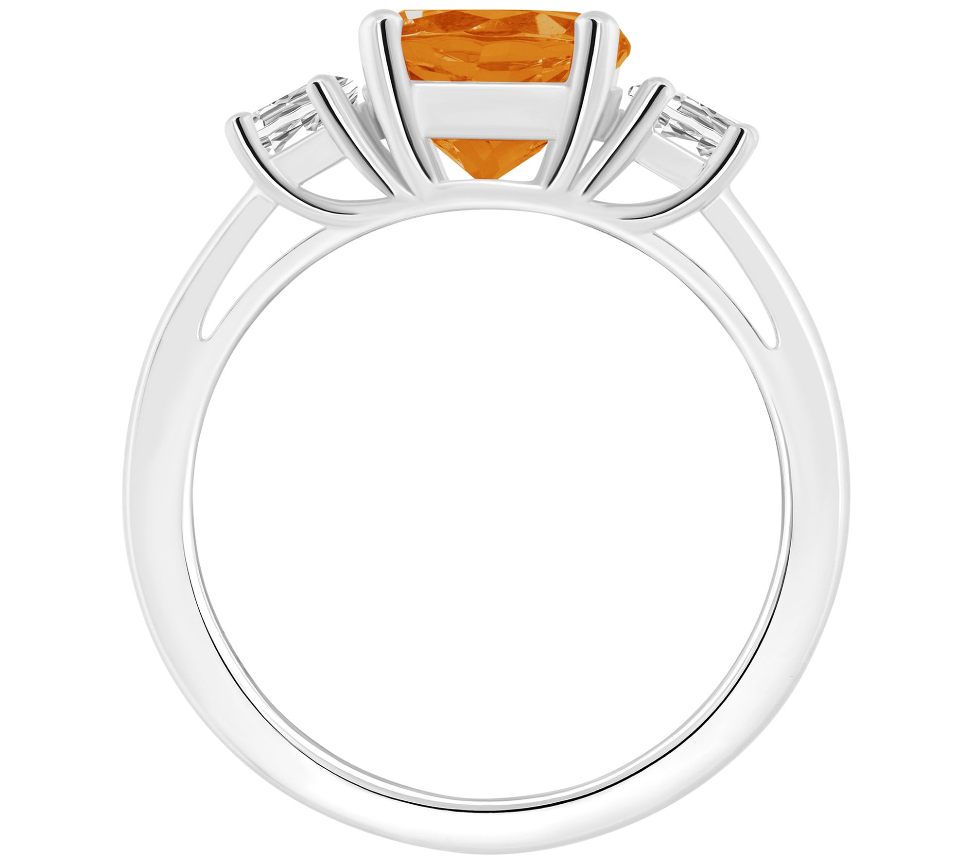 • Round-cut prong-set gemstone center flanked by two white topaz gems