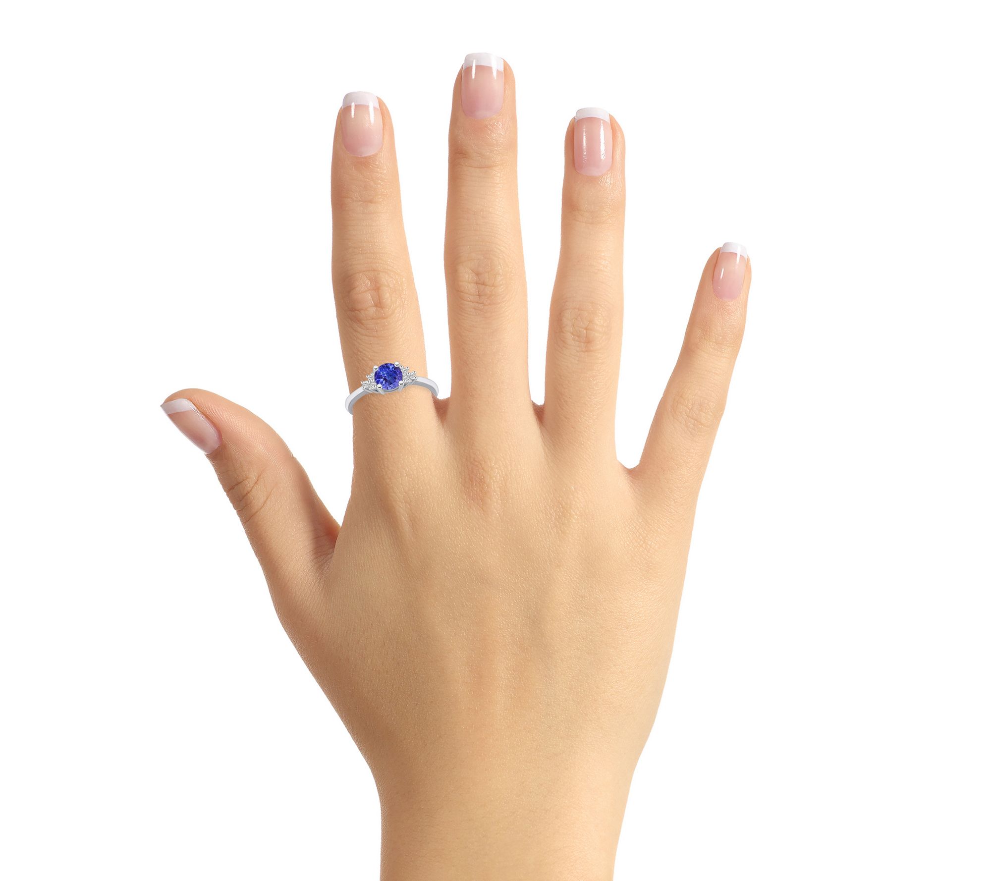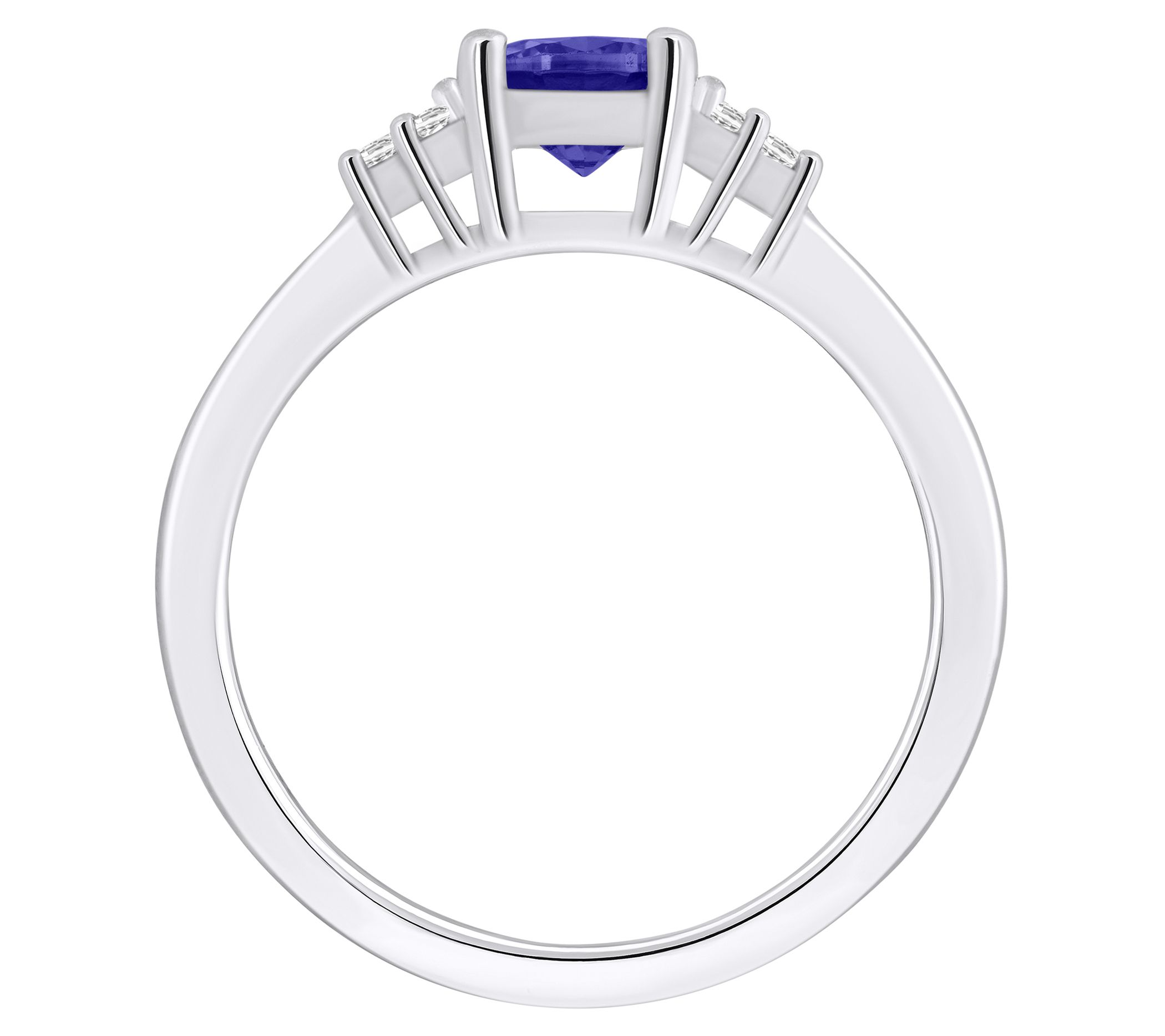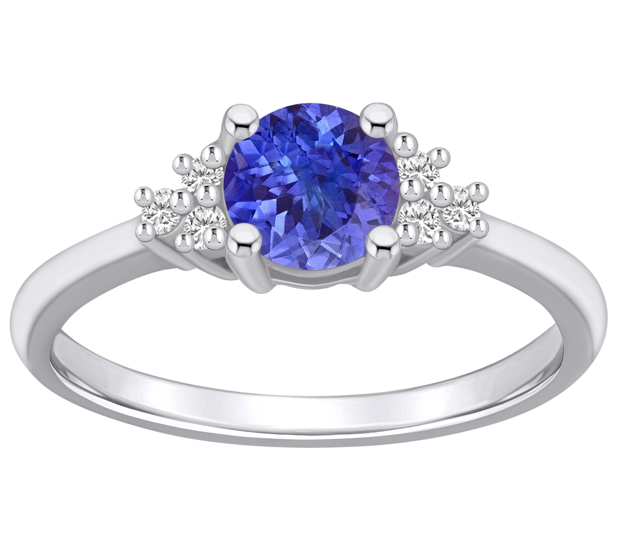 - Center round-cut tanzanite with three diamonds on each side