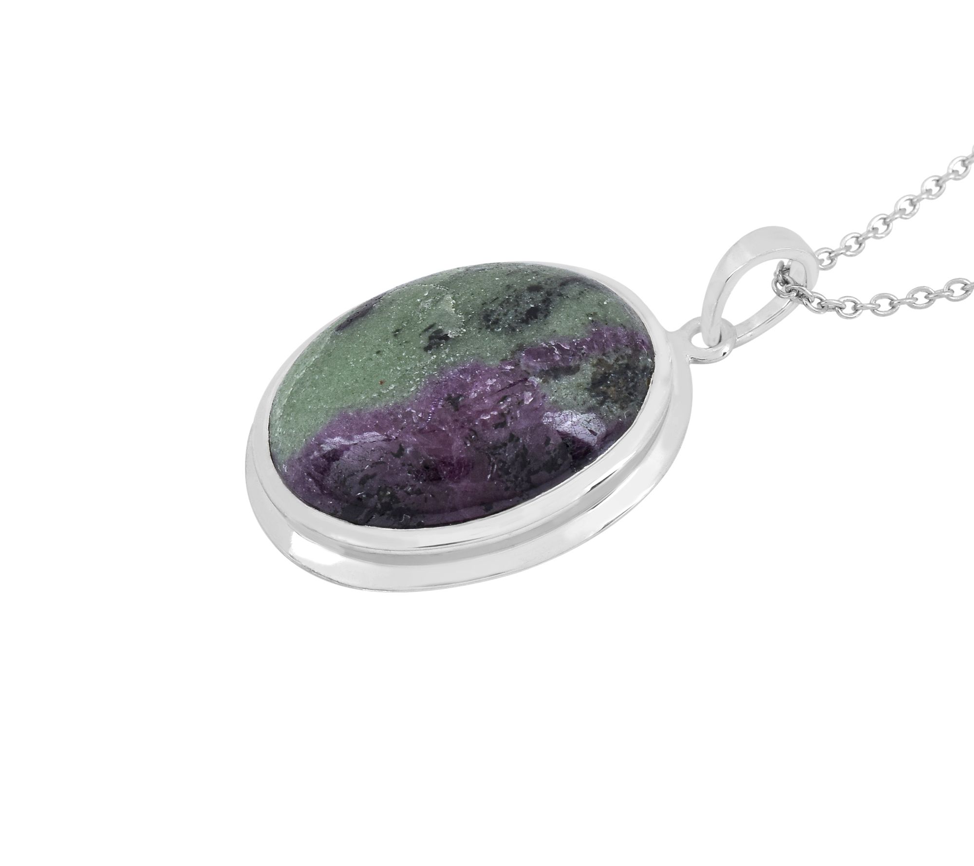 A striking blend of color and artistry, this necklace showcases a vibrant oval ruby zoisite pendant. The eye-catching cabochon is paired with a sleek platinum-plated sterling silver chain, making it an ideal accessory for adding a pop of personality to both casual and dressy looks. From Affinity® Gems.