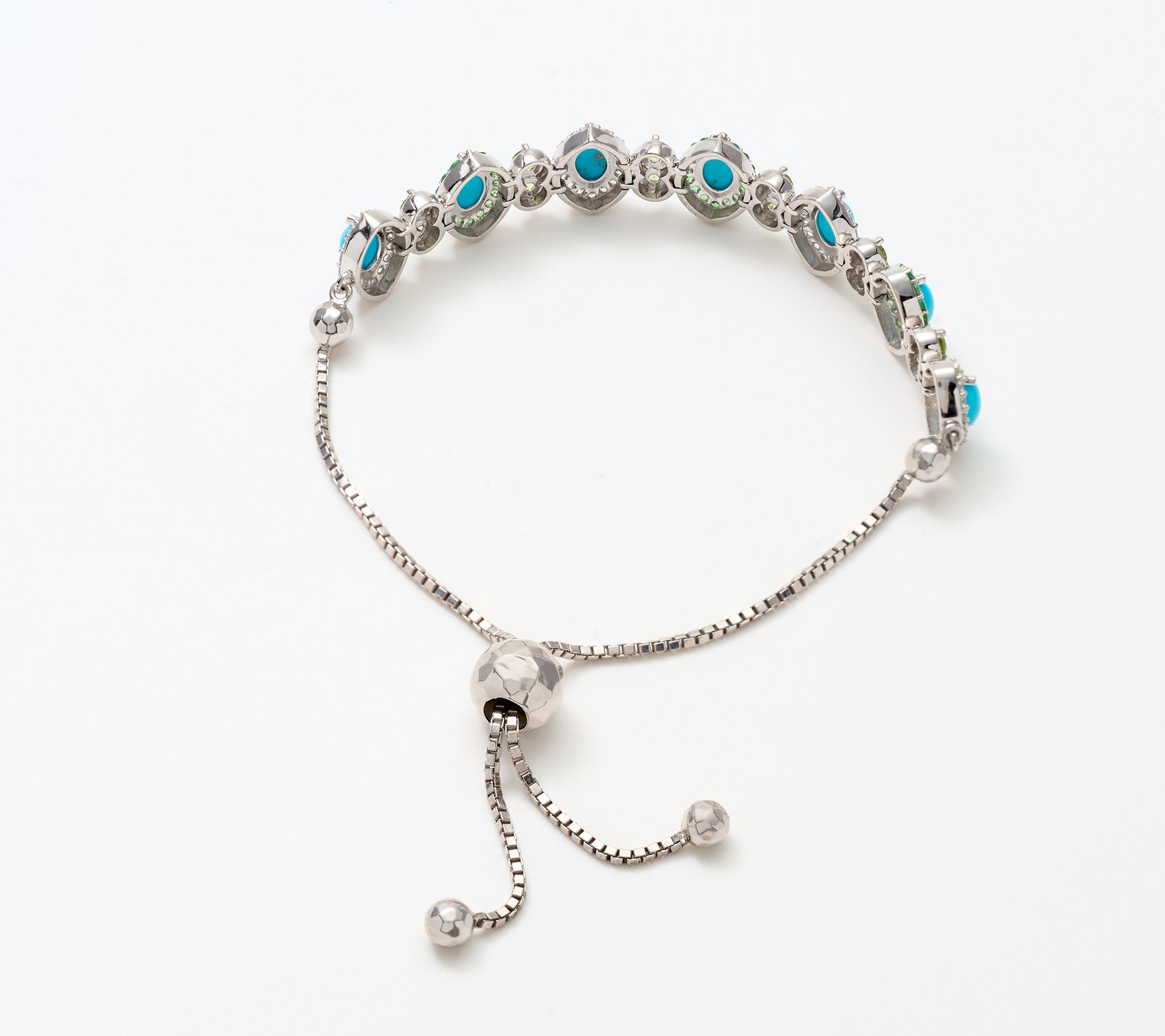 Radiant colors light up your wrist with this sterling silver bracelet, showcasing beautiful Sleeping Beauty turquoise, lively peridot, sparkling tsavorite, and white zircon. The easy-to-adjust bolo closure lets you customize your fit, making it just right for everyday style or dressier occasions. From Affinity® Gems.