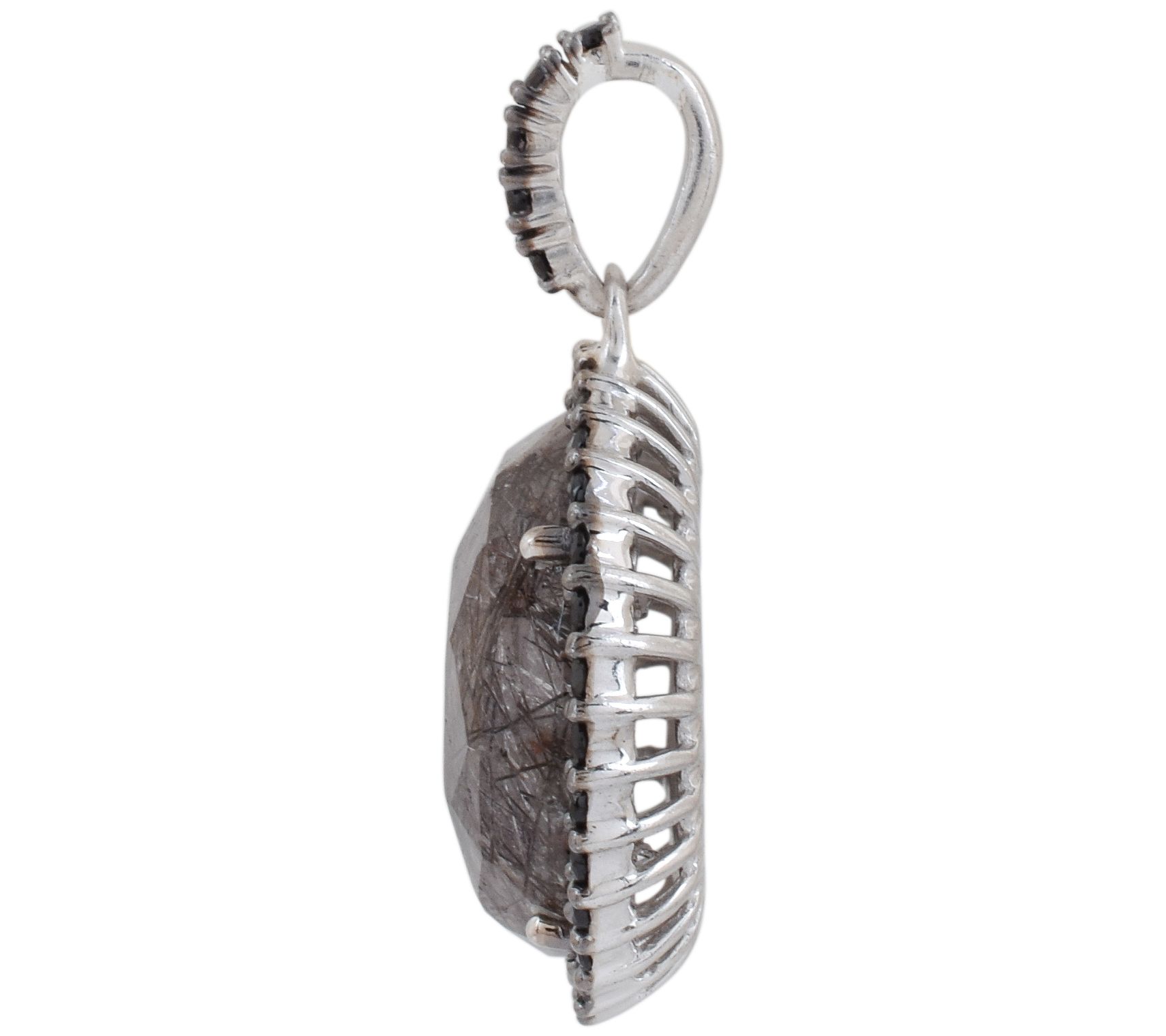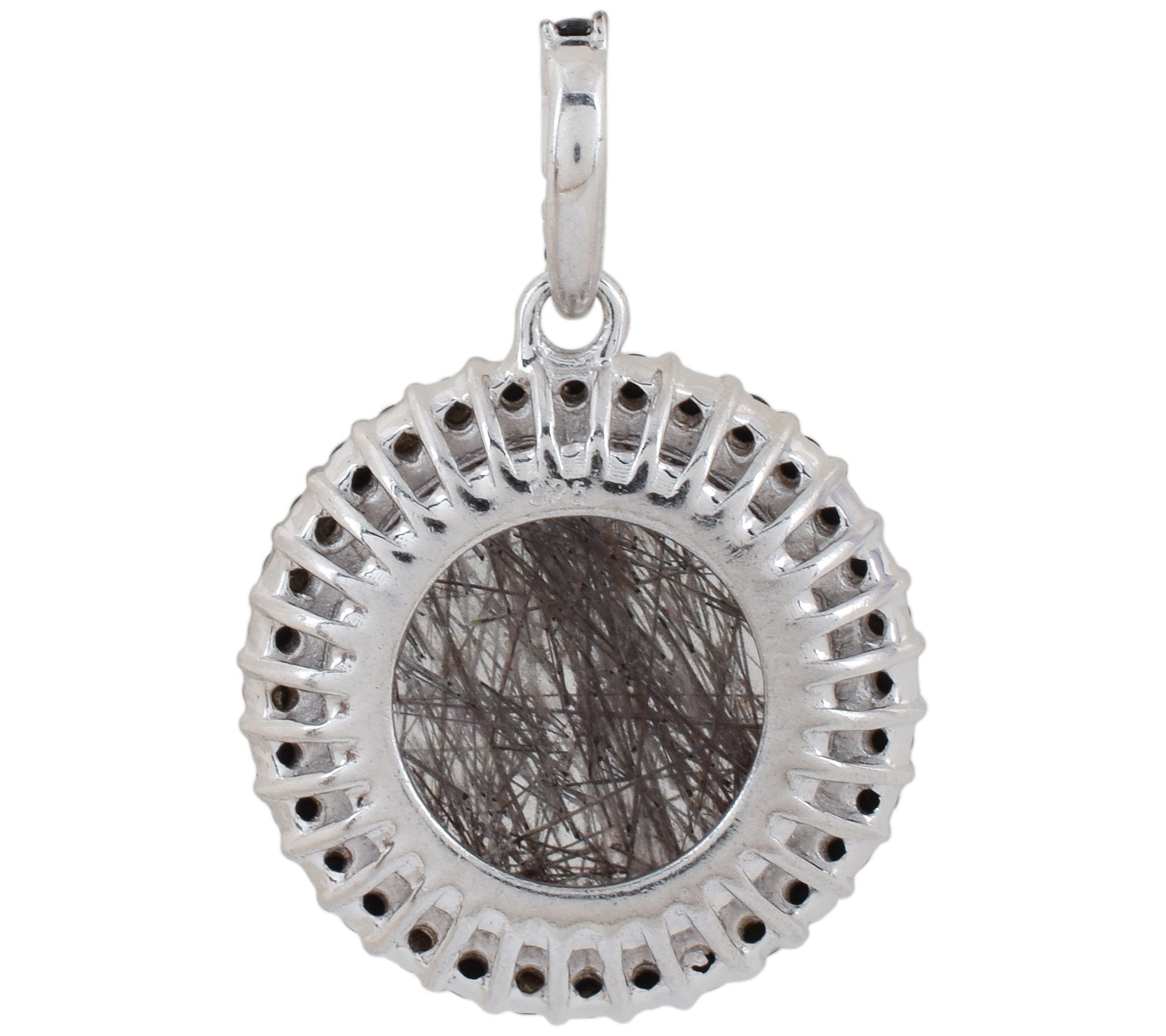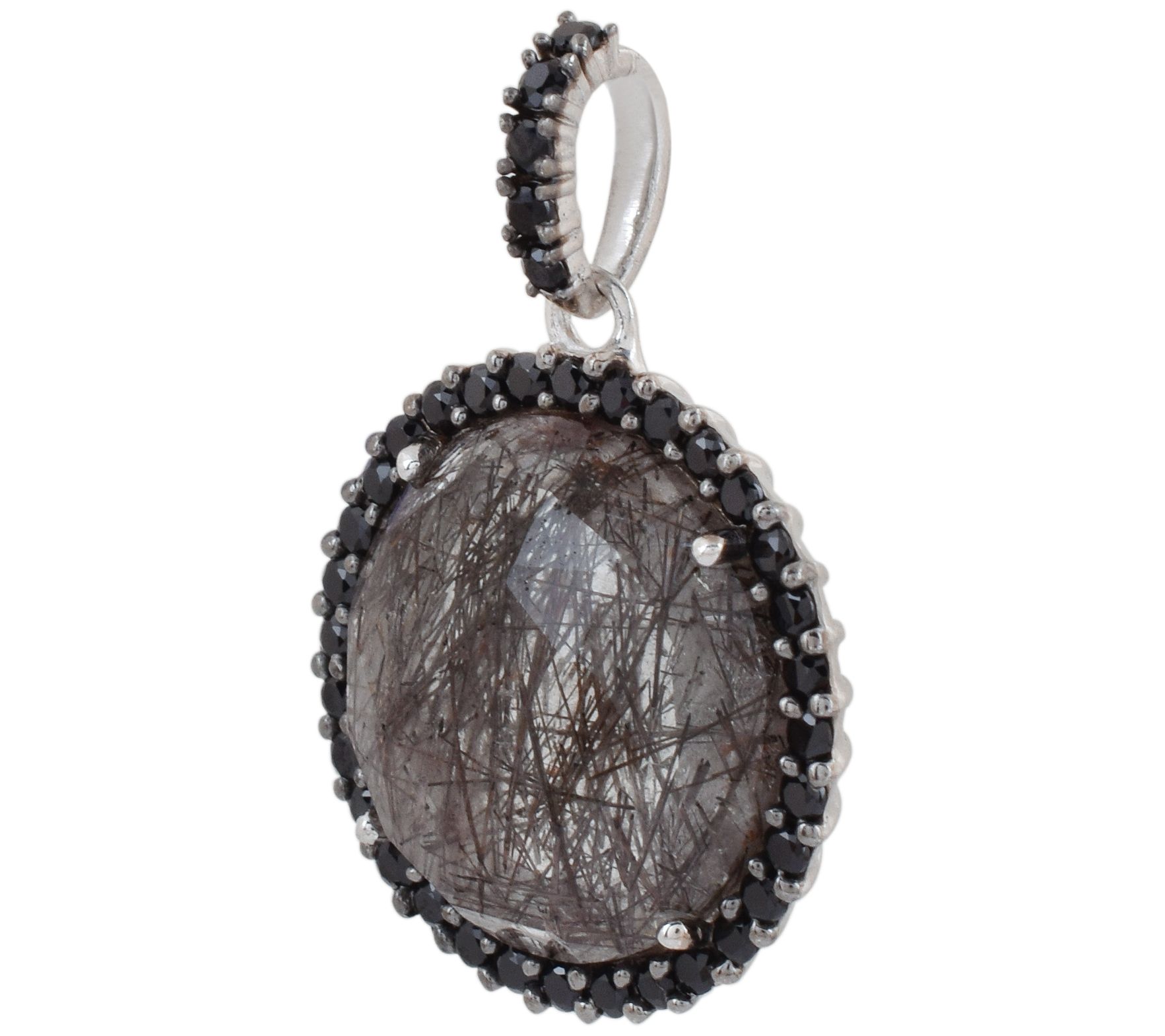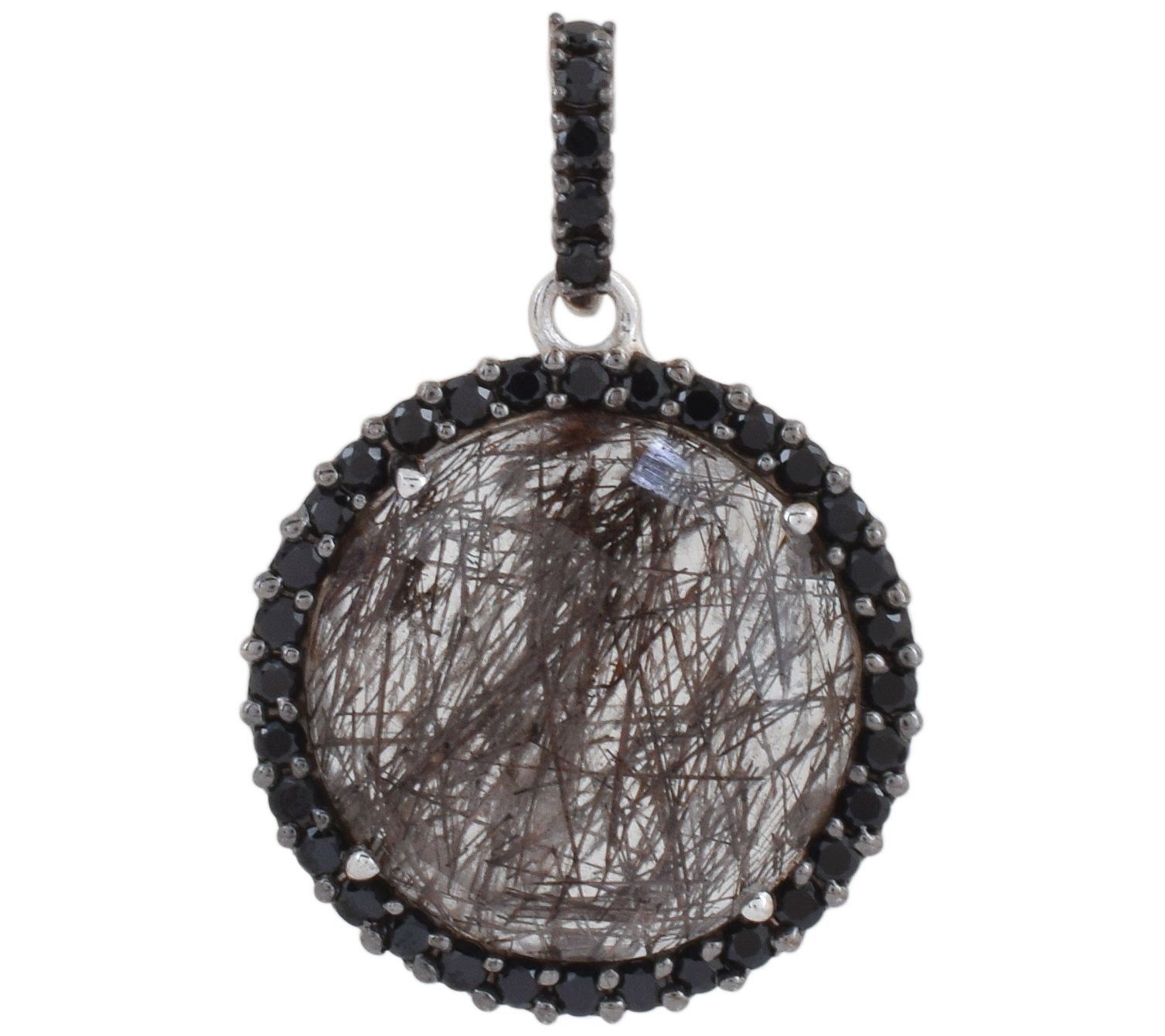 A striking rutile quartz crystal surrounded by tiny black spinel gems lends dramatic energy to this stunning round pendant. From Affinity Gems.