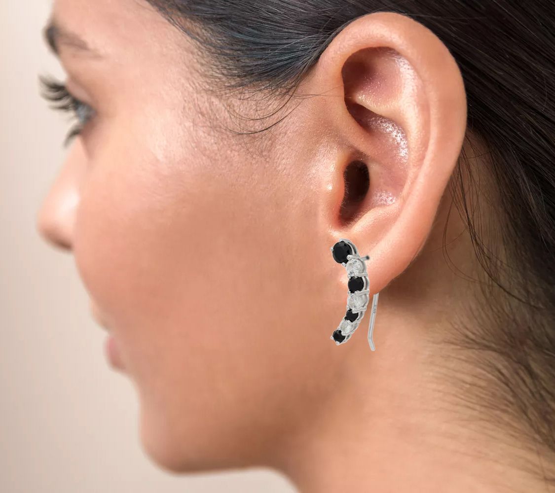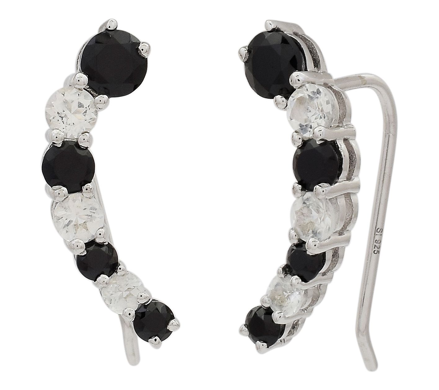 Black spinel and white topaz gemstones; round-cut; platinum-plated prong setting; ear climber style
