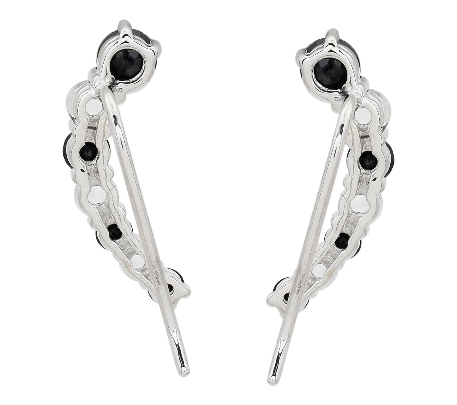 Dress up your everyday routine or make an evening memorable with these ear climber earrings featuring shimmering black spinel and white topaz. The sterling silver design, highlighted with a prong setting and platinum plating, brings a striking sparkle that hugs your ears for a modern yet timeless effect. From Affinity® Gems.