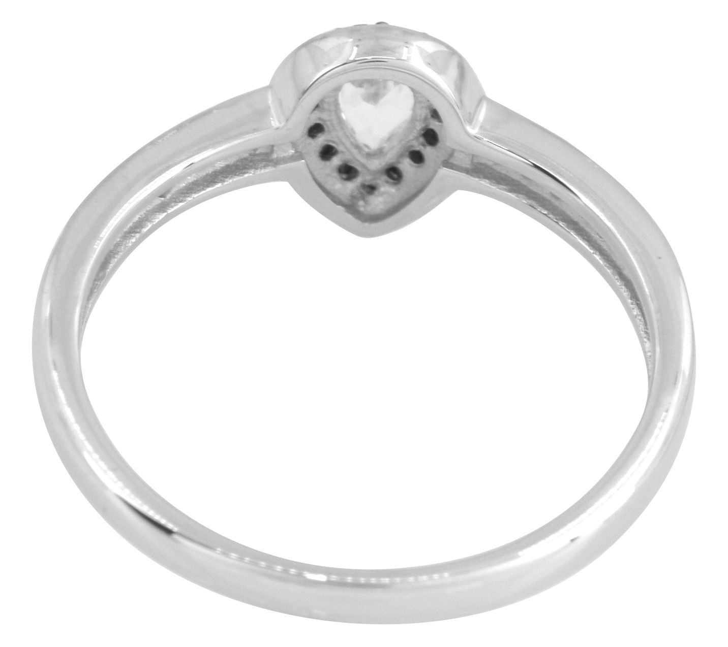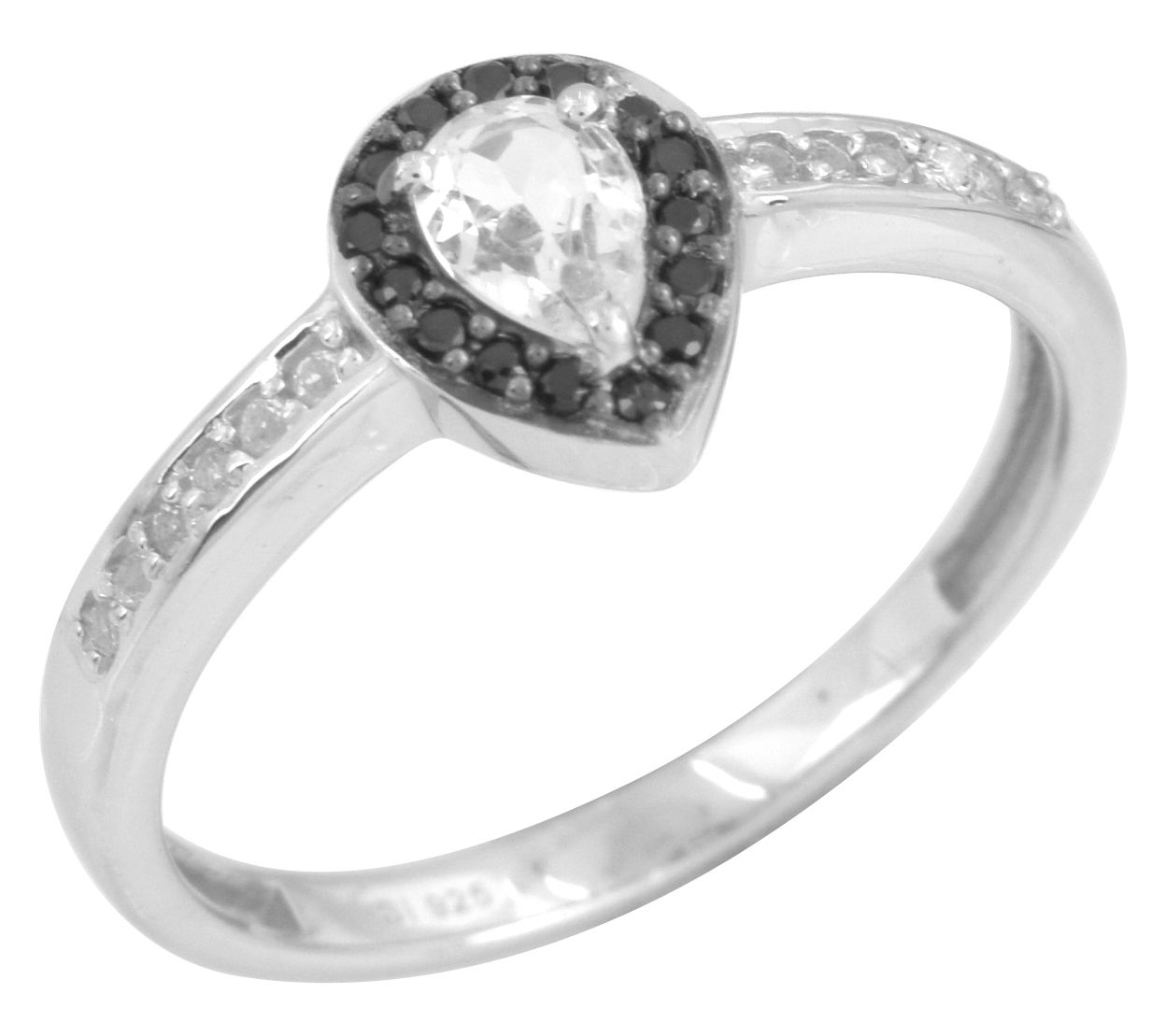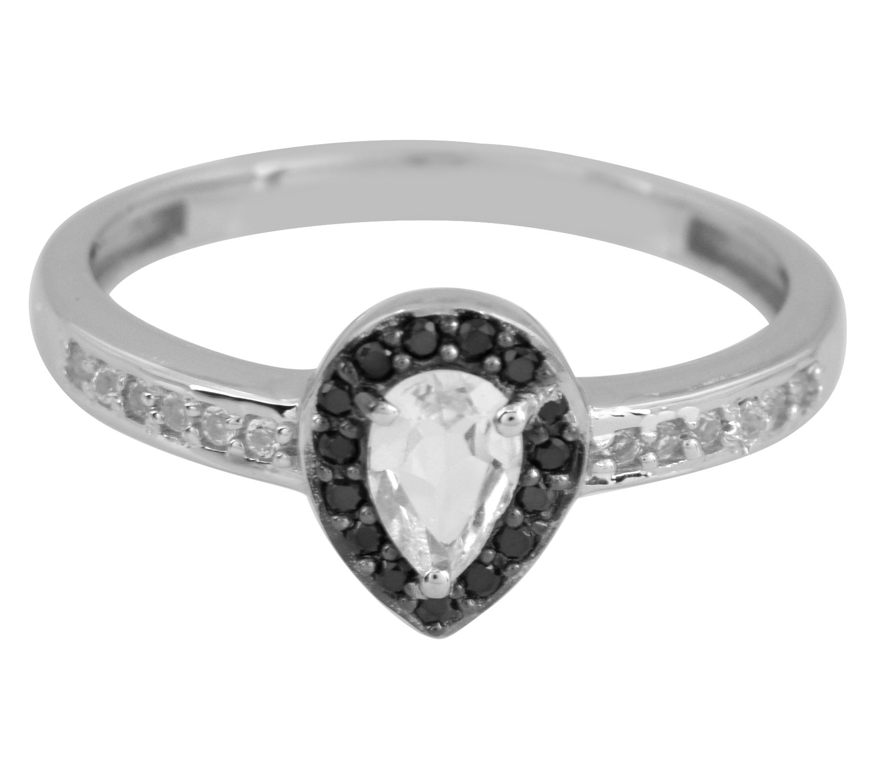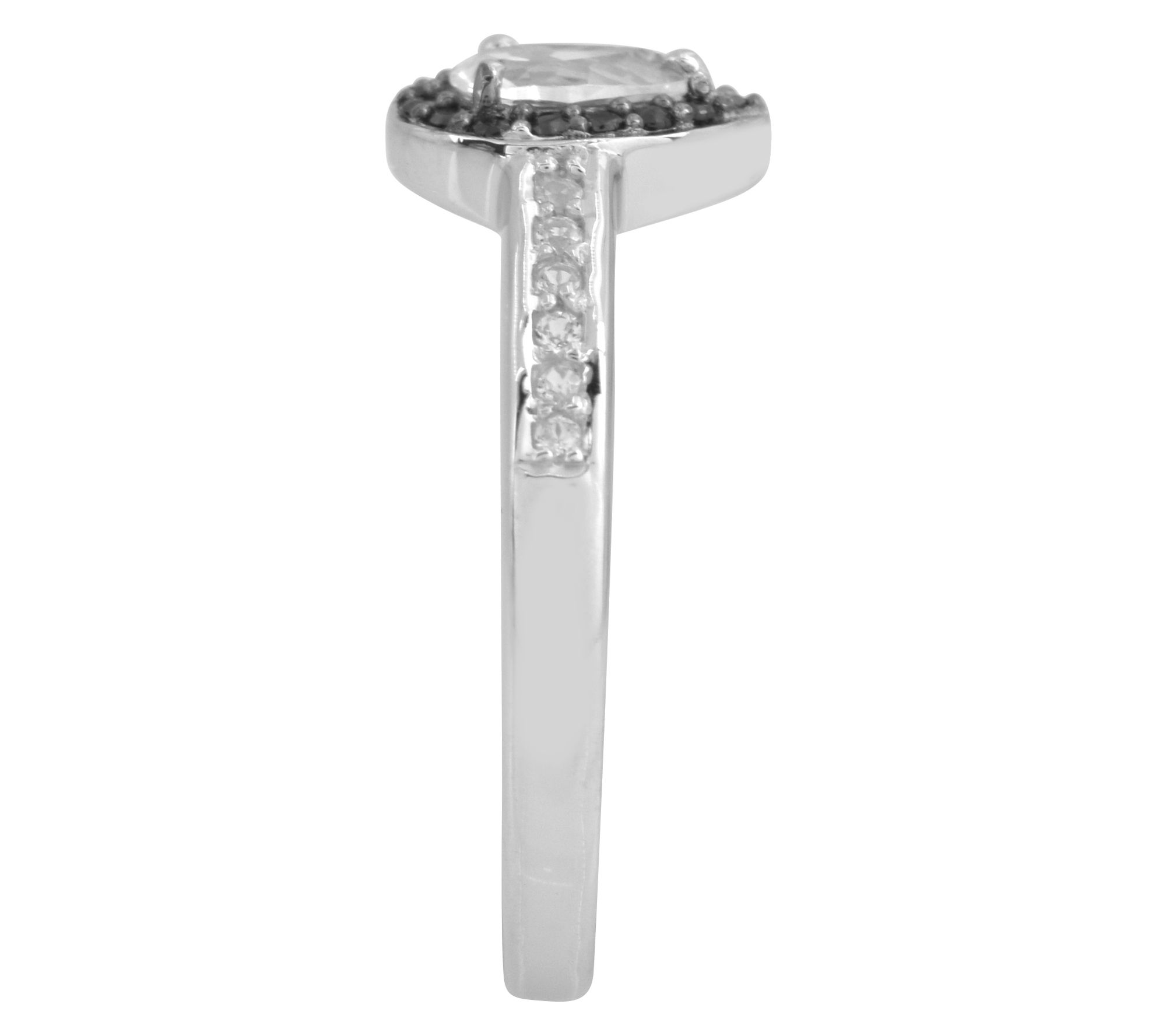 Pear-cut, prong-set white topaz gemstone; halo of round-cut, prong-set black spinel; round-cut, prong-set white topaz on shank; ruthenium and rhodium plating